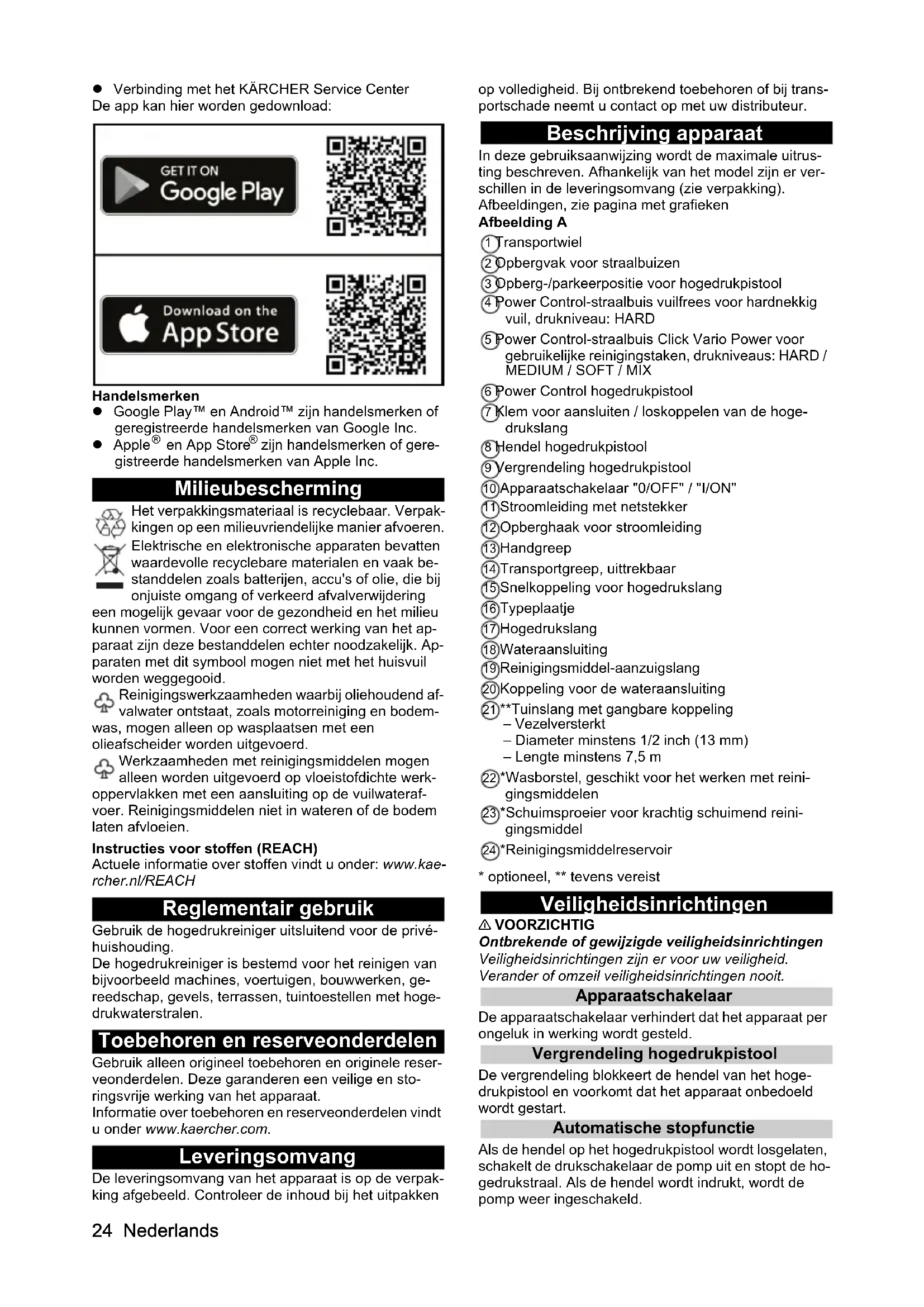zijn handelsmerken of gere- gistreerde handelsmerken van Apple Inc. Milieubescherming Het verpakkingsmateriaal is recyclebaar. Verpak- kingen op een milieuvriendelijke manier afvoeren. Elektrische en elektronische apparaten bevatten waardevolle recyclebare materialen en vaak be- standdelen zoals batterijen, accu's of olie, die bij onjuiste omgang of verkeerd afvalverwijdering een mogelijk gevaar voor de gezondheid en het milieu kunnen vormen. Voor een correct werking van het ap- paraat zijn deze bestanddelen echter noodzakelijk. Ap- paraten met dit symbool mogen niet met het huisvuil worden weggegooid. Reinigingswerkzaamheden waarbij oliehoudend af- valwater ontstaat, zoals motorreiniging en bodem- was, mogen alleen op wasplaatsen met een olieafscheider worden uitgevoerd. Werkzaamheden met reinigingsmiddelen mogen alleen worden uitgevoerd op vloeistofdichte werk- oppervlakken met een aansluiting op de vuilwateraf- voer. Reinigingsmiddelen niet in wateren of de bodem laten afvloeien. Instructies voor stoffen (REACH) Actuele informatie over stoffen vindt u onder: www.kae- rcher.nl/REACH Reglementair gebruik Gebruik de hogedrukreiniger uitsluitend voor de privé- huishouding. De hogedrukreiniger is bestemd voor het reinigen van bijvoorbeeld machines, voertuigen, bouwwerken, ge- reedschap, gevels, terrassen, tuintoestellen met hoge- drukwaterstralen. Toebehoren en reserveonderdelen Gebruik alleen origineel toebehoren en originele reser- veonderdelen. Deze garanderen een veilige en sto- ringsvrije werking van het apparaat. Informatie over toebehoren en reserveonderdelen vindt u onder www.kaercher.com. Leveringsomvang De leveringsomvang van het apparaat is op de verpak- king afgebeeld. Controleer de inhoud bij het uitpakken op volledigheid. Bij ontbrekend toebehoren of bij trans- portschade neemt u contact op met uw distributeur. Beschrijving apparaat In deze gebruiksaanwijzing wordt de maximale uitrus- ting beschreven. Afhankelijk van het model zijn er ver- schillen in de leveringsomvang (zie verpakking). Afbeeldingen, zie pagina met grafieken Afbeelding A 1 Transportwiel 2 Opbergvak voor straalbuizen 3 Opberg-/parkeerpositie voor hogedrukpistool 4 Power Control-straalbuis vuilfrees voor hardnekkig vuil, drukniveau: HARD 5 Power Control-straalbuis Click Vario Power voor gebruikelijke reinigingstaken, drukniveaus: HARD /