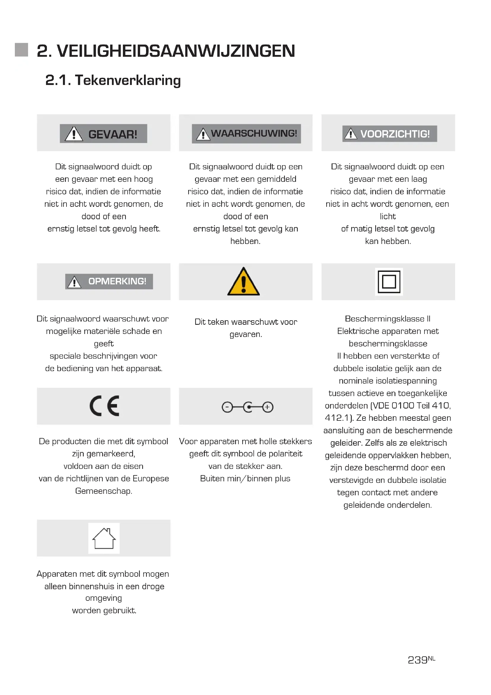 Dit signaalwoord duidt opeen gevaar met een hoogrisico dat, indien de informatieniet in acht wordt genomen, de dood of eenernstig letsel tot gevolg heeft.Dit signaalwoord waarschuwt voormogelijke materiële schade en geeftspeciale beschrijvingen voorde bediening van het apparaat.Dit signaalwoord duidt op eengevaar met een gemiddeldrisico dat, indien de informatieniet in acht wordt genomen, de dood of eenernstig letsel tot gevolg kan hebben.Dit teken waarschuwt voor gevaren.Dit signaalwoord duidt op eengevaar met een laagrisico dat, indien de informatieniet in acht wordt genomen, een lichtof matig letsel tot gevolgkan hebben.Beschermingsklasse IIElektrische apparaten met beschermingsklasseII hebben een versterkte ofdubbele isolatie gelijk aan denominale isolatiespanningtussen actieve en toegankelijkeonderdelen (VDE 0100 Teil 410, 412.1). Ze hebben meestal geen aansluiting aan de beschermende geleider. Zelfs als ze elektrisch geleidende oppervlakken hebben, zijn deze beschermd door een verstevigde en dubbele isolatie tegen contact met anderegeleidende onderdelen. 2.1. Tekenverklaring De producten die met dit symbool zijn gemarkeerd,voldoen aan de eisenvan de richtlijnen van de EuropeseGemeenschap.Voor apparaten met holle stekkers geeft dit symbool de polariteitvan de stekker aan.Buiten min/binnen plusApparaten met dit symbool mogenalleen binnenshuis in een droge omgevingworden gebruikt.240