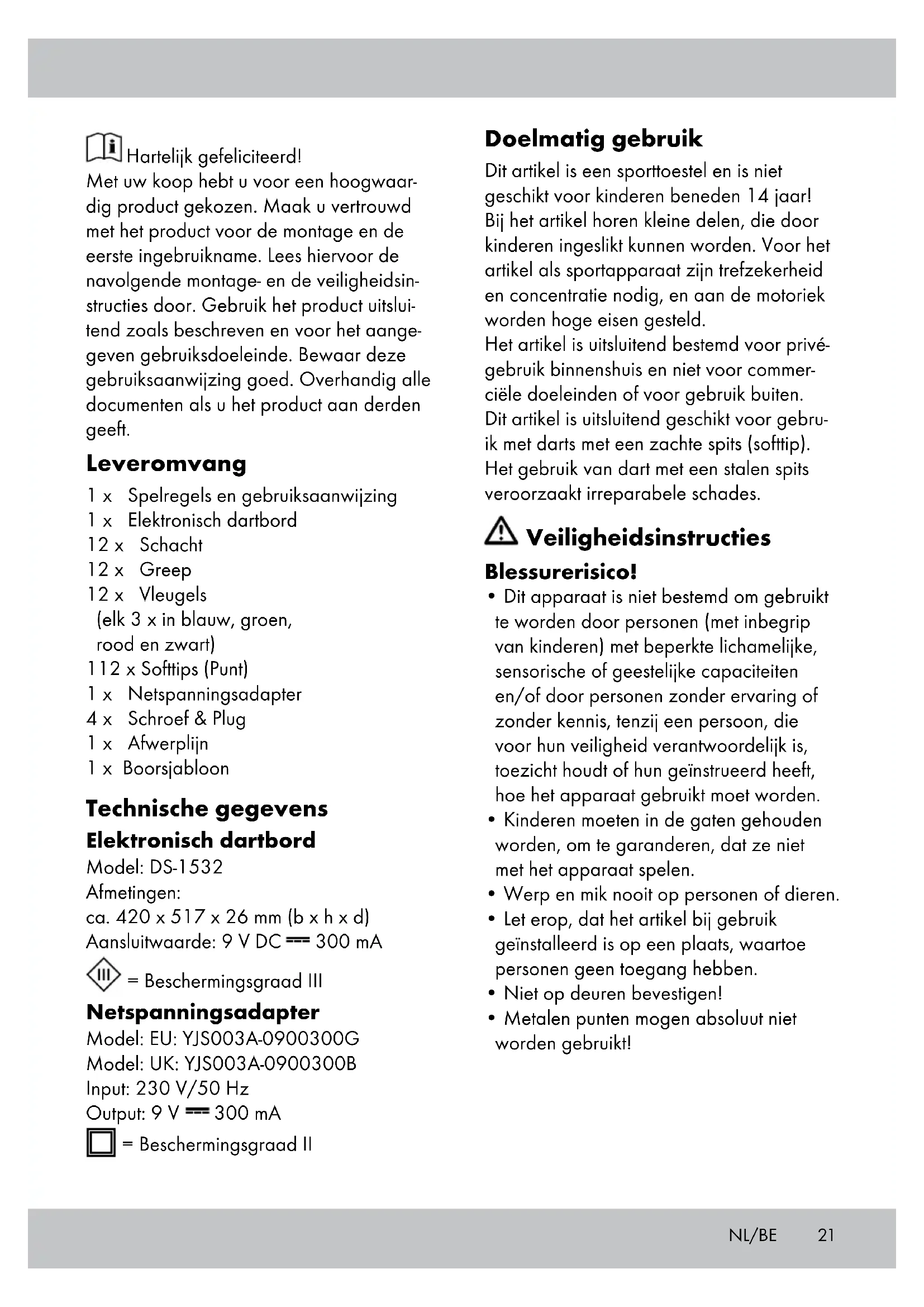 - Gebruik de netspanningsadapter alleen in combinatie met de Dartboard DS-1532.