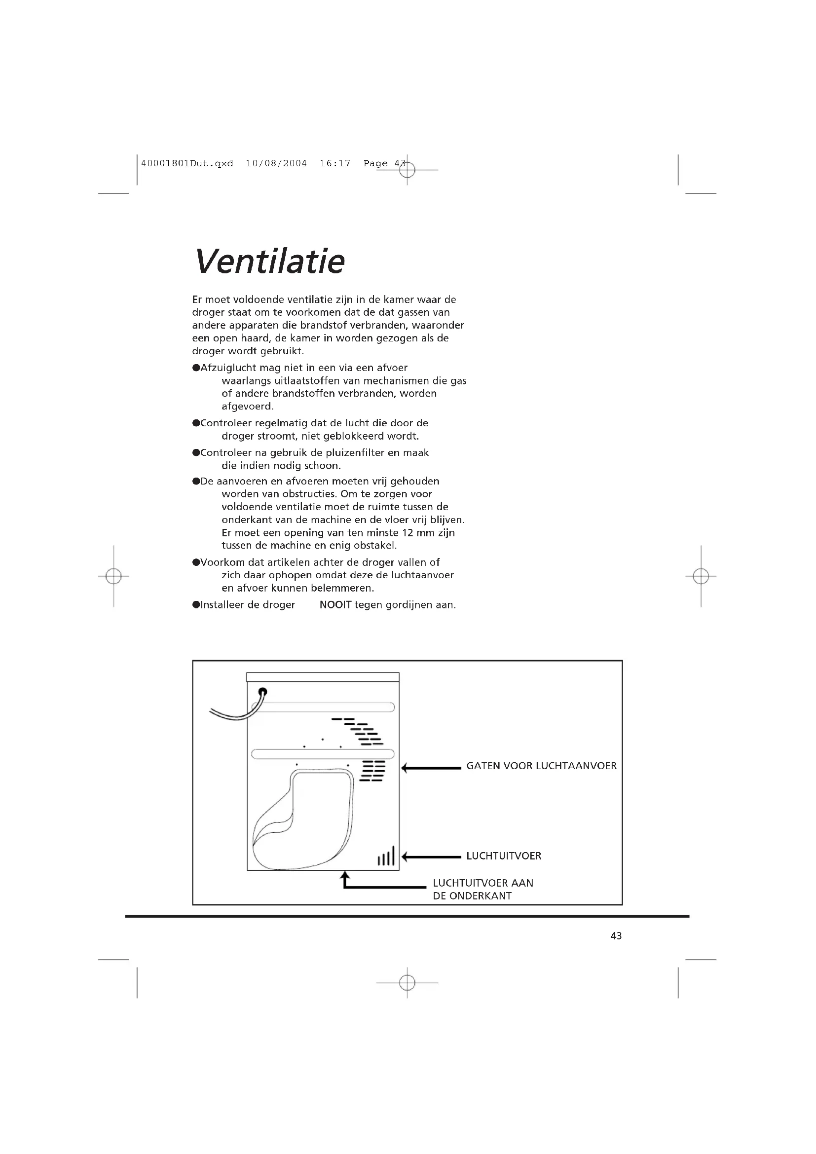IInnddiieenn hheett pprroobblleeeemm mmeett uuww mmaacchhiinnee wwoorrddtt vveerroooorrzzaaaakktt ddoooorr eeeenn vveerrkkeeeerrddee iinnssttaallllaattiiee,, kkuunnnneenn ddee kkoosstteenn vvaann ddee oonnddeerrhhoouuddssbbeeuurrtt aaaann uu wwoorrddeenn ddoooorrbbeerreekkeenndd.. AAllss ddee ssttrroooommkkaabbeell vvaann hheett ttooeesstteell bbeesscchhaaddiiggdd iiss,, ddaann mmooeett hhiijj vveerrvvaannggeenn wwoorrddeenn ddoooorr eeeenn ssppeecciiaaaall ssnnooeerr ddaatt AALLLLEEEENN bbiijj ddee ddiieennsstt RReesseerrvveeoonnddeelleenn vvaann HHoooovveerr vveerrkkrriijjggbbaaaarr iiss.. DDee kkaabbeell mmooeett ddoooorr eeeenn bbeekkwwaaaamm ppeerrssoooonn wwoorrddeenn ggeeïïnnssttaalllleeeerrdd.. IInnssttaallllaattiiee SSlluuiitt ddee mmaacchhiinnee nniieett aaaann eenn ssttaarrtt ddeezzee nniieett vvoooorrddaatt ddee iinnssttaallllaattiiee iiss vvoollttooooiidd.. VVoooorr uuww vveeiilliigghheeiidd mmooeett ddeezzee ddrrooggeerr oopp ddee jjuuiissttee mmaanniieerr wwoorrddeenn ggeeïïnnssttaalllleeeerrdd.. AAllss eerr ooookk mmaaaarr eenniiggee ttwwiijjffeell bbeessttaaaatt oovveerr ddee iinnssttaallllaattiiee,, bbeell ddaann ddee GGIIAASS--SSeerrvviiccee vvoooorr aaddvviieess.. 40001801Dut.qxd 10/08/2004 16:17 Page 42Er moet voldoende ventilatie zijn in de kamer waar de droger staat om te voorkomen dat de dat gassen van andere apparaten die brandstof verbranden, waaronder een open haard, de kamer in worden gezogen als de droger wordt gebruikt. ● Afzuiglucht mag niet in een via een afvoer waarlangs uitlaatstoffen van mechanismen die gas of andere brandstoffen verbranden, worden afgevoerd. ● Controleer regelmatig dat de lucht die door de droger stroomt, niet geblokkeerd wordt. ● Controleer na gebruik de pluizenfilter en maak die indien nodig schoon. ● De aanvoeren en afvoeren moeten vrij gehouden worden van obstructies. Om te zorgen voor voldoende ventilatie moet de ruimte tussen de onderkant van de machine en de vloer vrij blijven. Er moet een opening van ten minste 12 mm zijn tussen de machine en enig obstakel. ● Voorkom dat artikelen achter de droger vallen of zich daar ophopen omdat deze de luchtaanvoer en afvoer kunnen belemmeren. ● Installeer de droger NNOOOOIITT tegen gordijnen aan.