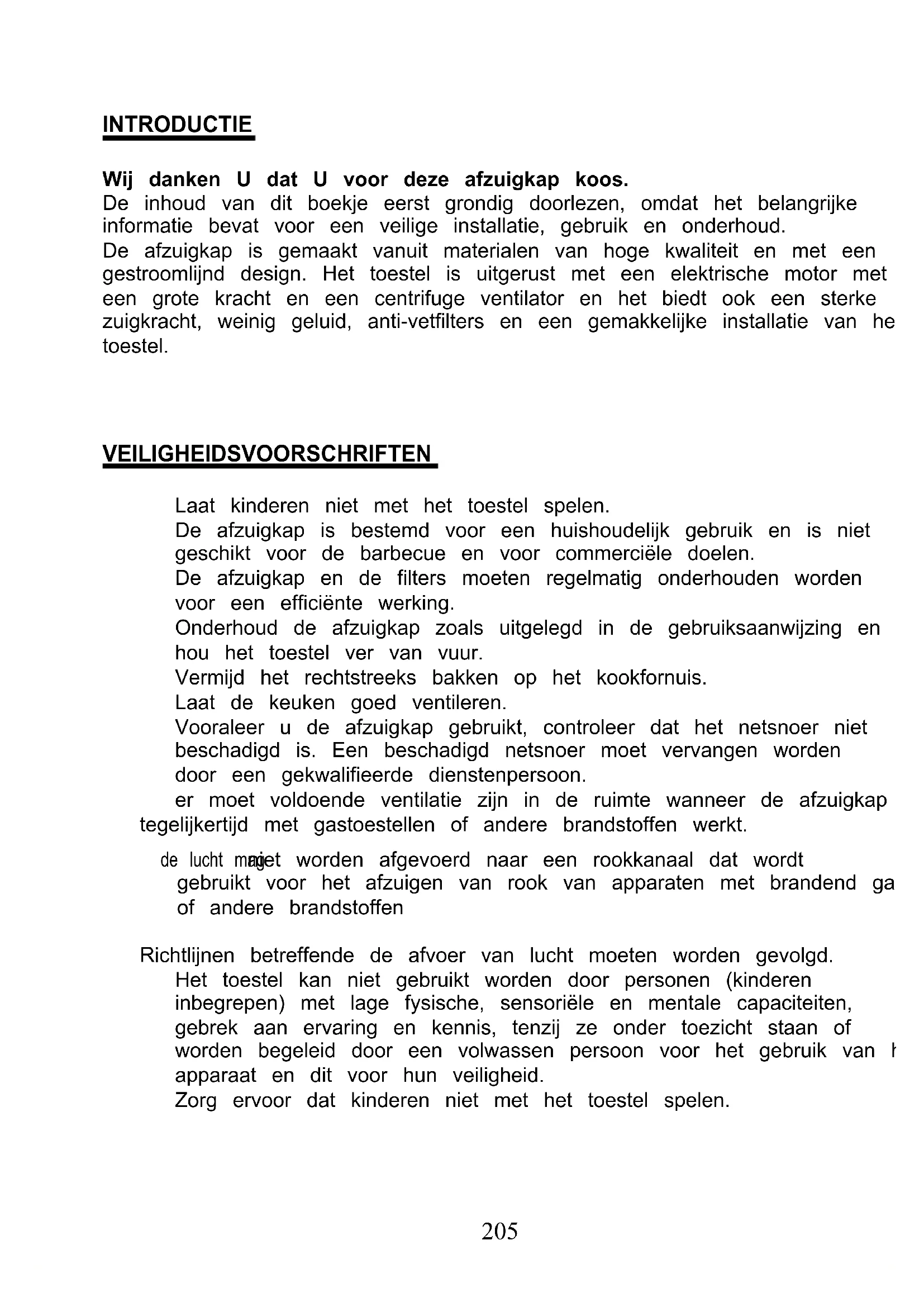 204INTRODUCTIE Wij danken U dat U voor deze afzuigkap koos. De inhoud van dit boekje eerst grondig doorlezen, omdat het belangrijke informatie bevat voor een veilige installatie, gebruik en onderhoud. De afzuigkap is gemaakt vanuit materialen van hoge kwaliteit en met een gestroomlijnd design. Het toestel is uitgerust met een elektrische motor met een grote kracht en een centrifuge ventilator en het biedt ook een sterke zuigkracht, weinig geluid, anti-vetfilters en een gemakkelijke installatie van het toestel. VEILIGHEIDSVOORSCHRIFTEN Laat kinderen niet met het toestel spelen. De afzuigkap is bestemd voor een huishoudelijk gebruik en is niet geschikt voor de barbecue en voor commerciële doelen. De afzuigkap en de filters moeten regelmatig onderhouden worden voor een efficiënte werking. Onderhoud de afzuigkap zoals uitgelegd in de gebruiksaanwijzing en hou het toestel ver van vuur. Vermijd het rechtstreeks bakken op het kookfornuis. Laat de keuken goed ventileren. Vooraleer u de afzuigkap gebruikt, controleer dat het netsnoer niet beschadigd is. Een beschadigd netsnoer moet vervangen worden door een gekwalifieerde dienstenpersoon. er moet voldoende ventilatie zijn in de ruimte wanneer de afzuigkap tegelijkertijd met gastoestellen of andere brandstoffen werkt. de lucht mag niet worden afgevoerd naar een rookkanaal dat wordt gebruikt voor het afzuigen van rook van apparaten met brandend gas of andere brandstoffen Richtlijnen betreffende de afvoer van lucht moeten worden gevolgd. Het toestel kan niet gebruikt worden door personen (kinderen inbegrepen) met lage fysische, sensoriële en mentale capaciteiten, gebrek aan ervaring en kennis, tenzij ze onder toezicht staan of worden begeleid door een volwassen persoon voor het gebruik van het apparaat en dit voor hun veiligheid. Zorg ervoor dat kinderen niet met het toestel spelen.