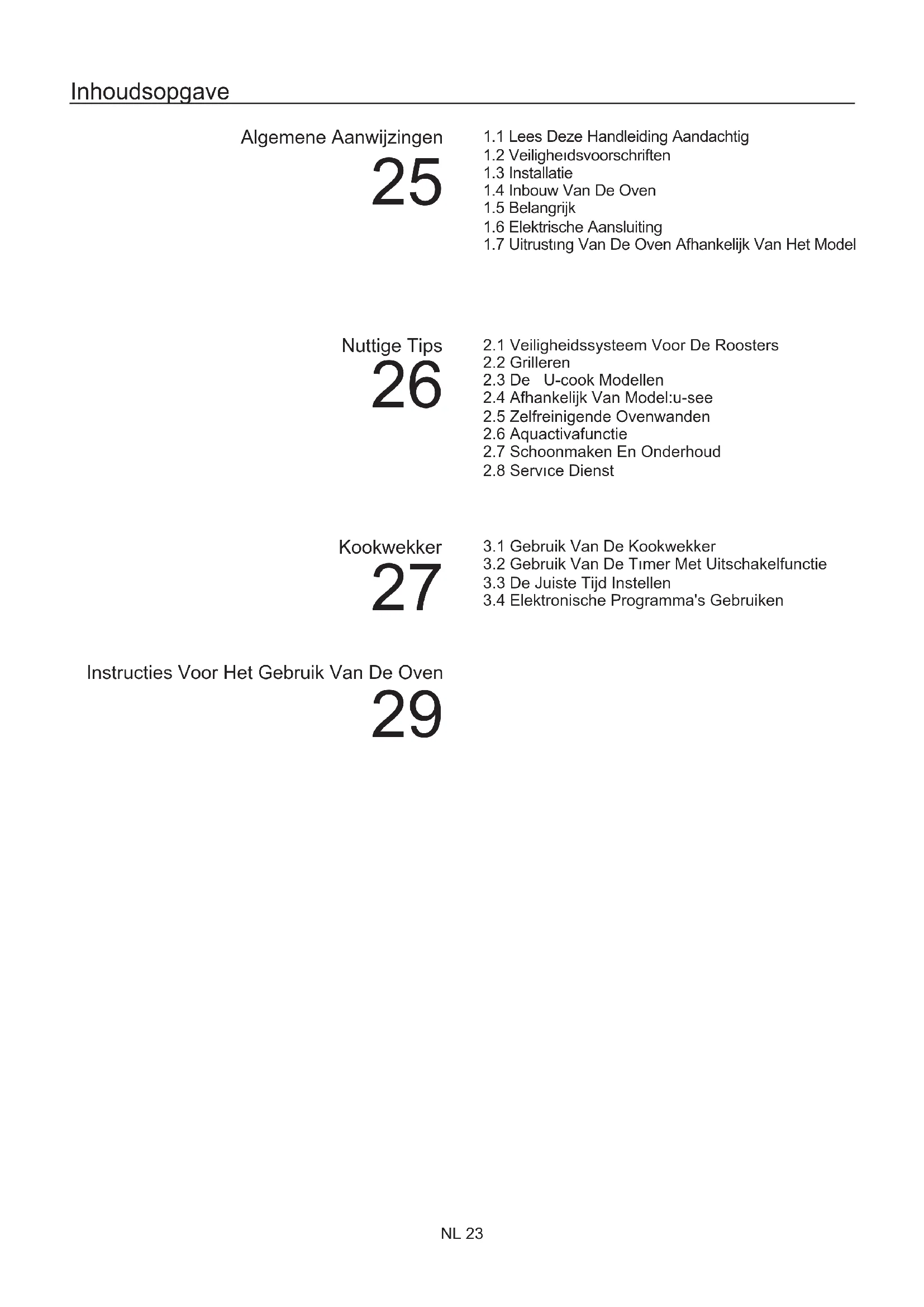 Alvorens u de Service Dienst belt Indien de oven niet werkt, raden wij u aan: — na te gaan of het apparaat goed is aangesloten. Indien u de oorzaak niet kunt ontdekken: — haal de stekker uit het stopcontact of sluit de elektriciteit van de oven af middels de hoofdschakelaar — gebruik de oven niet meer en ga er niet zelf aan sleutelen — bel de Service Dienst Noteert u, voordat u de Service Dienst belt, het typenummer van uw oven (zie binnenzijde van de ovendeur) Bij de oven zit een garantiecertificaat, welke u recht geeft op één jaar garantie vanaf de datum van aankoop. U stelt de kookwekker in door deze eerst een maal compleet om te draaien (met de klok mee). Draai de schakelaar vervolgens terug naar de gewenste positie/tijd. Zodra de ingestelde tijd is overschreden, gaat er gedurende enkele seconden een geluidssignaal .