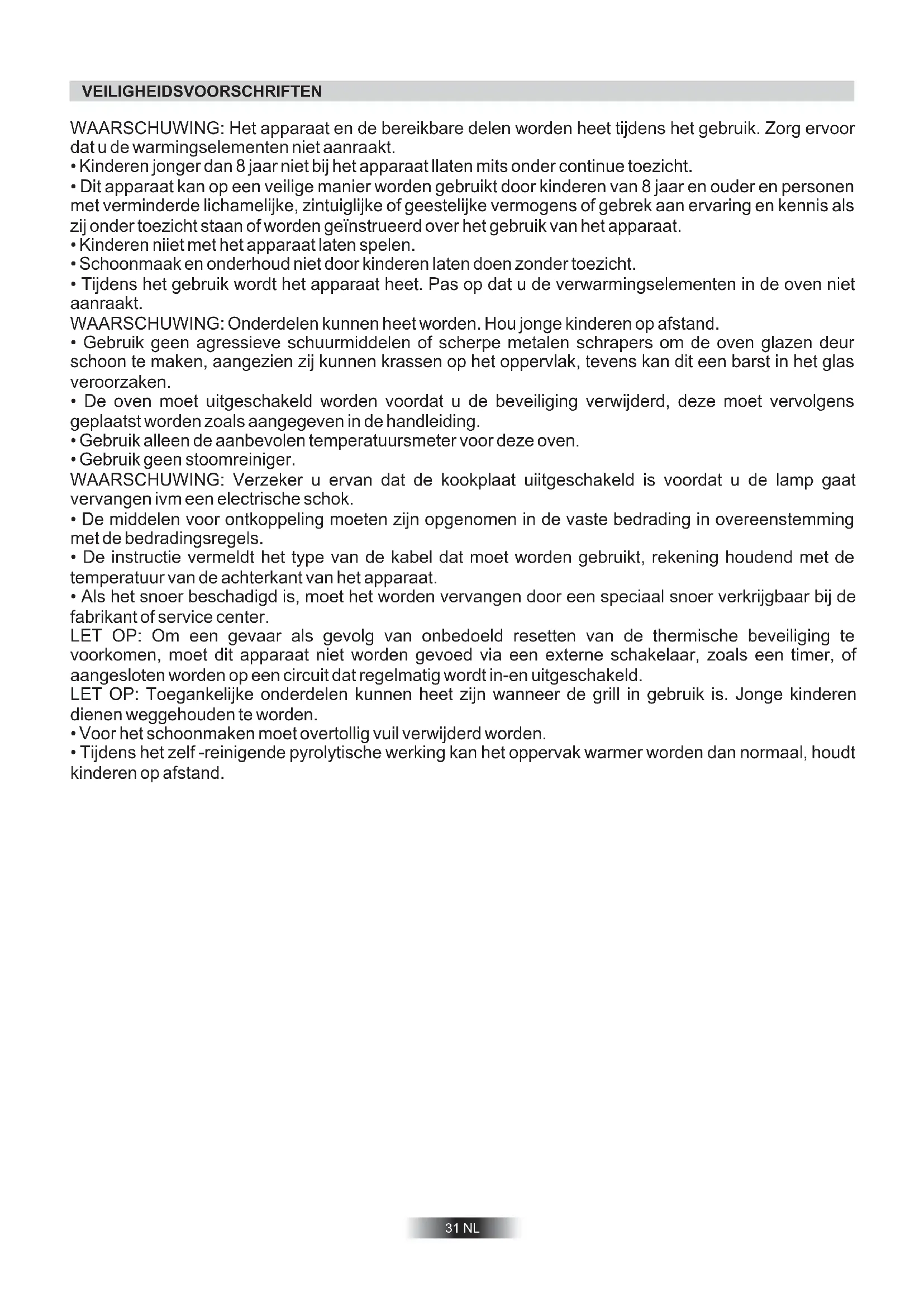 - Tijdens het zelf -reinigende pyrolytische werking kan het oppervak warmer worden dan normaal, houdt kinderen op afstand.ALGEMENE AANWIJZINGEN Lees deze handleiding aandachtig. Hierin treff u betangrijke gegevens aan omtrent installatie, gebruik en onderhoud. Bewaar deze handleiding voor eventuele toekomstige raadpleging. De eerste keer dat de oven in werking wordt gesteld, kan er een stinkende walm vrijkomen. Dit is te wijten aan de eerste verhitting van de lijm op de isolatiepanelen rond de oven. Dit is volkomen normaal. Wij raden u aan uw oven eerst een half uur op vol vermogen aan te zetten om deze walm uit de oven te verwijderen. Wacht u tot de walm verdwijnt, alvorens u het voedsel in de oven plaatst. Bij een ingeschakelde oven wordt het glas van de deur behoorlijk warm. De onderdelen, die in contact komen met voedsel voldoen aan de EEC richtlijn 89/109. Dit apparaat voldoet aan de Europese Richtlijnen 73/23/EEC en 89/336/EEC, vervangen door 2006/95/EC and 2004/108/EC en eventuele wijzigingen Verzeker u ervan dat de oven niet is beschadigd. Indien u hieraan twijfelt, dient u de oven niet te gebruiken en direct contact op te nemen met de leverancier. Houdt u het verpakkingsmateriaal van de oven (plastic zakjes, piepschuim en karton) uit de buurt van kinderen. Dit materiaal kan een gevaar opleveren voor kinderen. Steek de stekker in een correct geïnstalleerd geaard stopcontact. Bij modellen zonder stekker dient met een standaardstekker aan te brengen, die geschikt is voor het op het typeplaatje vermelde vermogen. De aarddraad is geel/groen. Deze verbinding dient door een technisch bevoegd persoon uitgevoerd te worden. Indien het stopcontact en de stekker niet op elkaar afgestemd zijn, laat dan een technisch bevoegd persoon een ander stopcontact installeren. Deze dient ook na te gaan of de draaddoor- snede van het stopcontact geschikt is voor het door het apparaat opgenomen vermogen. Aansluiting kan ook plaatsvinden door een geschikte meerpolige (aan/uit) schakelaar te plaatsen tussen het elektrische net en het apparaat, die aan de geldende normen voldoet. Zorg ervoor dat de (geel/groen) geaarde kabel de schakelaar niet raakt. Het stopcontact of de meerpolige schakelaar dienen op een gemakkelijk toegankelijke plaats bij de oven gemonteerd te worden. Belangrijk: Zorg er bij de installatie voor dat de voedingskabel nergens warmer kan worden dan 50°C. De oven voldoet aan de veiligheidseisen als voorzien in de normen van de desbetreffende instituten. De elektrische veiligheid wordt uitsluitend gegarandeerd indien het apparaart op de juiste wijze met een doelmatige aardingsinstallatie is verbonden ingevolge de huidige normen m.b.t. elektrische veiligheid. Ga na of aan deze fundamentele veiligheidseis is voldaan en laat de installatie, ingeval van twijfel, grondig nakijken door een installateur. Ga na of het elektrische vermogen van de stopcontacten overeenkomt met het maximum vermogen van het apparaat, zoals is aangegeven op het typeplaatje. Haal er, in geval van twijfel, een technisch bevoegd persoon bij. De fabrikant is niet verantwoordelijk voor eventuele persoonlijke of materiële schade als gevolg van de nietaarding van de installatie. ATTENTIE: De spanning en energieverbruik staan vermeld op de modelsticker (laatste pagina). ELEKTRISCHE AANSLUITING