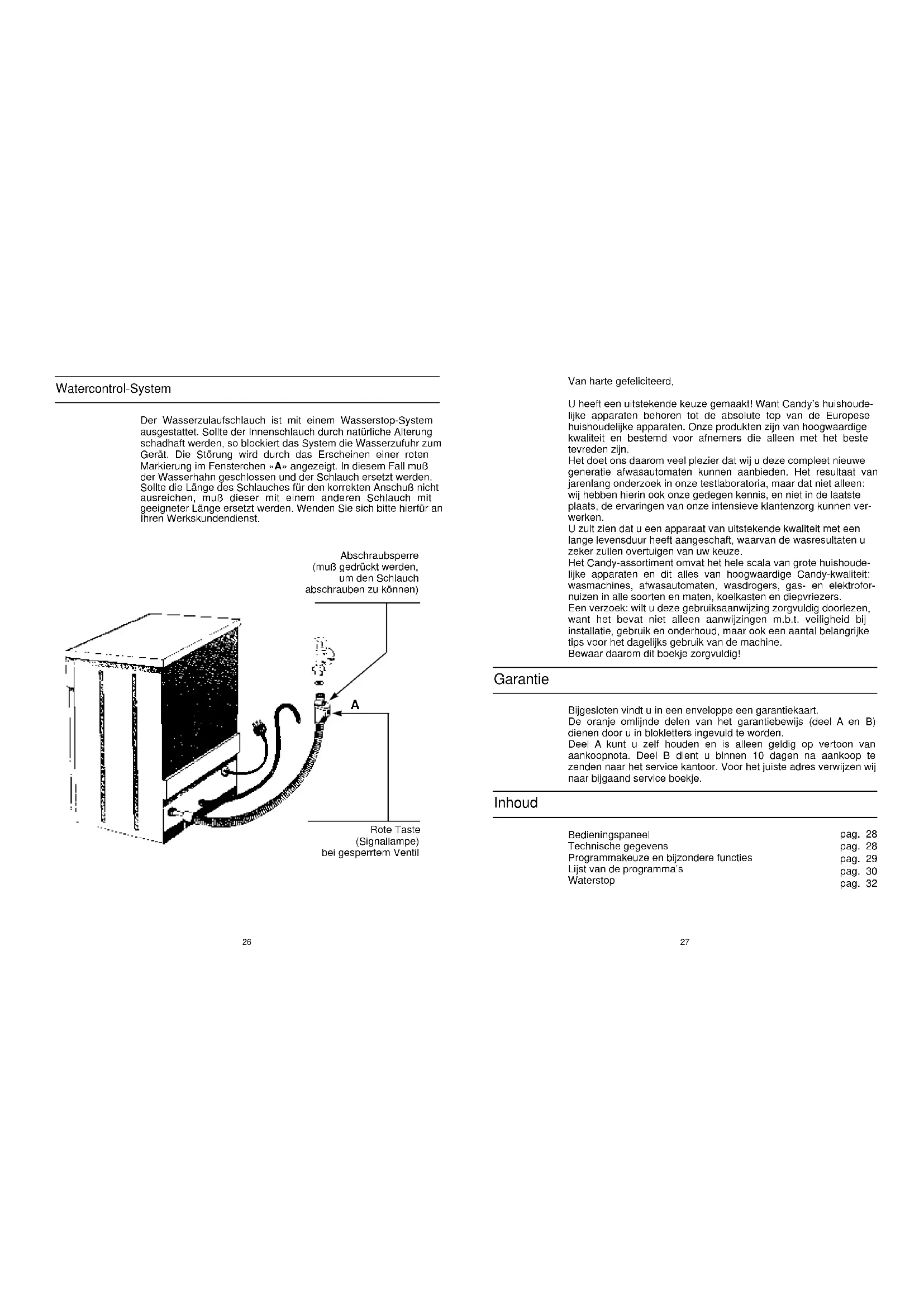 Van harte gefeliciteerd, U heeft een uitstekende keuze gemaakt! Want Candy’s huishoude- lijke apparaten behoren tot de absolute top van de Europese huishoudelijke apparaten. Onze produkten zijn van hoogwaardige kwaliteit en bestemd voor afnemers die alleen met het beste tevreden zijn. Het doet ons daarom veel plezier dat wij u deze compleet nieuwe generatie afwasautomaten kunnen aanbieden. Het resultaat van jarenlang onderzoek in onze testlaboratoria, maar dat niet alleen: wij hebben hierin ook onze gedegen kennis, en niet in de laatste plaats, de ervaringen van onze intensieve klantenzorg kunnen ver- werken. U zult zien dat u een apparaat van uitstekende kwaliteit met een lange levensduur heeft aangeschaft, waarvan de wasresultaten u zeker zullen overtuigen van uw keuze. Het Candy-assortiment omvat het hele scala van grote huishoude- lijke apparaten en dit alles van hoogwaardige Candy-kwaliteit: wasmachines, afwasautomaten, wasdrogers, gas- en elektrofor- nuizen in alle soorten en maten, koelkasten en diepvriezers. Een verzoek: wilt u deze gebruiksaanwijzing zorgvuldig doorlezen, want het bevat niet alleen aanwijzingen m.b.t. veiligheid bij installatie, gebruik en onderhoud, maar ook een aantal belangrijke tips voor het dagelijks gebruik van de machine. Bewaar daarom dit boekje zorgvuldig! Bijgesloten vindt u in een enveloppe een garantiekaart. De oranje omlijnde delen van het garantiebewijs (deel A en B) dienen door u in blokletters ingevuld te worden. Deel A kunt u zelf houden en is alleen geldig op vertoon van aankoopnota. Deel B dient u binnen 10 dagen na aankoop te zenden naar het service kantoor. Voor het juiste adres verwijzen wij naar bijgaand service boekje. Bedieningspaneel Technische gegevens Programmakeuze en bijzondere functies Lijst van de programma’s Waterstop pag. 28 pag. 28 pag. 29 pag. 30 pag. 32 Garantie Inhoud29 Attentie Deze vaatwasser is uitgevoerd met een “waterblock”, dit is een beveiliging tegen overstroming. Deze beveiliging werkt zelfs wanneer de machine is uitgeschakeld, en stopt de watertoevoer als het nivo te hoog wordt door een eventuele storing. Belangrijk Om te voorkomen dat deze beveiliging onbedoeld in werking treed is het aanbevolen de machine niet te verplaatsen of op te tillen terwijl deze in werking is. Als het nodig is de machine te verplaatsen of op te tillen wacht dan tot het wasprogramma is afgelopen en het water uit de kuip is afgepompt. Om een programma in te stellen draait u de knop met de klok mee tot de wijzer het symbool van het gevraagde programma aangeeft, en drukt u vervolgens op de Aan-Uit knop. Controleer of de waterkraan open staat en de deur goed dicht zit. “70°C” toets Deze toets is een optie, beschikbaar op het UNIVERSEEL INTENSIEF 70°C en het DAGELIJK-INTENSIEF 70°C programma. Hierdoor wordt de temperatuur van het water verhoogd van 50°C tot 70°C. Extra spoelbeurt toets Extra spoelbeurt voor zwaar vervuilde was. Toets halve lading Door deze toets in te drukken, is het mogelijk een kleine hoeveelheid servies af te wassen in alleen de bovenste korf. Het water-, energie- en wasmiddelverbruik is door het gebruik van deze toets aanzienlijk lager. Timer voor een vertraagde start De vertraagde start is mogelijk op alle programma’s. U kunt de start uitstellen tot maximaal 12 uur. Indien u deze optie wilt instellen, dient u de machine gewoon te laden, afwasmiddel toe te voegen en de programmaknop met de klok mee te draaien naar het gewenste aantal uren dat de machine later moet starten. Bijvoorbeeld: het is 8 uur ’s avonds en u wilt dat de machine om middernacht gaat draaien; draai de vertraagde start knop naar 4. Druk op de aan/uit toets. Het rode lichtje gaat branden ten teken dat de machine aan staat. De start van het programma wordt nu uitgesteld volgens de ingestelde tijd. Einde cyclus Wanneer de programmaknop het symbool bereikt, is de cyclus ten einde. Druk op de Aan-Uit knop in om de machine uit te zetten en open daama de deur. Programmakeuze en bijzondere functies Hoogte Diepte Breedte Diepte met geopende deur