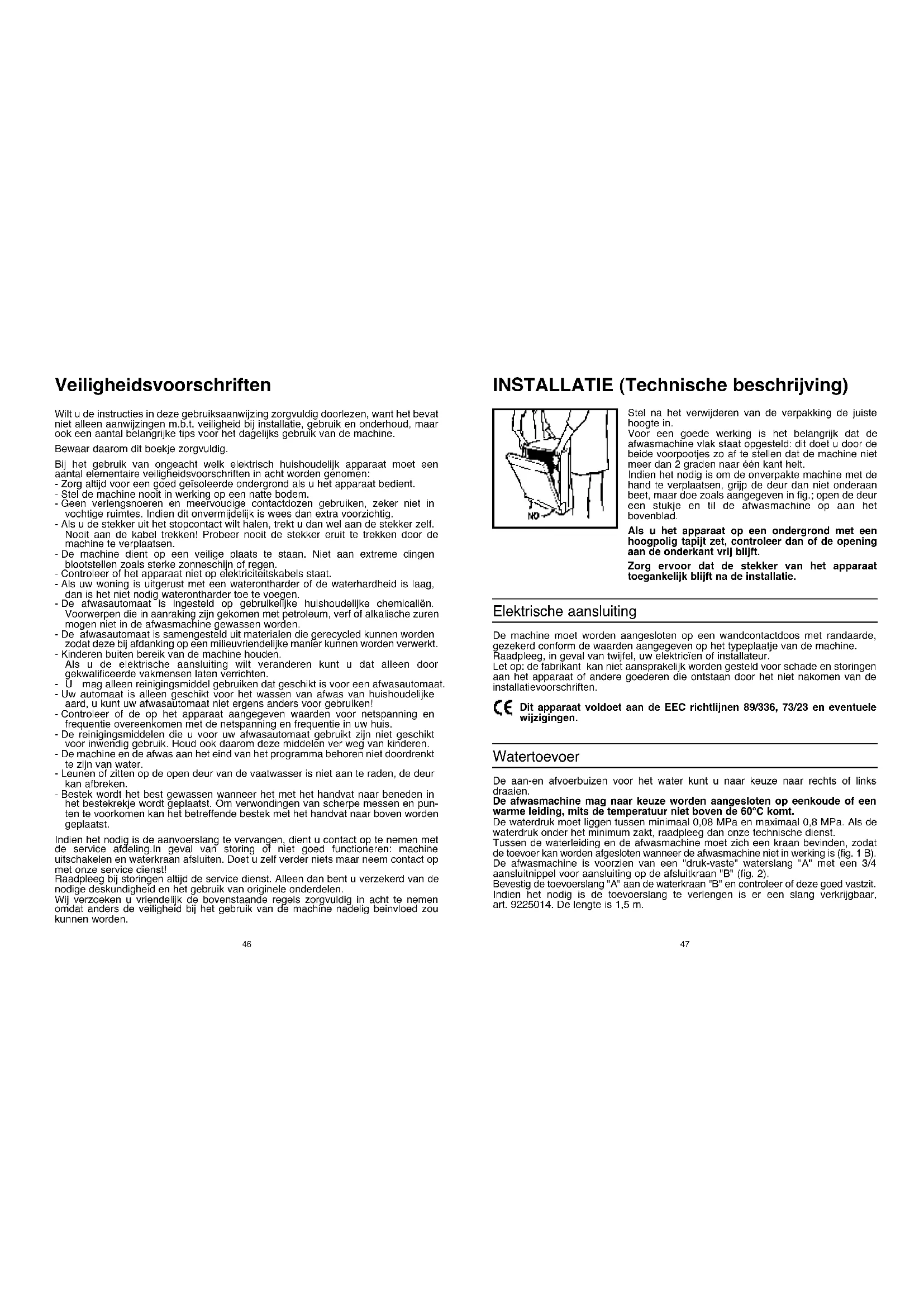 Fig. A47 INSTALLATIE (Technische beschrijving) Stel na het verwijderen van de verpakking de juiste hoogte in. Voor een goede werking is het belangrijk dat de afwasmachine vlak staat opgesteld: dit doet u door de beide voorpootjes zo af te stellen dat de machine niet meer dan 2 graden naar één kant helt. Indien het nodig is om de onverpakte machine met de hand te verplaatsen, grijp de deur dan niet onderaan beet, maar doe zoals aangegeven in fig.; open de deur een stukje en til de afwasmachine op aan het bovenblad. Als u het apparaat op een ondergrond met een hoogpolig tapijt zet, controleer dan of de opening aan de onderkant vrij blijft. Zorg ervoor dat de stekker van het apparaat toegankelijk blijft na de installatie. Elektrische aansluiting De machine moet worden aangesloten op een wandcontactdoos met randaarde, gezekerd conform de waarden aangegeven op het typeplaatje van de machine. Raadpleeg, in geval van twijfel, uw elektricïen of installateur. Let op: de fabrikant kan niet aansprakelijk worden gesteld voor schade en storingen aan het apparaat of andere goederen die ontstaan door het niet nakomen van de installatievoorschriften. Dit apparaat voldoet aan de EEC richtlijnen 89/336, 73/23 en eventuele wijzigingen. Watertoevoer De aan-en afvoerbuizen voor het water kunt u naar keuze naar rechts of links draaien. De afwasmachine mag naar keuze worden aangesloten op eenkoude of een warme leiding, mits de temperatuur niet boven de 60°C komt. De waterdruk moet liggen tussen minimaal 0,08 MPa en maximaal 0,8 MPa. Als de waterdruk onder het minimum zakt, raadpleeg dan onze technische dienst. Tussen de waterleiding en de afwasmachine moet zich een kraan bevinden, zodat de toevoer kan worden afgesloten wanneer de afwasmachine niet in werking is (fig. 1 B). De afwasmachine is voorzien van een "druk-vaste" waterslang "A" met een 3/4 aansluitnippel voor aansluiting op de afsluitkraan "B" (fig. 2). Bevestig de toevoerslang "A" aan de waterkraan "B" en controleer of deze goed vastzit. Indien het nodig is de toevoerslang te verlengen is er een slang verkrijgbaar, art. 9225014. De lengte is 1,5 m.