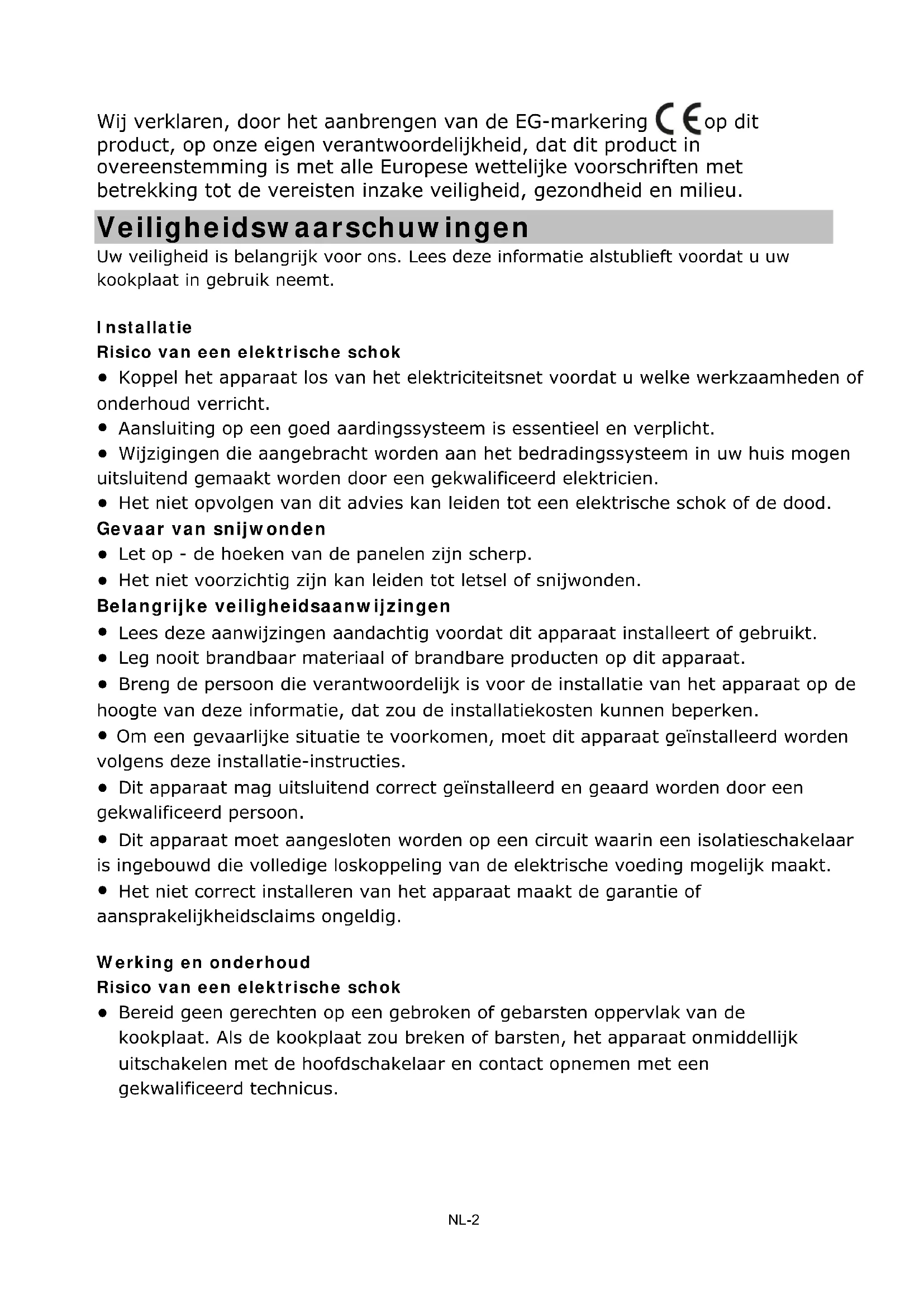 PL-28Wij verklaren, door het aanbrengen van de EG-markering op dit product, op onze eigen verantwoordelijkheid, dat dit product in overeenstemming is met alle Europese wettelijke voorschriften met betrekking tot de vereisten inzake veiligheid, gezondheid en milieu. Veiligheidswaarschuwingen Uw vei ligheid is belangrijk voor ons. Lees deze informatie alstublieft voordat u uw kookplaat in gebruik neemt. Installatie Risico van een elektrische schok