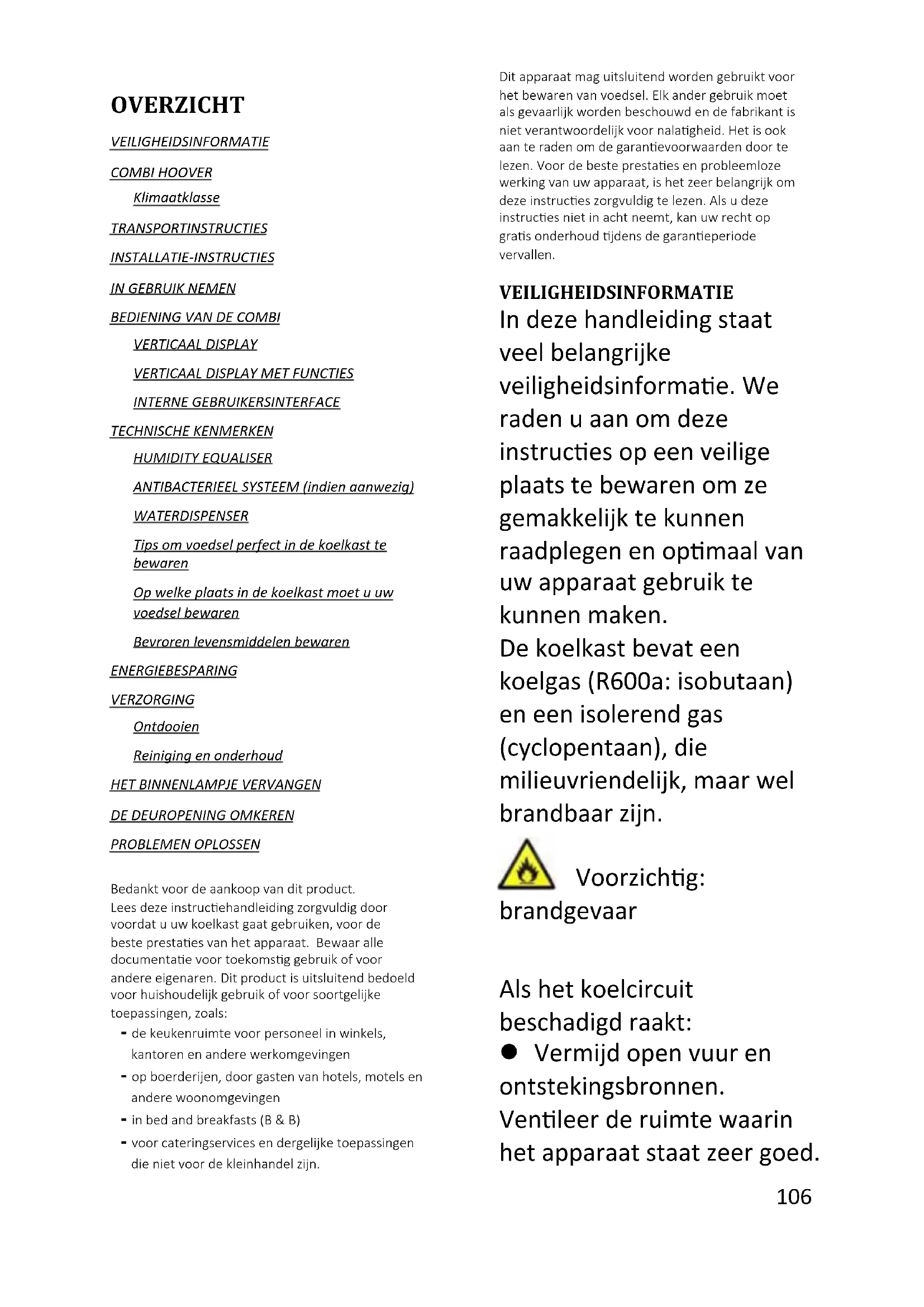 REPOSIÇÃO Termóstatos, sensores de temperatura, placas de circuito impresso e fontes de luz, por um período mínimo de sete anos após a colocação no mercado da última unidade do modelo em causa; pegas de porta, dobradiças de porta, tabuleiros e cestos por um período mínimo de sete anos e vedantes de porta por um período mínimo de dez anos, após a colocação no mercado da última unidade do modelo em causa Para mais informações sobre o produto, consulte https://eprel.ec.europa.eu/ ou digitalize o QR na etiqueta de energia fornecida com o aparelho106 Nederlands OVERZICHT VEILIGHEIDSINFORMATIE COMBI HOOVER Klimaatklasse TRANSPORTINSTRUCTIES INSTALLATIE-INSTRUCTIES IN GEBRUIK NEMEN BEDIENING VAN DE COMBI VERTICAAL DISPLAY VERTICAAL DISPLAY MET FUNCTIES INTERNE GEBRUIKERSINTERFACE TECHNISCHE KENMERKEN HUMIDITY EQUALISER ANTIBACTERIEEL SYSTEEM (indien aanwezig) WATERDISPENSER Tips om voedsel perfect in de koelkast te bewaren Op welke plaats in de koelkast moet u uw voedsel bewaren Bevroren levensmiddelen bewaren ENERGIEBESPARING VERZORGING Ontdooien Reiniging en onderhoud HET BINNENLAMPJE VERVANGEN DE DEUROPENING OMKEREN PROBLEMEN OPLOSSEN Bedankt voor de aankoop van dit product. Lees deze instructiehandleiding zorgvuldig door voordat u uw koelkast gaat gebruiken, voor de beste prestaties van het apparaat. Bewaar alle documentatie voor toekomstig gebruik of voor andere eigenaren. Dit product is uitsluitend bedoeld voor huishoudelijk gebruik of voor soortgelijke toepassingen, zoals: - de keukenruimte voor personeel in winkels, kantoren en andere werkomgevingen - op boerderijen, door gasten van hotels, motels en andere woonomgevingen - in bed and breakfasts (B & B) - voor cateringservices en dergelijke toepassingen die niet voor de kleinhandel zijn. Dit apparaat mag uitsluitend worden gebruikt voor het bewaren van voedsel. Elk ander gebruik moet als gevaarlijk worden beschouwd en de fabrikant is niet verantwoordelijk voor nalatigheid. Het is ook aan te raden om de garantievoorwaarden door te lezen. Voor de beste prestaties en probleemloze werking van uw apparaat, is het zeer belangrijk om deze instructies zorgvuldig te lezen. Als u deze instructies niet in acht neemt, kan uw recht op gratis onderhoud tijdens de garantieperiode vervallen. VEILIGHEIDSINFORMATIE In deze handleiding staat veel belangrijke veiligheidsinformatie. We raden u aan om deze instructies op een veilige plaats te bewaren om ze gemakkelijk te kunnen raadplegen en optimaal van uw apparaat gebruik te kunnen maken. De koelkast bevat een koelgas (R600a: isobutaan) en een isolerend gas (cyclopentaan), die milieuvriendelijk, maar wel brandbaar zijn. Voorzichtig: brandgevaar Als het koelcircuit beschadigd raakt: Vermijd open vuur en ontstekingsbronnen. Ventileer de ruimte waarin het apparaat staat zeer goed.107