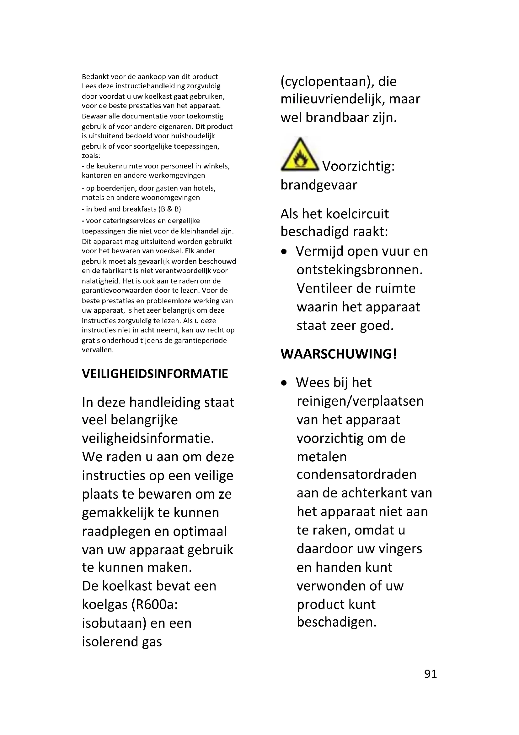 - Remova o pó presente na traseira do aparelho.91 Bedankt voor de aankoop van dit product. Lees deze instructiehandleiding zorgvuldig door voordat u uw koelkast gaat gebruiken, voor de beste prestaties van het apparaat. Bewaar alle documentatie voor toekomstig gebruik of voor andere eigenaren. Dit product is uitsluitend bedoeld voor huishoudelijk gebruik of voor soortgelijke toepassingen, zoals: - de keukenruimte voor personeel in winkels, kantoren en andere werkomgevingen - op boerderijen, door gasten van hotels, motels en andere woonomgevingen - in bed and breakfasts (B & B) - voor cateringservices en dergelijke toepassingen die niet voor de kleinhandel zijn. Dit apparaat mag uitsluitend worden gebruikt voor het bewaren van voedsel. Elk ander gebruik moet als gevaarlijk worden beschouwd en de fabrikant is niet verantwoordelijk voor nalatigheid. Het is ook aan te raden om de garantievoorwaarden door te lezen. Voor de beste prestaties en probleemloze werking van uw apparaat, is het zeer belangrijk om deze instructies zorgvuldig te lezen. Als u deze instructies niet in acht neemt, kan uw recht op gratis onderhoud tijdens de garantieperiode vervallen. VEILIGHEIDSINFORMATIE In deze handleiding staat veel belangrijke veiligheidsinformatie. We raden u aan om deze instructies op een veilige plaats te bewaren om ze gemakkelijk te kunnen raadplegen en optimaal van uw apparaat gebruik te kunnen maken. De koelkast bevat een koelgas (R600a: isobutaan) en een isolerend gas (cyclopentaan), die milieuvriendelijk, maar wel brandbaar zijn. Voorzichtig: brandgevaar Als het koelcircuit beschadigd raakt: