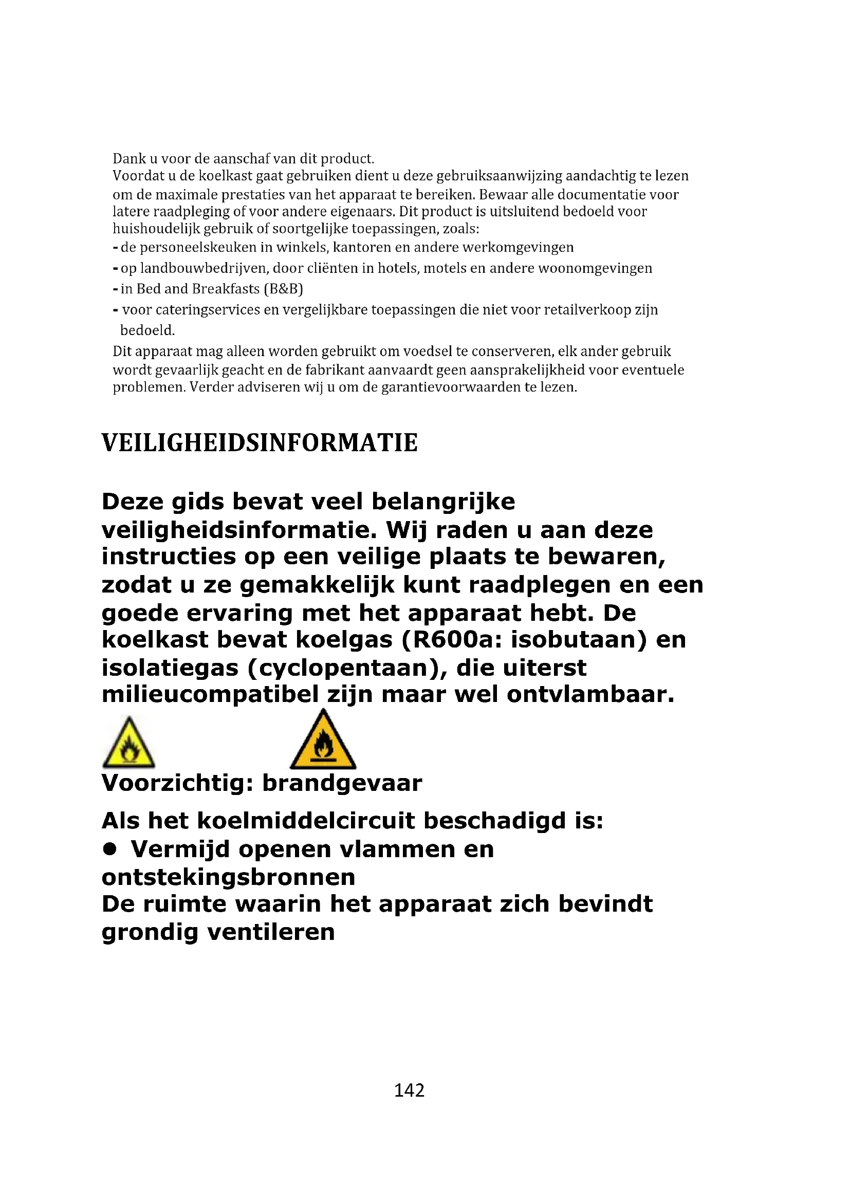 PROBLEMEN OPLOSSEN ........................................................................ 160142 Dank u voor de aanschaf van dit product. Voordat u de koelkast gaat gebruiken dient u deze gebruiksaanwijzing aandachtig te lezen om de maximale prestaties van het apparaat te bereiken. Bewaar alle documentatie voor latere raadpleging of voor andere eigenaars. Dit product is uitsluitend bedoeld voor huishoudelijk gebruik of soortgelijke toepassingen, zoals: - de personeelskeuken in winkels, kantoren en andere werkomgevingen - op landbouwbedrijven, door cliënten in hotels, motels en andere woonomgevingen - in Bed and Breakfasts (B&B) - voor cateringservices en vergelijkbare toepassingen die niet voor retailverkoop zijn bedoeld. Dit apparaat mag alleen worden gebruikt om voedsel te conserveren, elk ander gebruik wordt gevaarlijk geacht en de fabrikant aanvaardt geen aansprakelijkheid voor eventuele problemen. Verder adviseren wij u om de garantievoorwaarden te lezen. VEILIGHEIDSINFORMATIE Deze gids bevat veel belangrijke veiligheidsinformatie. Wij raden u aan deze instructies op een veilige plaats te bewaren, zodat u ze gemakkelijk kunt raadplegen en een goede ervaring met het apparaat hebt. De koelkast bevat koelgas (R600a: isobutaan) en isolatiegas (cyclopentaan), die uiterst milieucompatibel zijn maar wel ontvlambaar. Voorzichtig: brandgevaar Als het koelmiddelcircuit beschadigd is: Vermijd openen vlammen en ontstekingsbronnen De ruimte waarin het apparaat zich bevindt grondig ventileren Lopend percentage??143 WAARSCHUWING!