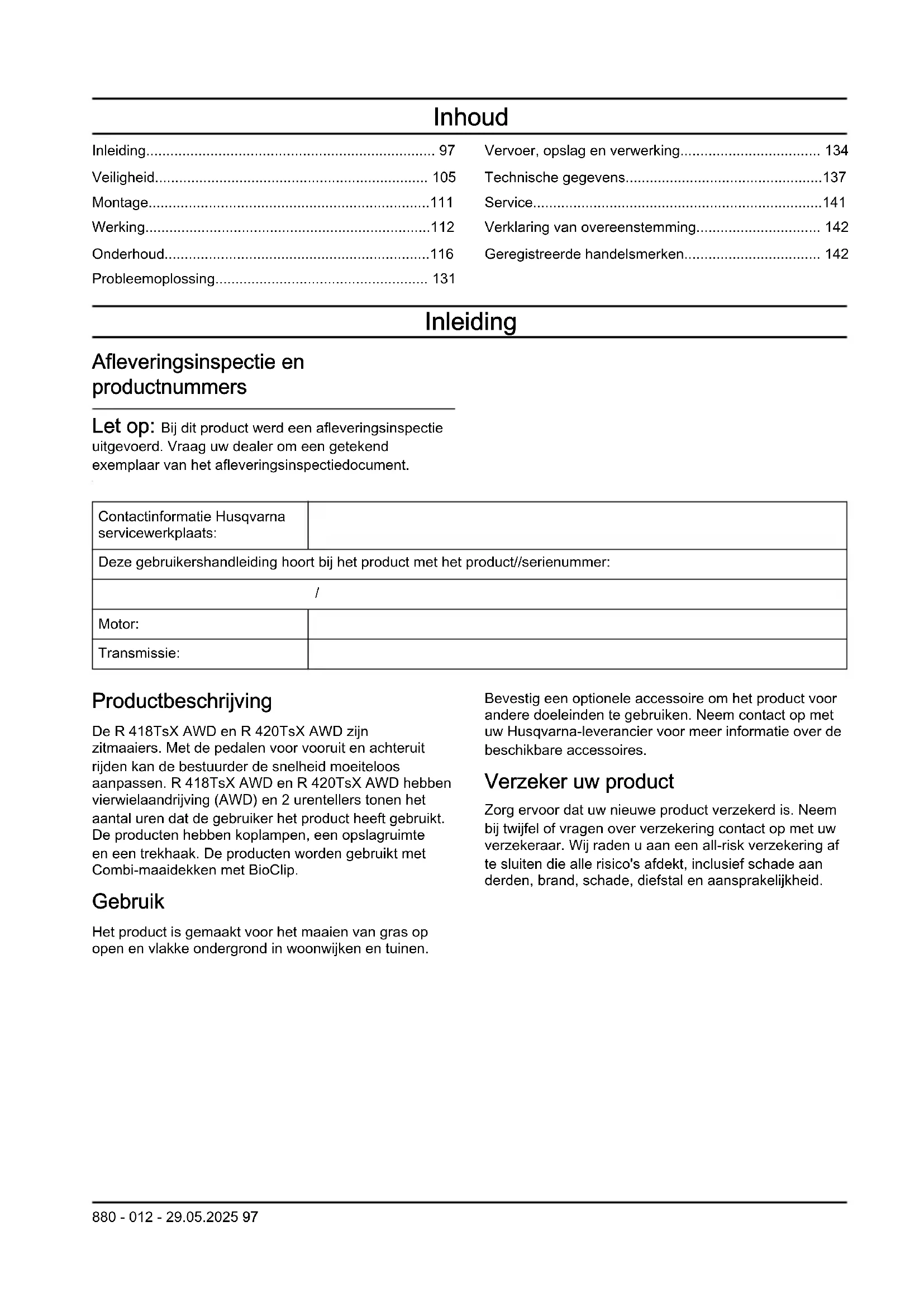 Motor: Transmissie: Productbeschrijving De R 418TsX AWD en R 420TsX AWD zijn zitmaaiers. Met de pedalen voor vooruit en achteruit rijden kan de bestuurder de snelheid moeiteloos aanpassen. R 418TsX AWD en R 420TsX AWD hebben vierwielaandrijving (AWD) en 2 urentellers tonen het aantal uren dat de gebruiker het product heeft gebruikt. De producten hebben koplampen, een opslagruimte en een trekhaak. De producten worden gebruikt met Combi-maaidekken met BioClip. Gebruik Het product is gemaakt voor het maaien van gras op open en vlakke ondergrond in woonwijken en tuinen. Bevestig een optionele accessoire om het product voor andere doeleinden te gebruiken. Neem contact op met uw Husqvarna-leverancier voor meer informatie over de beschikbare accessoires. Verzeker uw product Zorg ervoor dat uw nieuwe product verzekerd is. Neem bij twijfel of vragen over verzekering contact op met uw verzekeraar. Wij raden u aan een all-risk verzekering af te sluiten die alle risico's afdekt, inclusief schade aan derden, brand, schade, diefstal en aansprakelijkheid.