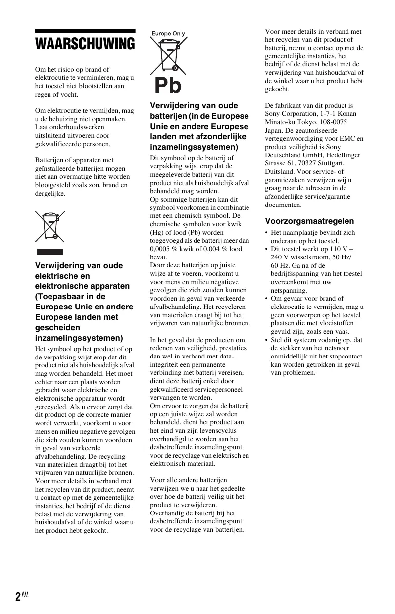 USB 17 33IT Voor meer details in verband met het recyclen van dit product of batterij, neemt u contact op met de gemeentelijke instanties, het bedrijf of de dienst belast met de verwijdering van huishoudafval of de winkel waar u het product hebt gekocht. WAARSCHUWING Om het risico op brand of elektrocutie te verminderen, mag u het toestel niet blootstellen aan regen of vocht. Om elektrocutie te vermijden, mag u de behuizing niet openmaken. Laat onderhoudswerken uitsluitend uitvoeren door gekwalificeerde personen. Batterijen of apparaten met geïnstalleerde batterijen mogen niet aan overmatige hitte worden blootgesteld zoals zon, brand en dergelijke. Verwijdering van oude elektrische en elektronische apparaten (Toepasbaar in de Europese Unie en andere Europese landen met gescheiden inzamelingssystemen) Het symbool op het product of op de verpakking wijst erop dat dit product niet als huishoudelijk afval mag worden behandeld. Het moet echter naar een plaats worden gebracht waar elektrische en elektronische apparatuur wordt gerecycled. Als u ervoor zorgt dat dit product op de correcte manier wordt verwerkt, voorkomt u voor mens en milieu negatieve gevolgen die zich zouden kunnen voordoen in geval van verkeerde afvalbehandeling. De recycling van materialen draagt bij tot het vrijwaren van natuurlijke bronnen. Voor meer details in verband met het recyclen van dit product, neemt u contact op met de gemeentelijke instanties, het bedrijf of de dienst belast met de verwijdering van huishoudafval of de winkel waar u het product hebt gekocht. 2NL Verwijdering van oude batterijen (in de Europese Unie en andere Europese landen met afzonderlijke inzamelingssystemen) Dit symbool op de batterij of verpakking wijst erop dat de meegeleverde batterij van dit product niet als huishoudelijk afval behandeld mag worden. Op sommige batterijen kan dit symbool voorkomen in combinatie met een chemisch symbool. De chemische symbolen voor kwik (Hg) of lood (Pb) worden toegevoegd als de batterij meer dan 0,0005 % kwik of 0,004 % lood bevat. Door deze batterijen op juiste wijze af te voeren, voorkomt u voor mens en milieu negatieve gevolgen die zich zouden kunnen voordoen in geval van verkeerde afvalbehandeling. Het recycleren van materialen draagt bij tot het vrijwaren van natuurlijke bronnen. In het geval dat de producten om redenen van veiligheid, prestaties dan wel in verband met dataintegriteit een permanente verbinding met batterij vereisen, dient deze batterij enkel door gekwalificeerd servicepersoneel vervangen te worden. Om ervoor te zorgen dat de batterij op een juiste wijze zal worden behandeld, dient het product aan het eind van zijn levenscyclus overhandigd te worden aan het desbetreffende inzamelingspunt voor de recyclage van elektrisch en elektronisch materiaal. Voor alle andere batterijen verwijzen we u naar het gedeelte over hoe de batterij veilig uit het product te verwijderen. Overhandig de batterij bij het desbetreffende inzamelingspunt voor de recyclage van batterijen. De fabrikant van dit product is Sony Corporation, 1-7-1 Konan Minato-ku Tokyo, 108-0075 Japan. De geautoriseerde vertegenwoordiging voor EMC en product veiligheid is Sony Deutschland GmbH, Hedelfinger Strasse 61, 70327 Stuttgart, Duitsland. Voor service- of garantiezaken verwijzen wij u graag naar de adressen in de afzonderlijke service/garantie documenten. Voorzorgsmaatregelen