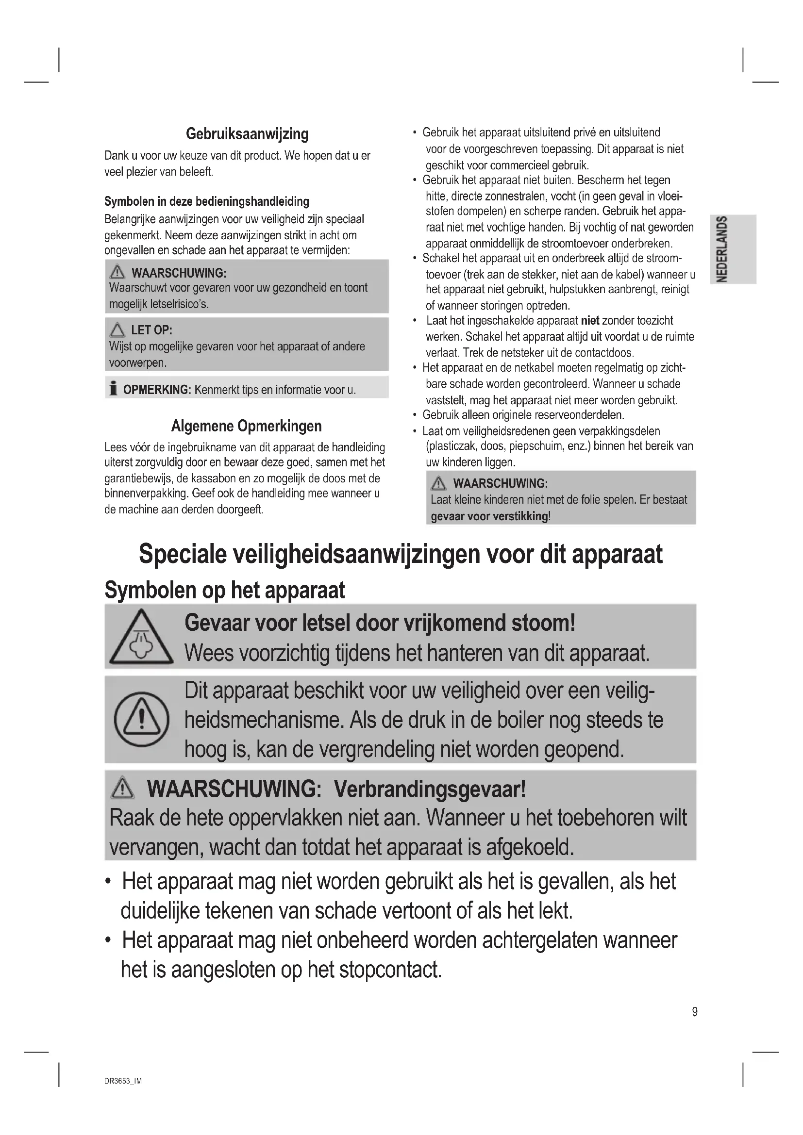 - Het apparaat mag niet onbeheerd worden achtergelaten wanneer het is aangesloten op het stopcontact.10 DR3653_IM 10.02.16