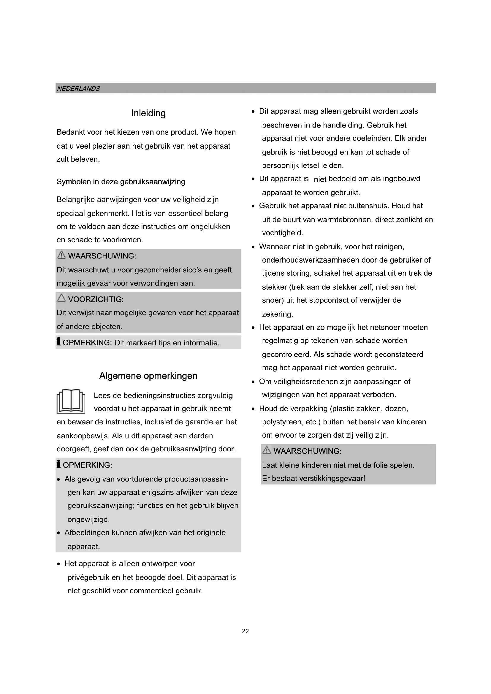 OPMERKING: Als gevolg van voortdurende productaanpassin- gen kan uw apparaat enigszins afwijken van deze gebruiksaanwijzing; functies en het gebruik blijven ongewijzigd. Afbeeldingen kunnen afwijken van het originele apparaat. Het apparaat is alleen ontworpen voor privégebruik en het beoogde doel. Dit apparaat is niet geschikt voor commercieel gebruik. Dit apparaat mag alleen gebruikt worden zoals beschreven in de handleiding. Gebruik het apparaat niet voor andere doeleinden. Elk ander gebruik is niet beoogd en kan tot schade of persoonlijk letsel leiden. Dit apparaat is niet bedoeld om als ingebouwd apparaat te worden gebruikt. Gebruik het apparaat niet buitenshuis. Houd het uit de buurt van warmtebronnen, direct zonlicht en vochtigheid. Wanneer niet in gebruik, voor het reinigen, onderhoudswerkzaamheden door de gebruiker of tijdens storing, schakel het apparaat uit en trek de stekker (trek aan de stekker zelf, niet aan het snoer) uit het stopcontact of verwijder de zekering. Het apparaat en zo mogelijk het netsnoer moeten regelmatig op tekenen van schade worden gecontroleerd. Als schade wordt geconstateerd mag het apparaat niet worden gebruikt. Om veiligheidsredenen zijn aanpassingen of wijzigingen van het apparaat verboden. Houd de verpakking (plastic zakken, dozen, polystyreen, etc.) buiten het bereik van kinderen om ervoor te zorgen dat zij veilig zijn. WAARSCHUWING: Laat kleine kinderen niet met de folie spelen. Er bestaat verstikkingsgevaar!23