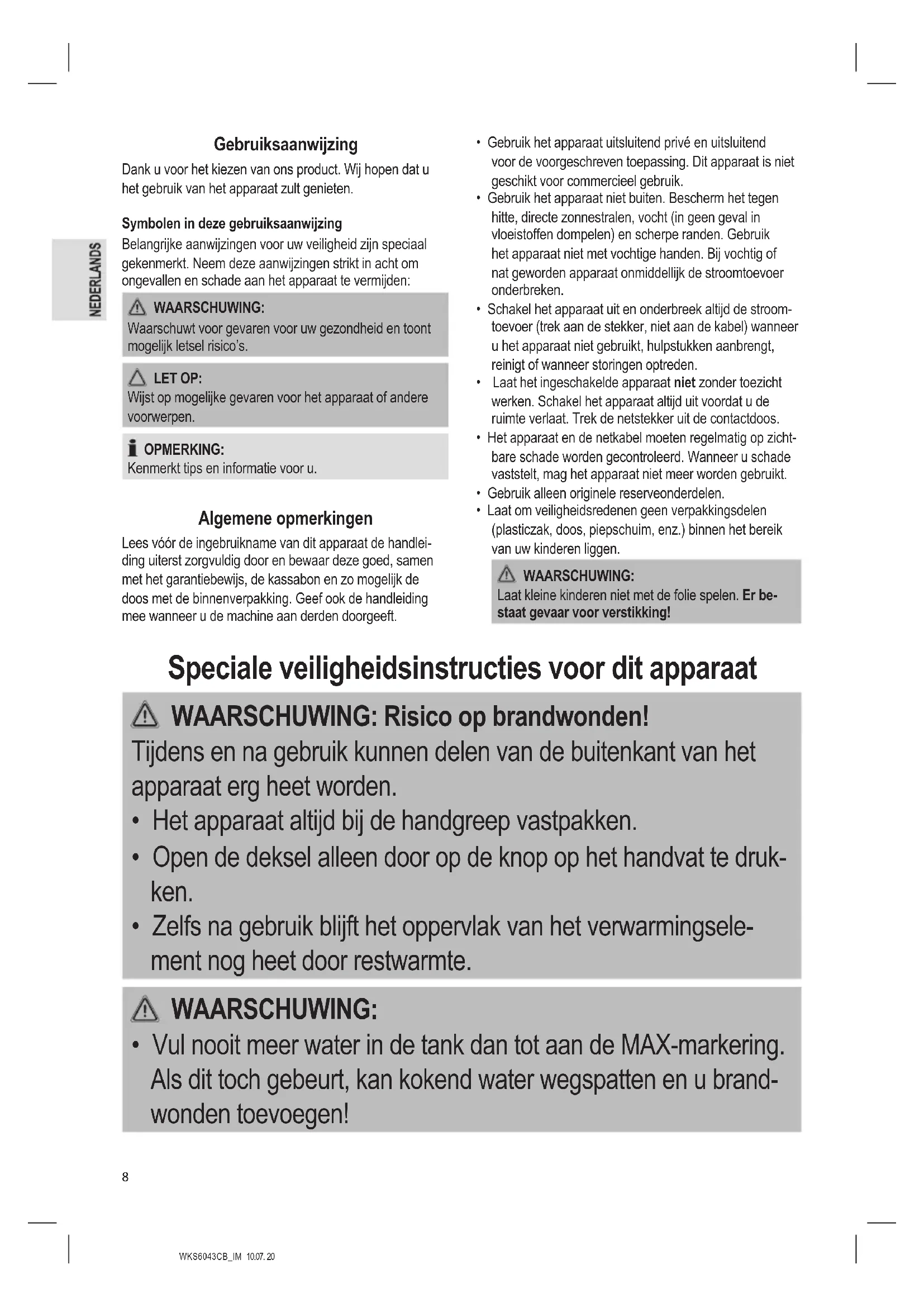 - Vul nooit meer water in de tank dan tot aan de MAX-markering. Als dit toch gebeurt, kan kokend water wegspatten en u brand- wonden toevoegen!WKS6043CB_IM 10.07. 20
