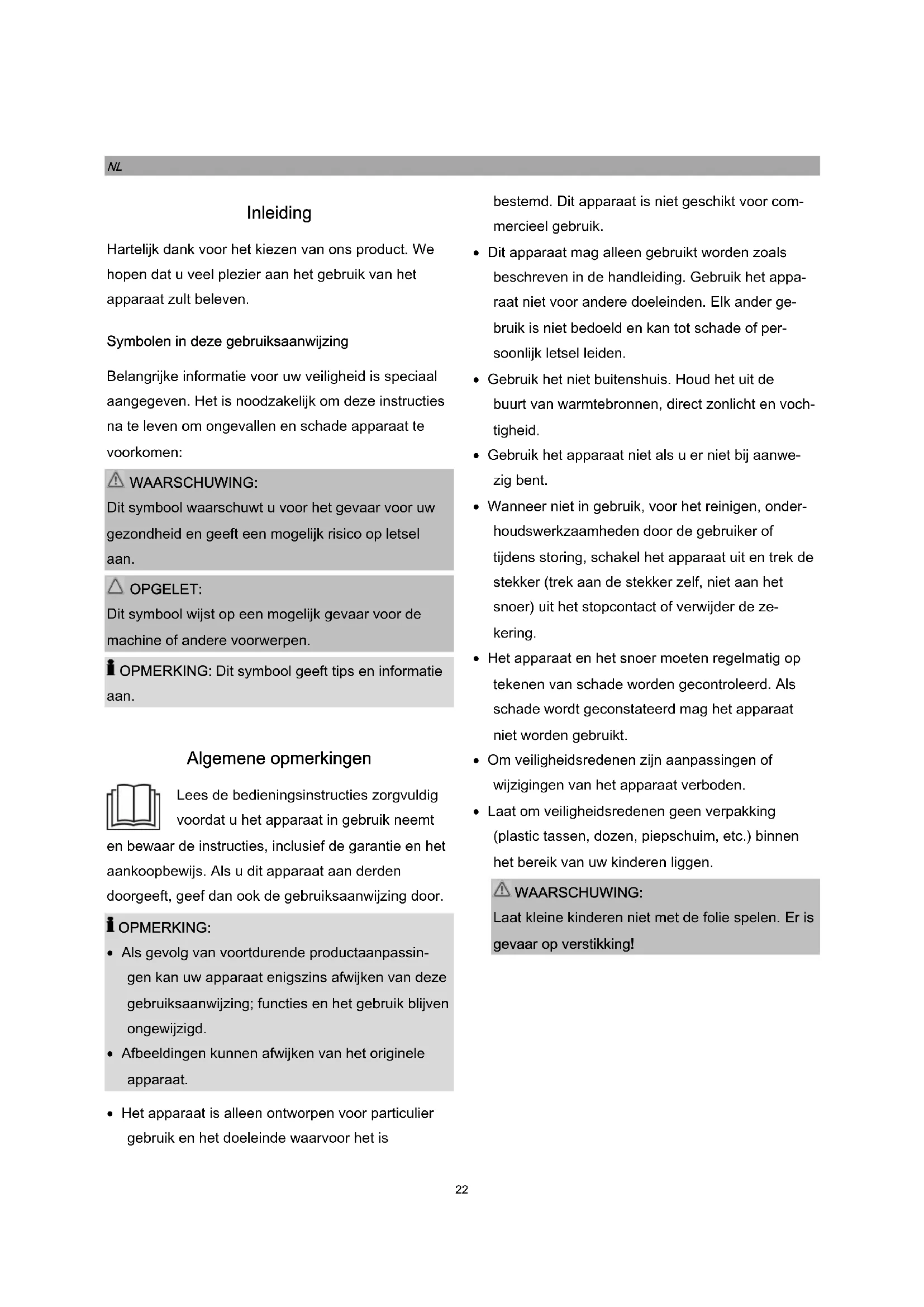 OPMERKING: Als gevolg van voortdurende productaanpassin- gen kan uw apparaat enigszins afwijken van deze gebruiksaanwijzing; functies en het gebruik blijven ongewijzigd. Afbeeldingen kunnen afwijken van het originele apparaat. Het apparaat is alleen ontworpen voor particulier gebruik en het doeleinde waarvoor het is bestemd. Dit apparaat is niet geschikt voor com- mercieel gebruik. Dit apparaat mag alleen gebruikt worden zoals beschreven in de handleiding. Gebruik het appa- raat niet voor andere doeleinden. Elk ander ge- bruik is niet bedoeld en kan tot schade of per- soonlijk letsel leiden. Gebruik het niet buitenshuis. Houd het uit de buurt van warmtebronnen, direct zonlicht en voch- tigheid. Gebruik het apparaat niet als u er niet bij aanwe- zig bent. Wanneer niet in gebruik, voor het reinigen, onder- houdswerkzaamheden door de gebruiker of tijdens storing, schakel het apparaat uit en trek de stekker (trek aan de stekker zelf, niet aan het snoer) uit het stopcontact of verwijder de ze- kering. Het apparaat en het snoer moeten regelmatig op tekenen van schade worden gecontroleerd. Als schade wordt geconstateerd mag het apparaat niet worden gebruikt. Om veiligheidsredenen zijn aanpassingen of wijzigingen van het apparaat verboden. Laat om veiligheidsredenen geen verpakking (plastic tassen, dozen, piepschuim, etc.) binnen het bereik van uw kinderen liggen. WAARSCHUWING: Laat kleine kinderen niet met de folie spelen. Er is gevaar op verstikking!23