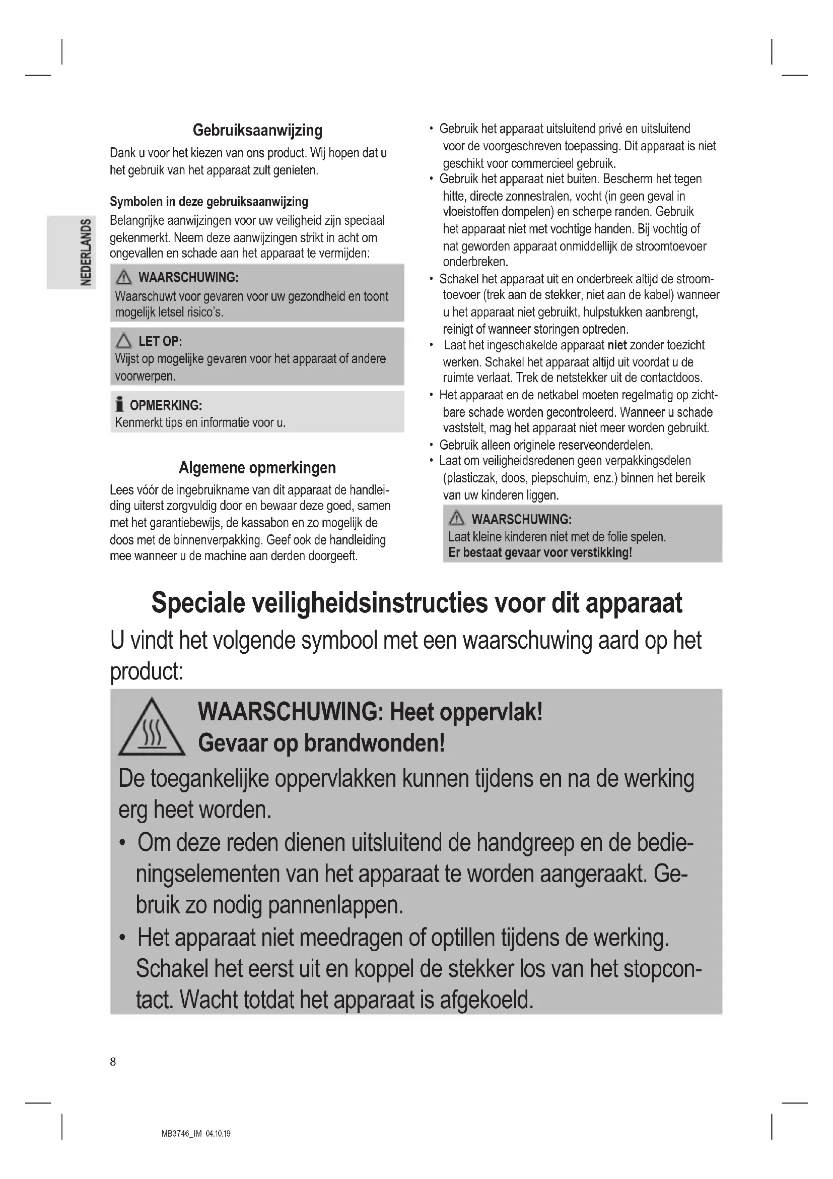- Het apparaat niet meedragen of optillen tijdens de werking. Schakel het eerst uit en koppel de stekker los van het stopcon- tact. Wacht totdat het apparaat is afgekoeld.MB3746_IM 04.10.19