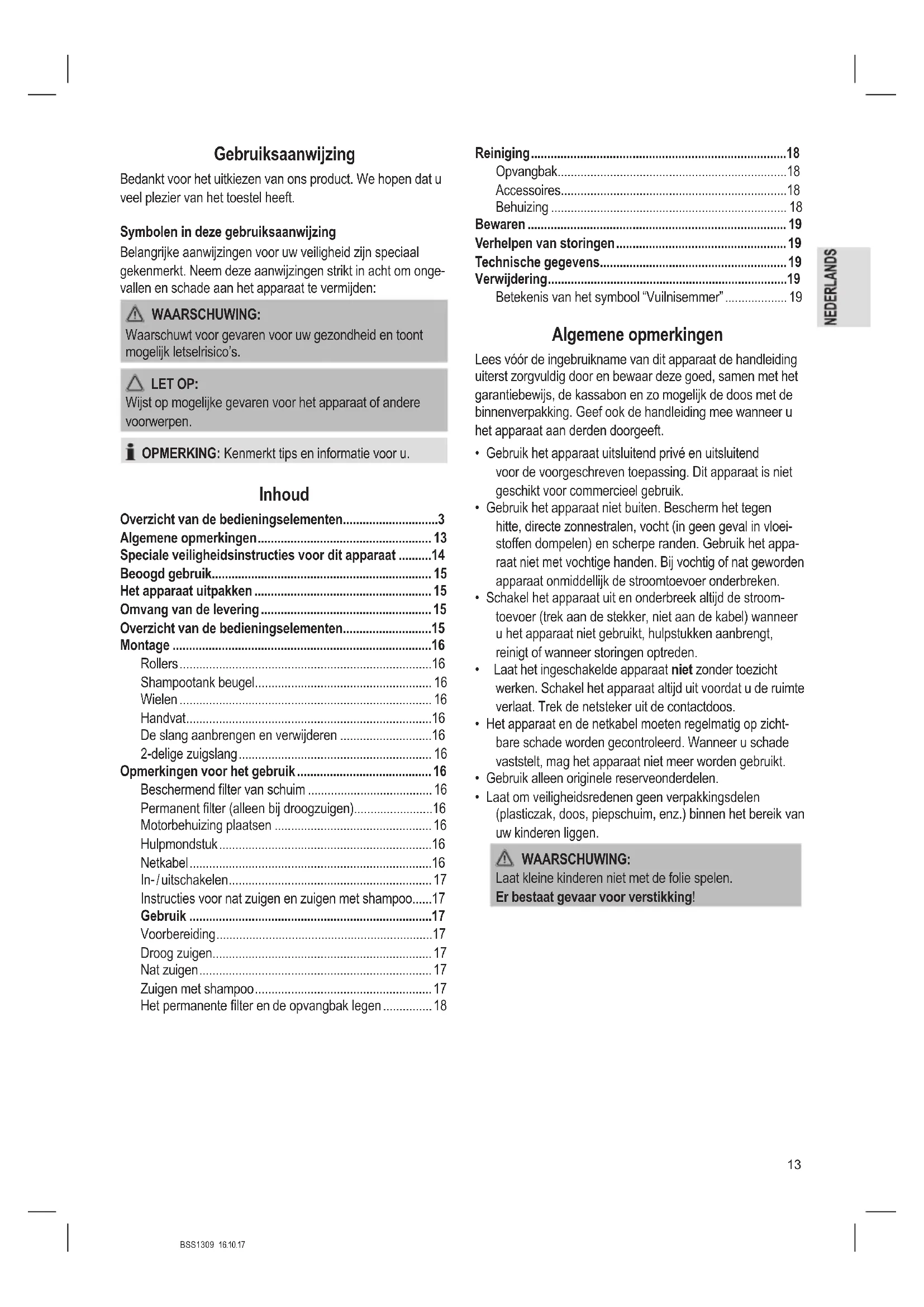 - Instructies voor nat zuigen en zuigen met shampoo p. 17