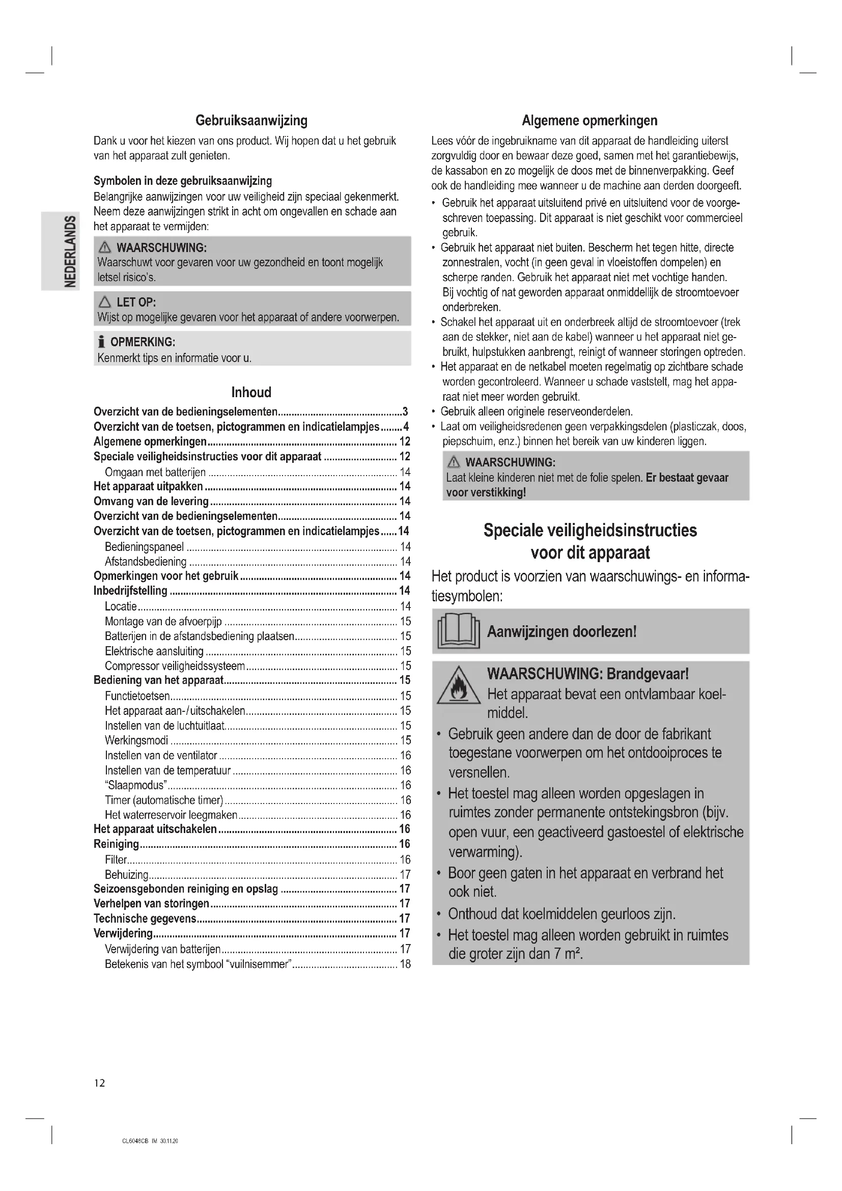 - Het toestel mag alleen worden gebruikt in ruimtes die groter zijn dan 7 m².CL6048CB_IM 30.11.20