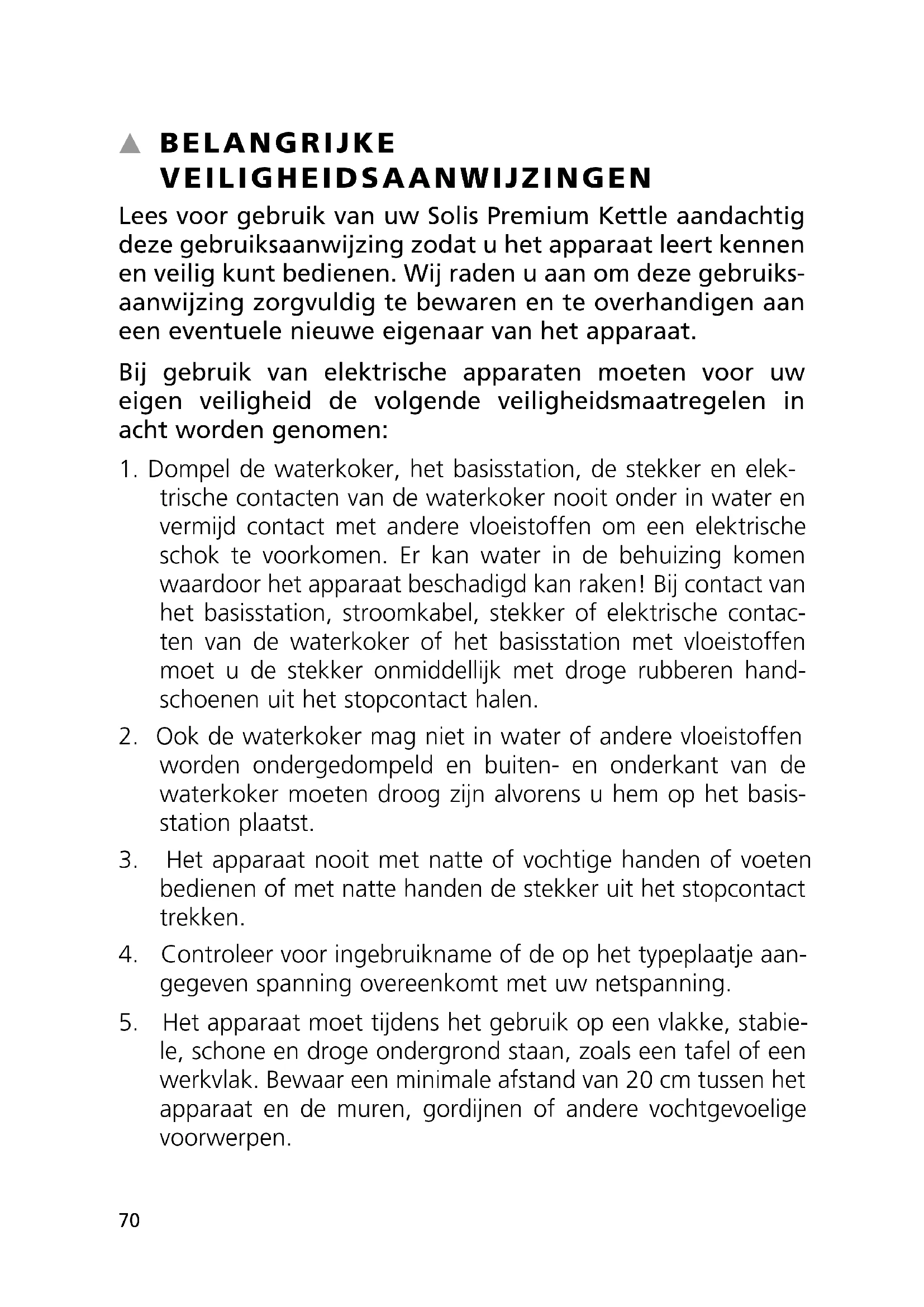 SOLIS Premium Kettle E_2015 16.06.16 11:05 Seite 6869 SOLIS Premium Kettle E_2015 16.06.16 11:05 Seite 69▲ BELANGRIJKE VEILIGHEIDSAANWIJZINGEN Lees voor gebruik van uw Solis Premium Kettle aandachtig deze gebruiksaanwijzing zodat u het apparaat leert kennen en veilig kunt bedienen. Wij raden u aan om deze gebruiks- aanwijzing zorgvuldig te bewaren en te overhandigen aan een eventuele nieuwe eigenaar van het apparaat. Bij gebruik van elektrische apparaten moeten voor uw eigen veiligheid de volgende veiligheidsmaatregelen in acht worden genomen: