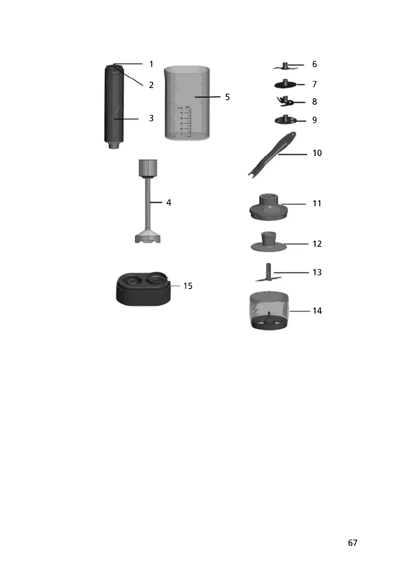 1 Snelheidsregelaar (– is de laagste snelheid, + is de hoogste snelheid) 2 ON knop voor het aanzetten van de mixer 3 Motorgedeelte 4 Staafmixer met mixvoet hierop kunnen vier verwisselbare opzetstukken worden geplaatst 5 Mengbeker (600 ml) 6 Vlees- en groentemes, speciaal voor soepen met groenten met harde vezels 7 Schijf op te kloppen 8 Multifunctioneel mes 9 Roermes 10 Sleutel voor het verwijderen van de opzetstukken 11 Buitenste deksel van het hakreservoir 12 Binnenste deksel van het hakreservoir 13 Hakmes 14 Hakreservoir (120 ml) 15 Bewaarbasis met box voor accessoires SOLIS X-Change Mixer niederl._2014 02.04.14 21:35 Seite 6667