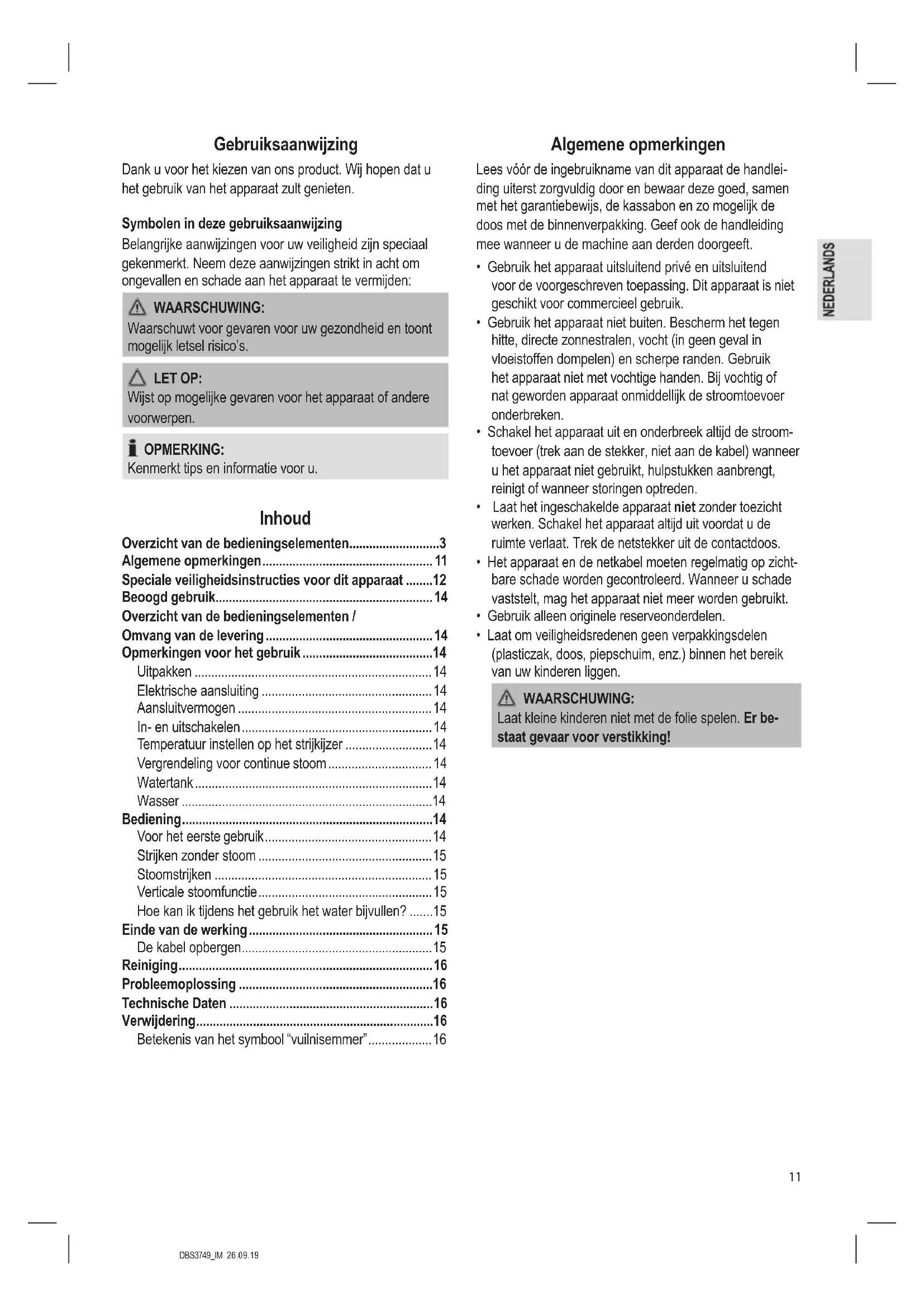 - Het resterende water kan in de watertank blijven, maar moet worden verwijderd wanneer u het strijkijzer gedu- rende langere tijd niet gebruikt. Probleemoplossing Probleem Mogelijk oorzaak Oplossing Apparaat functioneert niet. Defecte contactdoos. Sluit het apparaat aan op een andere contactdoos. Het apparaat schakelt tijdens het bedrijf plotseling uit. Is de stroomkring overbelast? Controleer de zekering in uw zekeringkast. Er wordt geen stoom gemaakt. De watertank is niet correct geïnstalleerd. Druk de watertank stevig terug in de basis. Het moet hoorbaar vastklikken. De temperatuur is te laag ingesteld. Kies een temperatuur tussen en . Lawaai bij het stoomgebruik. De tank is leeg. Controleer de tank. Vul de watertank met water. Het apparaat wordt voor het eerst gestart of pas na lange periode van stilstand. Deze pompgeluiden zijn normaal. Technische Daten Model:..................................................................... DBS 3749 Spanningstoevoer: ............................. 220 - 240 V~, 50 - 60 Hz Opgenomen vermogen: ................................... 2200 - 2400 W Beschermingsklasse: ............................................................. Maximale vulhoeveelheid van de watertank: ............. 1,2 liter Nettogewicht: ........................................................ ong. 2,3 kg Het recht om technische en ontwerpaanpassingen te ma- ken in de loop van voortdurende productontwikkeling blijft voorbehouden. Dit apparaat voldoet aan alle huidige CE-richtlijnen, zoals de richtlijn elektromagnetische compatibiliteit en de laagspanningsrichtlijn, en is gefabriceerd volgens de meest recente veiligheidsvoorschriften. Verwijdering Betekenis van het symbool “vuilnisemmer” Bescherm ons milieu, elektrische apparaten horen niet in het huisafval. Maak voor het afvoeren van elektrische apparaten gebruik van de voorgeschreven verzamelpunten en geef daar de elektrische apparaten af die u niet meer gebruikt. Daardoor helpt u de potentiële effecten te voorkomen die een verkeerde afvoer op het milieu en de menselijke gezondheid kunnen hebben. Op deze wijze levert u uw bijdrage aan het hergebruik, de recycling en andere verwerkingsvormen voor oude elektro- nische en elektrische apparaten.DBS3749_IM 26.09.19