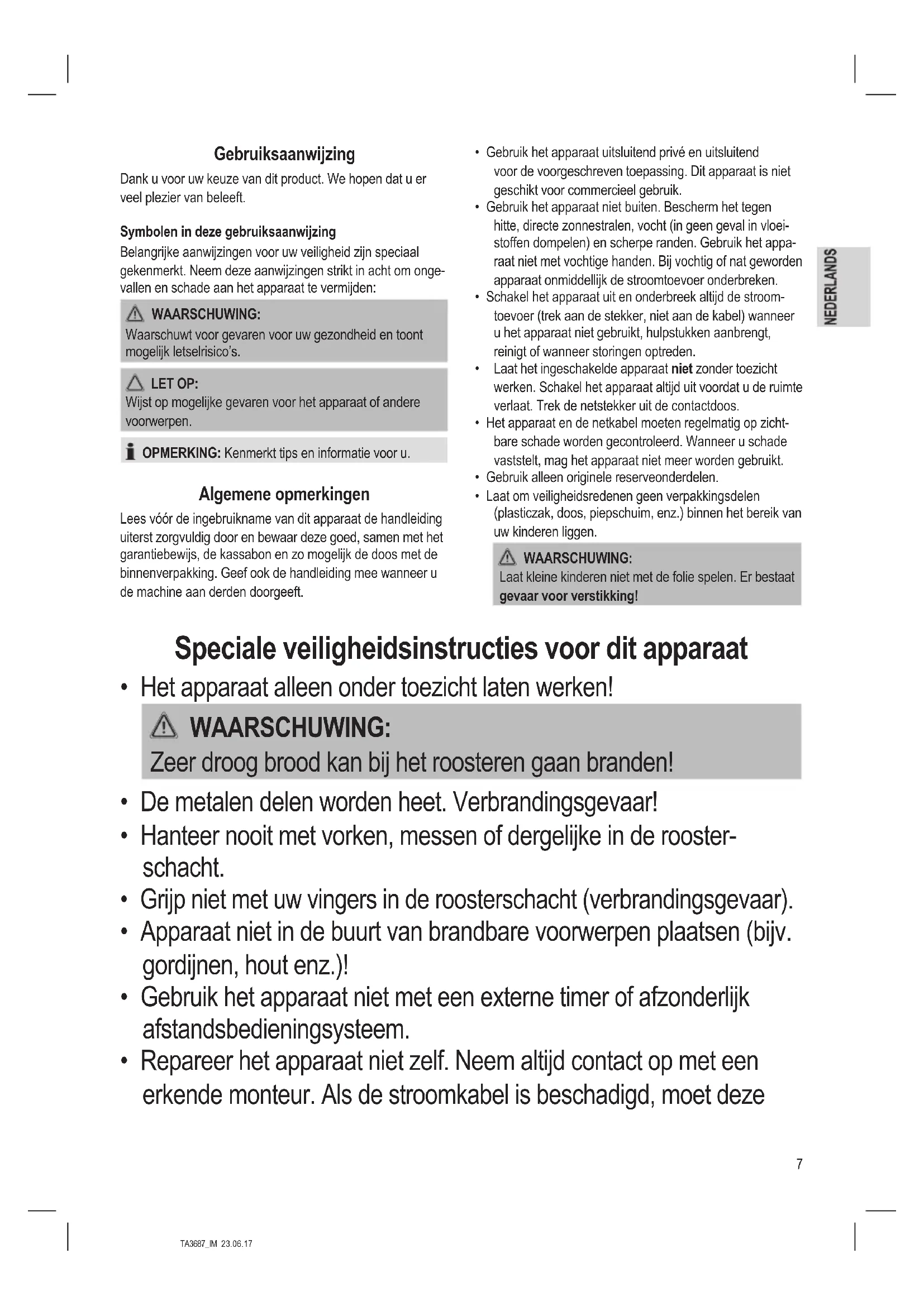- Trek de kruimellade aan de handgreep naar buiten, ver- wijder de broodresten en schuif de lade weer terug. Probleemoplossing Probleem Mogelijke oorzaak Oplossing Het apparaat werkt niet. Het apparaat krijgt geen stroom. Controleer het stopcontact met een ander apparaat. Steek de stekker goed in het stopcontact. Controleer de stop. Het apparaat is stuk. Neem contact op met uw leverancier of specialist. Het brood is te donker. De roosterstand was te hoog. Kies een lagere roosterstand. Het brood is te licht. De roosterstand was te laag. Kies een hogere roosterstand. De broodlift komt niet langer omhoog. Er zit een snee brood vast in de gleuf. Trek de stekker uit het stopcontact! Laat het apparaat afkoelen! Verwijder de snee brood met een object dat geen warmte door- geeft, zoals een hou- ten steel. Draai indien nodig het broodrooster om zodat de snee brood eruit valt. Technische gegevens Model:...........................................................................TA 3687 Spanningstoevoer: .............................. 220 - 240 V~, 50 / 60 Hz Opgenomen vermogen: ....................................... max. 1900 W Beschermingsklasse: ............................................................... Nettogewicht: .........................................................ong. 1,58 kg Het recht om technische en ontwerpaanpassingen te maken in de loop van voortdurende productontwikkeling blijft voor- behouden. Dit apparaat is gekeurd conform de op dit moment van toepassing zijnde CE-richtlijnen zoals bijvoorbeeld elektro- magnetische compatibiliteit en laagspanningsvoorschriften en is geconstrueerd volgens de nieuwste veiligheidstechnische voorschriften. Verwijdering Betekenis van het symbool “vuilnisemmer” Bescherm ons milieu, elektrische apparaten ho- ren niet in het huisafval. Maak voor het afvoeren van elektrische appara- ten gebruik van de voorgeschreven verzamel- punten en geef daar de elektrische apparaten af die u niet meer gebruikt. Daardoor helpt u de potentiële effecten te voorkomen die een verkeerde afvoer op het milieu en de menselijke gezondheid kunnen hebben. Op deze wijze levert u uw bijdrage aan het hergebruik, de recycling en andere verwerkingsvormen voor oude elektroni- sche en elektrische apparaten. Voor informatie over verzamelpunten voor uw apparaten kunt u contact opnemen met uw gemeente of gemeenteadminis- tratie.11 TA3687_IM 23.06.17 Mode d’emploi Merci d’avoir choisi notre produit. Nous espérons que vous saurez proter votre appareil. Symboles de ce mode d’emploi Les informations importantes pour votre sécurité sont particu- lièrement indiquées. Veillez à bien respecter ces indications an d’éviter tout risque d’accident ou d’endommagement de l’appareil :