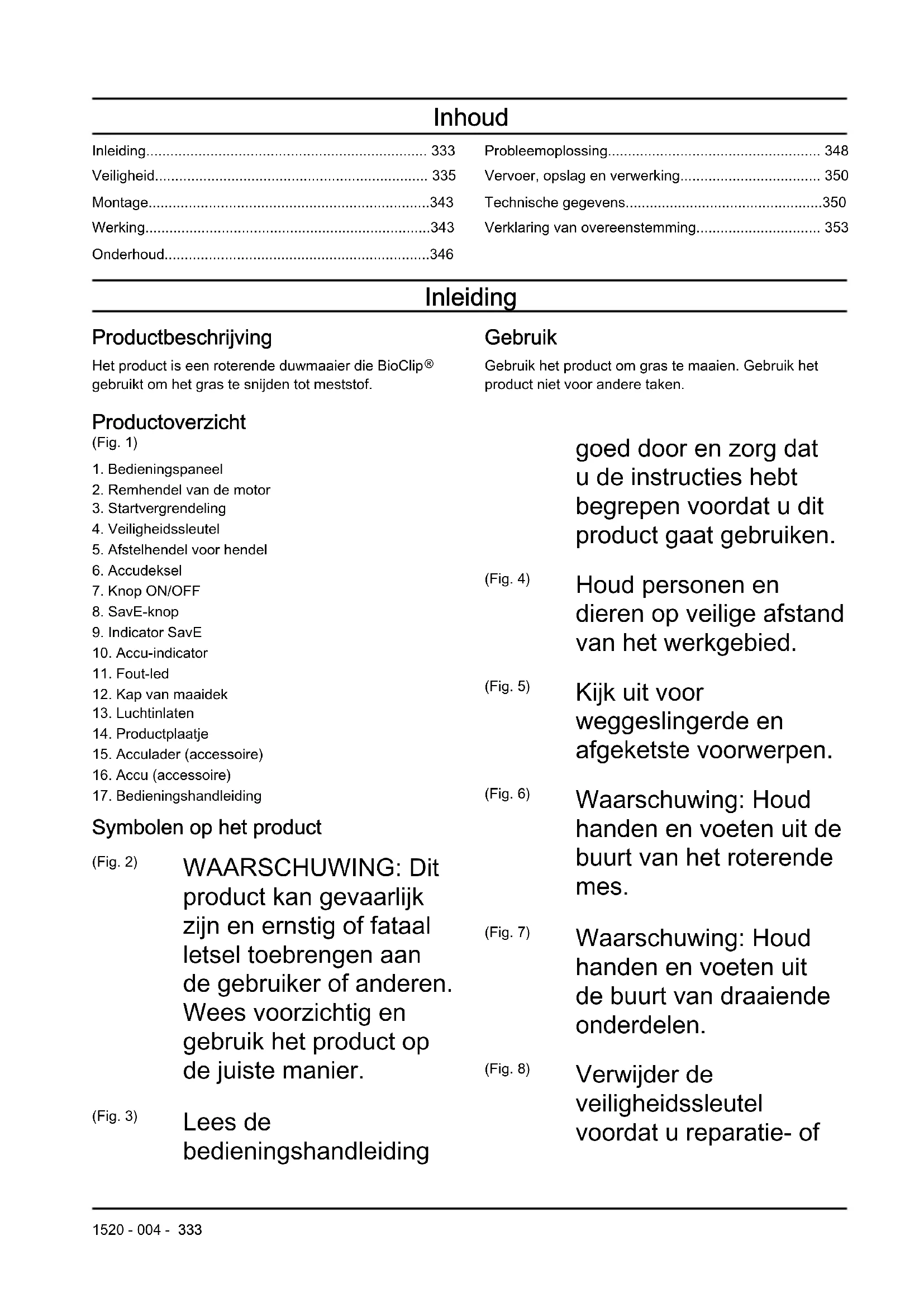 Symbolen op het product (Fig. 2) WAARSCHUWING: Dit product kan gevaarlijk zijn en ernstig of fataal letsel toebrengen aan de gebruiker of anderen. Wees voorzichtig en gebruik het product op de juiste manier. (Fig. 3) Lees de bedieningshandleiding goed door en zorg dat u de instructies hebt begrepen voordat u dit product gaat gebruiken. (Fig. 4) Houd personen en dieren op veilige afstand van het werkgebied. (Fig. 5) Kijk uit voor weggeslingerde en afgeketste voorwerpen. (Fig. 6) Waarschuwing: Houd handen en voeten uit de buurt van het roterende mes. (Fig. 7) Waarschuwing: Houd handen en voeten uit de buurt van draaiende onderdelen. (Fig. 8) Verwijder de veiligheidssleutel voordat u reparatie- of 1520 - 004 - 333onderhoudswerkzaamhe den gaat uitvoeren. (Fig. 9) Milieusymbool.Het product of de verpakking ervan is geen huishoudelijk afval. Lever het in bij een erkende verwijderingslocatie voor elektrische en elektronische apparatuur. (Fig. 10) Het product voldoet aan de geldende EG- richtlijnen. (Fig. 11) Dit product voldoet aan geldende VK- regelgeving. (Fig. 12) Het product voldoet aan de geldende richtlijnen van de Euraziatische Douane-unie. (Fig. 13) Het product voldoet aan de geldende UkrSEPRO-richtlijnen. (Fig. 14) Het product voldoet aan de geldende RCM- richtlijnen. Alleen van toepassing op AU/NZ (Fig. 15) Geluidsemissies naar het omgevingslabel volgens de richtlijnen en voorschriften van de EU en het VK en de wetgeving van Nieuw- Zuid-Wales "Protection of the Environment Operations (Noise Control) Regulation 2017". Het gegarandeerde geluidsvermogensnivea u van het product staat vermeld in Technische gegevens op pagina 350 en op het label. Beschermd tegen spatwater. (Fig. 16) Scanbare code Let op: Andere symbolen/stickers op het product hebben betrekking op certificeringseisen voor bepaalde markten. Plaatjes met instructies (Fig. 17) Startinstructie, zie Product starten op pagina 345