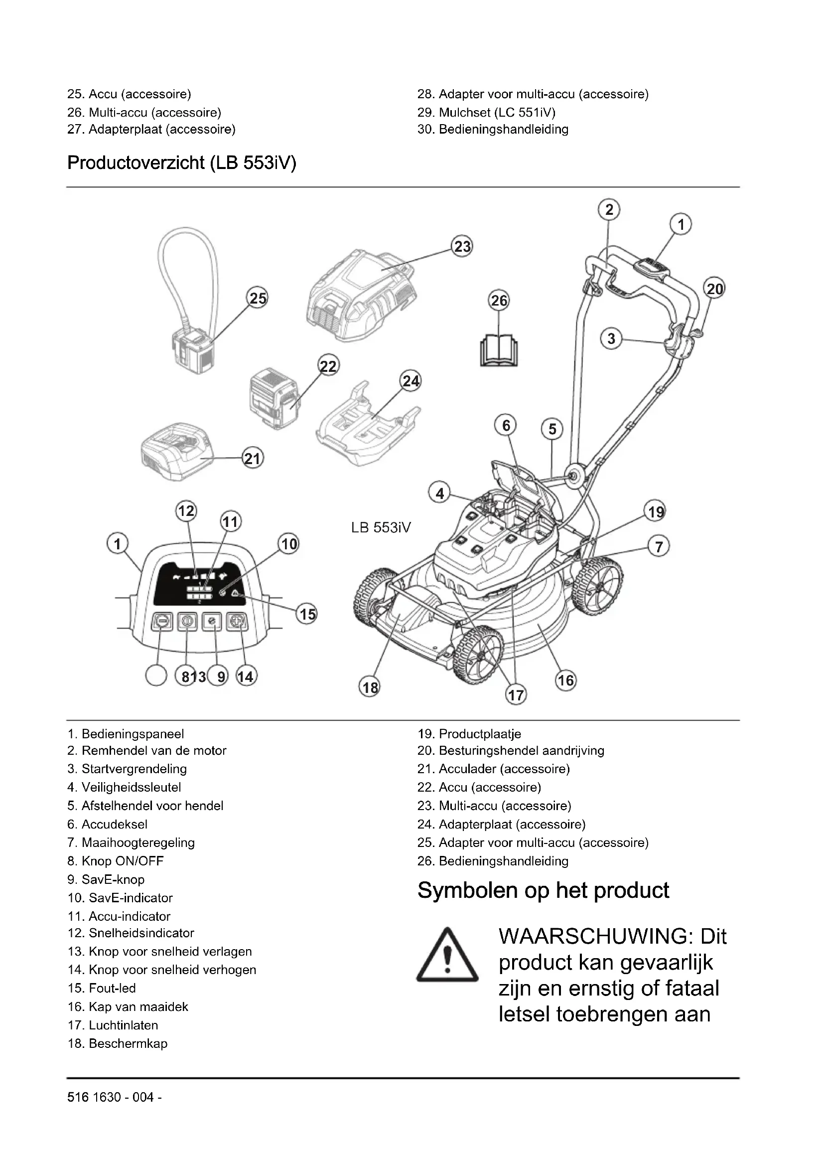 1. Bedieningspaneel2. Remhendel van de motor3. Startvergrendeling4. Veiligheidssleutel5. Afstelhendel voor hendel6. Accudeksel7. Maaihoogteregeling8. Knop ON/OFF9. SavE-knop10. SavE-indicator11. Accu-indicator12. Snelheidsindicator13. Knop voor snelheid verlagen14. Knop voor snelheid verhogen15. Fout-led16. Kap van maaidek17. Luchtinlaten18. Beschermkap19. Productplaatje20. Besturingshendel aandrijving21. Acculader (accessoire)22. Accu (accessoire)23. Multi-accu (accessoire)24. Adapterplaat (accessoire)25. Adapter voor multi-accu (accessoire)26. Bedieningshandleiding Symbolen op het product WAARSCHUWING: Dit product kan gevaarlijk zijn en ernstig of fataal letsel toebrengen aan 516 1630 - 004 -de gebruiker of anderen. Wees voorzichtig en gebruik het product op de juiste manier. Lees de bedieningshandleiding goed door en zorg dat u de instructies hebt begrepen voordat u dit product gaat gebruiken. Houd personen en dieren op veilige afstand van het werkgebied. Kijk uit voor weggeslingerde en afgeketste voorwerpen. Waarschuwing: Houd handen en voeten uit de buurt van het roterende mes. Waarschuwing: Houd handen en voeten uit de buurt van draaiende onderdelen. Verwijder de veiligheidssleutel voordat u reparatie- of onderhoudswerkzaamhe den gaat uitvoeren. Milieusymbool.Het product of de verpakking ervan is geen huishoudelijk afval. Lever het in bij een erkende verwijderingslocatie voor elektrische en elektronische apparatuur. Het product voldoet aan de geldende EG- richtlijnen. Dit product voldoet aan geldende VK- regelgeving. Het product voldoet aan de geldende richtlijnen van de Euraziatische Douane-unie. Het product voldoet aan de geldende UkrSEPRO-richtlijnen. Het product voldoet aan de geldende RCM- richtlijnen. Geldt alleen voor AU/NZ. Geluidsemissies naar het omgevingslabel volgens de richtlijnen en voorschriften van de 1630 - 004 - 517EU en het VK en de wetgeving van Nieuw- Zuid-Wales "Protection of the Environment Operations (Noise Control) Regulation 2017". Het gegarandeerde geluidsvermogensnivea u van het product staat vermeld in Technische gegevens op pagina