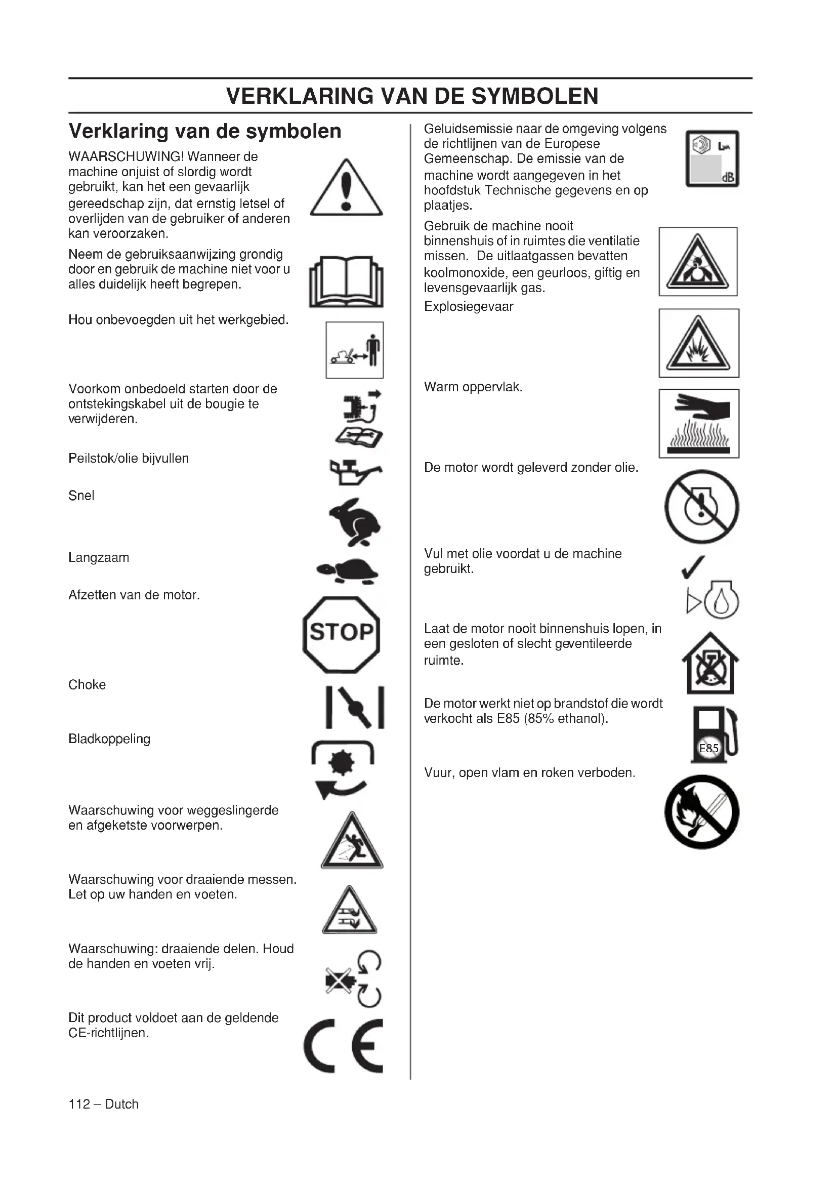 erwijderen. Peilstok/olie bijvullen Snel Langzaam Afzetten van de motor. Choke Bladkoppeling Waarschuwing voor weggeslingerde en afgek etste voorwerpen. Waarschuwing voor draaiende messen. Let op uw handen en v oeten. Waarschuwing: draaiende delen. Houd de handen en v oeten vrij. Dit product voldoet aan de geldende CE-r ichtlijnen. Geluidsemissie naar de omgeving volgens de r ichtlijnen van de Europese Gemeenschap. De emissie van de machine wordt aangegeven in het hoofdstuk Technische gegevens en op plaatjes. Gebruik de machine nooit binnenshuis of in r uimtes die ventilatie missen. De uitlaatgassen bevatten koolmonoxide, een geurloos, giftig en levensgevaarlijk gas. Explosiegevaar Warm oppervlak. De motor wordt geleverd zonder olie. Vul met olie voordat u de machine gebr uikt. Laat de motor nooit binnenshuis lopen, in een gesloten of slecht ge ventileerde ruimte. De motor werkt niet op brandstof die wordt