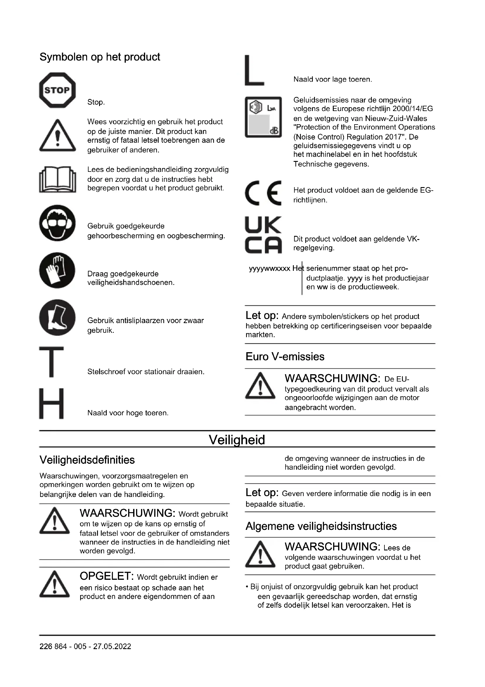 Stop. Wees voorzichtig en gebruik het product op de juiste manier. Dit product kan ernstig of fataal letsel toebrengen aan de gebruiker of anderen. Lees de bedieningshandleiding zorgvuldig door en zorg dat u de instructies hebt begrepen voordat u het product gebruikt. Gebruik goedgekeurde gehoorbescherming en oogbescherming. Draag goedgekeurde veiligheidshandschoenen. Gebruik antisliplaarzen voor zwaar gebruik. Stelschroef voor stationair draaien. Naald voor hoge toeren. Naald voor lage toeren. Geluidsemissies naar de omgeving volgens de Europese richtlijn 2000/14/EG en de wetgeving van Nieuw-Zuid-Wales "Protection of the Environment Operations (Noise Control) Regulation 2017". De geluidsemissiegegevens vindt u op het machinelabel en in het hoofdstuk Technische gegevens. Het product voldoet aan de geldende EG- richtlijnen. Dit product voldoet aan geldende VK- regelgeving. yyyywwxxxx Het serienummer staat op het pro- ductplaatje. yyyy is het productiejaar en ww is de productieweek. Let op: Andere symbolen/stickers op het product hebben betrekking op certificeringseisen voor bepaalde markten. Euro V-emissies WAARSCHUWING: De EU- typegoedkeuring van dit product vervalt als ongeoorloofde wijzigingen aan de motor aangebracht worden. Veiligheid Veiligheidsdefinities Waarschuwingen, voorzorgsmaatregelen en opmerkingen worden gebruikt om te wijzen op belangrijke delen van de handleiding. WAARSCHUWING: Wordt gebruikt om te wijzen op de kans op ernstig of fataal letsel voor de gebruiker of omstanders wanneer de instructies in de handleiding niet worden gevolgd. OPGELET: Wordt gebruikt indien er een risico bestaat op schade aan het product en andere eigendommen of aan de omgeving wanneer de instructies in de handleiding niet worden gevolgd. Let op: Geven verdere informatie die nodig is in een bepaalde situatie. Algemene veiligheidsinstructies WAARSCHUWING: Lees de volgende waarschuwingen voordat u het product gaat gebruiken.