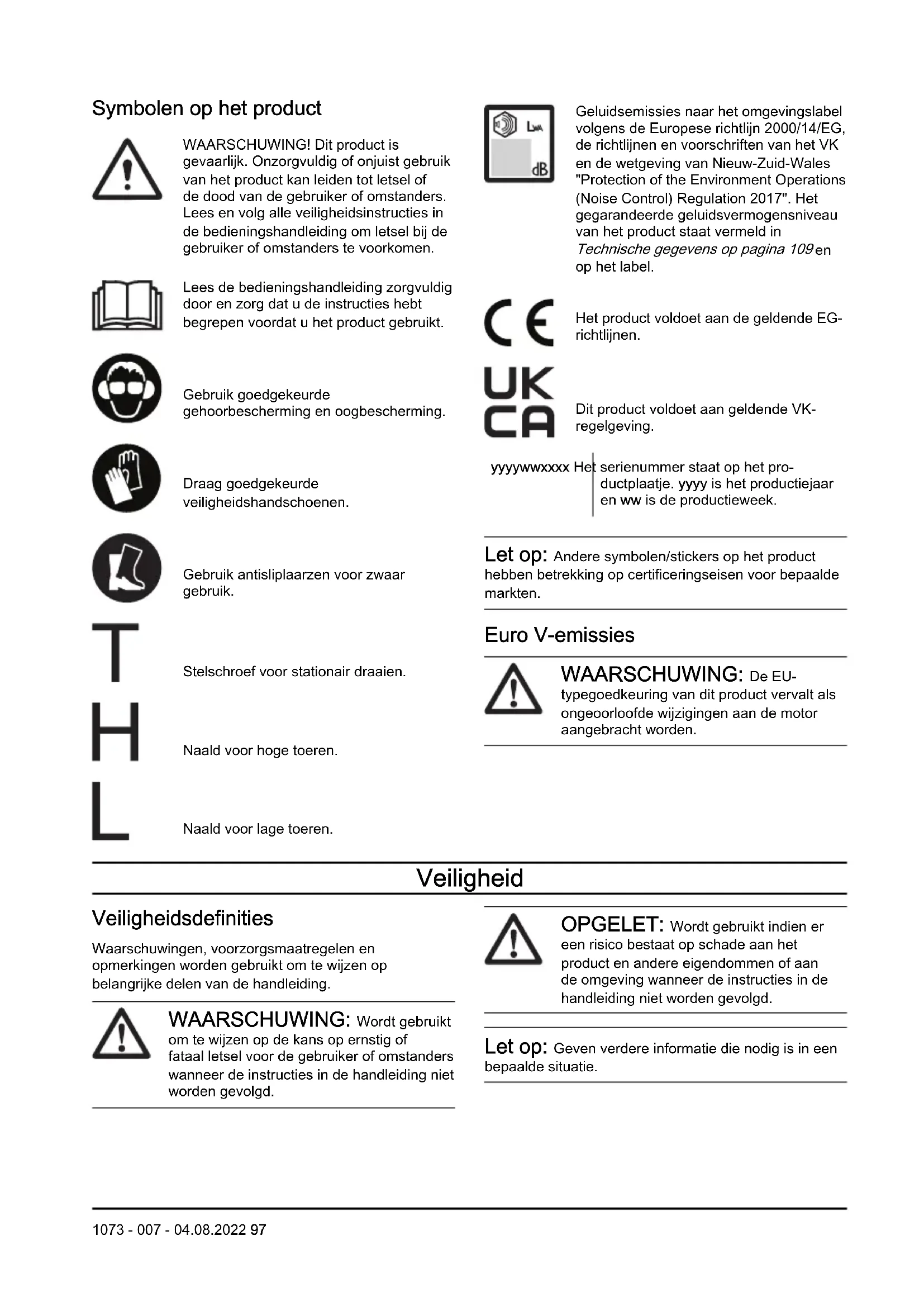 op het label. Het product voldoet aan de geldende EG- richtlijnen. Dit product voldoet aan geldende VK- regelgeving. yyyywwxxxx Het serienummer staat op het pro- ductplaatje. yyyy is het productiejaar en ww is de productieweek. Let op: Andere symbolen/stickers op het product hebben betrekking op certificeringseisen voor bepaalde markten. Euro V-emissies WAARSCHUWING: De EU- typegoedkeuring van dit product vervalt als ongeoorloofde wijzigingen aan de motor aangebracht worden. Veiligheid Veiligheidsdefinities Waarschuwingen, voorzorgsmaatregelen en opmerkingen worden gebruikt om te wijzen op belangrijke delen van de handleiding. WAARSCHUWING: Wordt gebruikt om te wijzen op de kans op ernstig of fataal letsel voor de gebruiker of omstanders wanneer de instructies in de handleiding niet worden gevolgd. OPGELET: Wordt gebruikt indien er een risico bestaat op schade aan het product en andere eigendommen of aan de omgeving wanneer de instructies in de handleiding niet worden gevolgd. Let op: Geven verdere informatie die nodig is in een bepaalde situatie. 1073 - 007 - 04.08.2022 97Algemene veiligheidsinstructies WAARSCHUWING: Lees de volgende waarschuwingen voordat u het product gaat gebruiken.