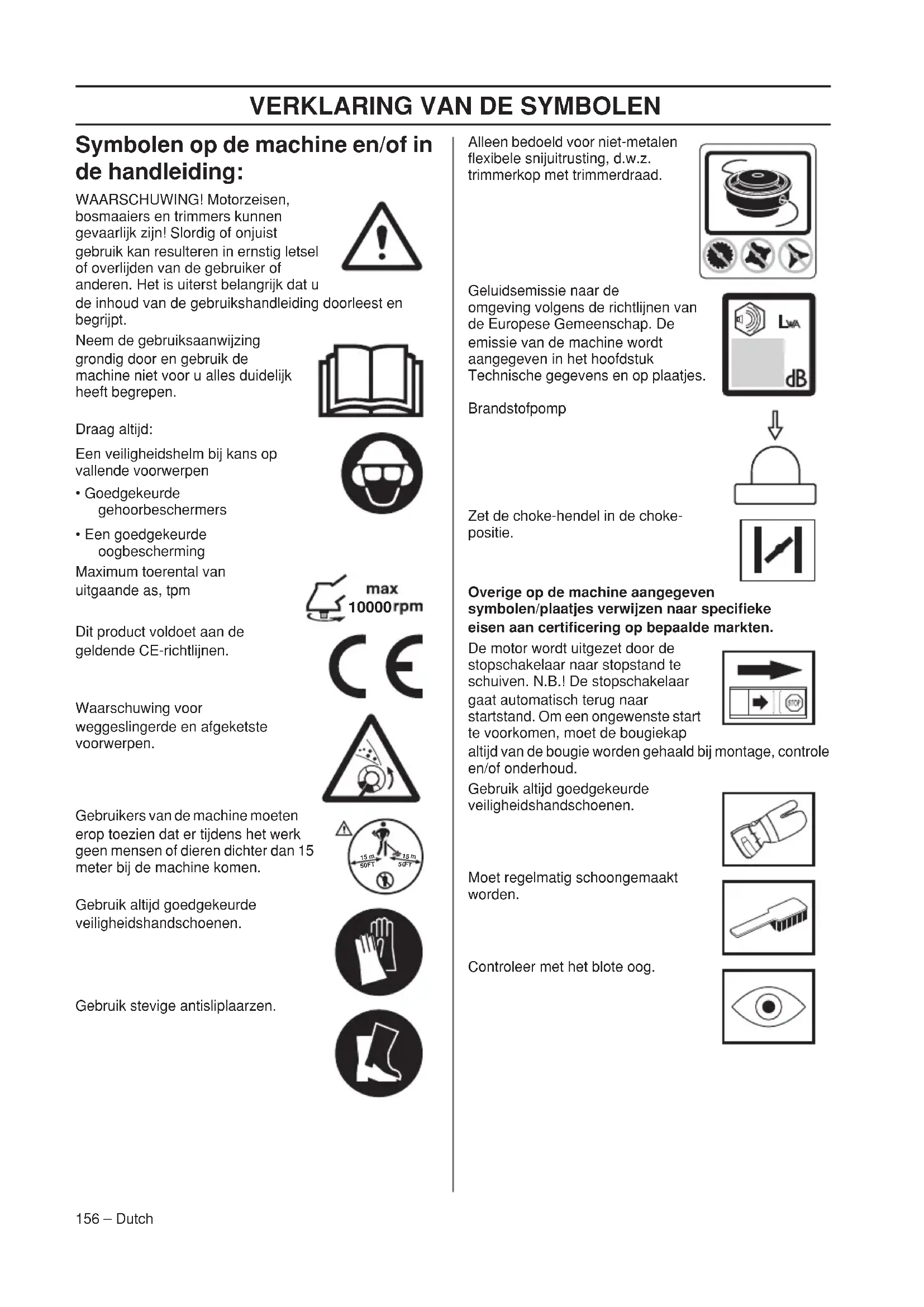- Een goedgekeurde oogbescherming Maximum toerental van uitgaande as, tpm Dit product voldoet aan de geldende CE-richtlijnen. Waarschuwing voor weggeslingerde en afgeketste voorwerpen. Gebruikers van de machine moeten erop toezien dat er tijdens het werk geen mensen of dieren dichter dan 15 meter bij de machine komen. Gebruik altijd goedgekeurde veiligheidshandschoenen. Gebruik stevige antisliplaarzen. Alleen bedoeld voor niet-metalen flexibele snijuitrusting, d.w.z. trimmerkop met trimmerdraad. Geluidsemissie naar de omgeving volgens de richtlijnen van de Europese Gemeenschap. De emissie van de machine wordt aangegeven in het hoofdstuk Technische gegevens en op plaatjes. Brandstofpomp Zet de choke-hendel in de choke- positie. Overige op de machine aangegeven symbolen/plaatjes verwijzen naar specifieke eisen aan certificering op bepaalde markten. De motor wordt uitgezet door de stopschakelaar naar stopstand te schuiven. N.B.! De stopschakelaar gaat automatisch terug naar startstand. Om een ongewenste start te voorkomen, moet de bougiekap altijd van de bougie worden gehaald bij montage, controle en/of onderhoud. Gebruik altijd goedgekeurde veiligheidshandschoenen. Moet regelmatig schoongemaakt worden. Controleer met het blote oog.