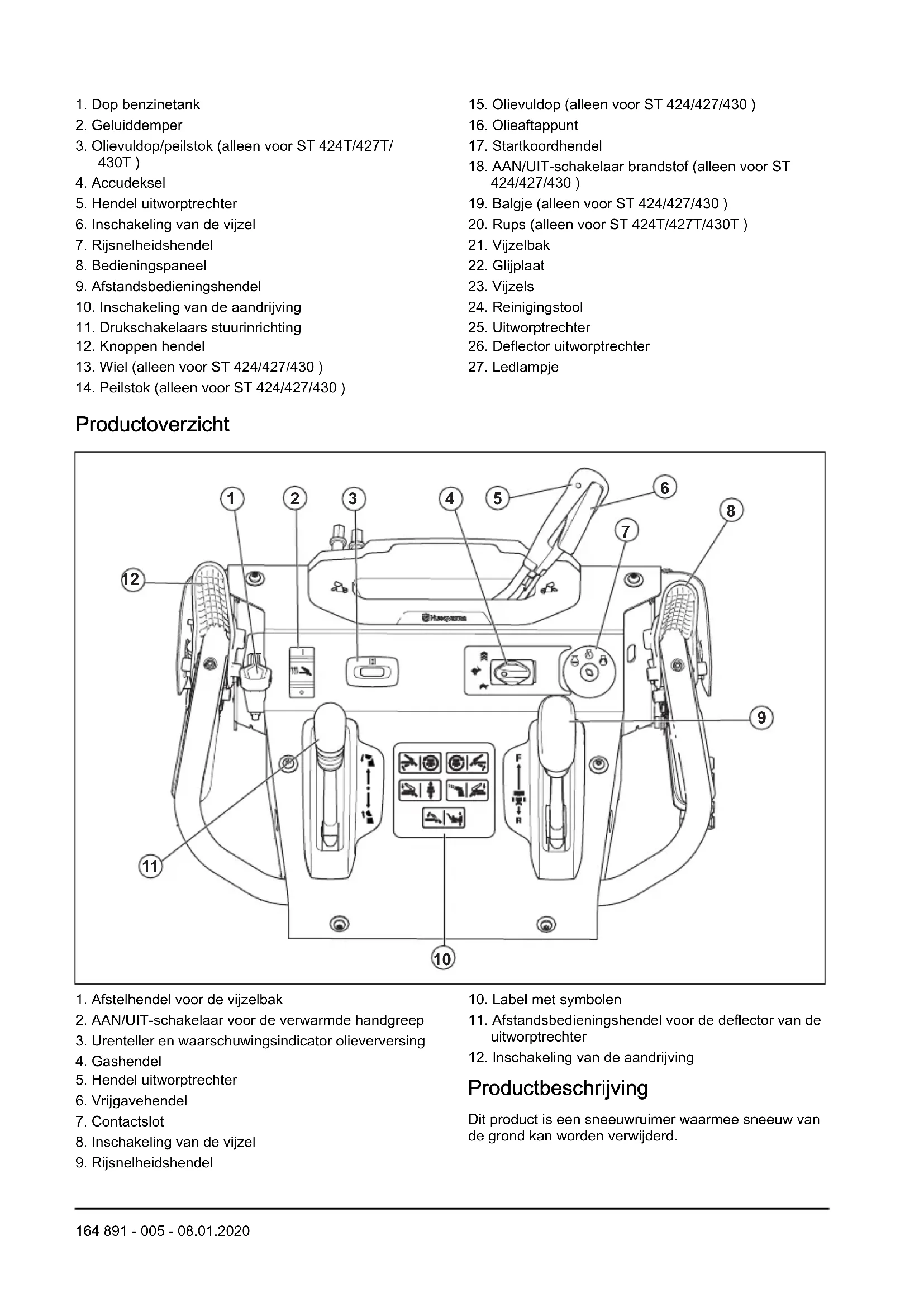 Productbeschrijving Dit product is een sneeuwruimer waarmee sneeuw van de grond kan worden verwijderd. 164 891 - 005 - 08.01.2020Gebruik Dit product kan worden gebruikt om sneeuw te verwijderen van velden, wegen, paden en opritten. Gebruik het niet op hellingen met een grotere hellingshoek dan 20°. Gebruik het product niet op terreinen waar veel puin, vuil en uitstekende stenen aanwezig zijn. Symbolen op het product Let op: Neem contact op met de distributeur om beschadigde stickers te laten vervangen. Waarschuwing. Lees de bedieningshandleiding. Inschakelen. Start de motor. STOP Motor uit. Boost. Snel. Langzaam. Waarschuwingsindicator olie verversen. Verwarmde handgrepen. Verwijder de sleutel voor onderhoud. Warm oppervlak. Risico op brand. Pas op voor wegschietende voorwerpen. Houd omstanders uit de buurt. Adem geen uitlaatgassen in. Beweeg langzaam naar achteren. Valrisico. Linksaf. Rechtsaf. Sneeuw uitwerpen. De hoogte van de vijzel- bak wijzigen. Productaansprakelijkheid Zoals uiteengezet in de wet voor productaansprakelijkheid zijn wij niet aansprakelijk voor schade die door ons product wordt veroorzaakt, indien: