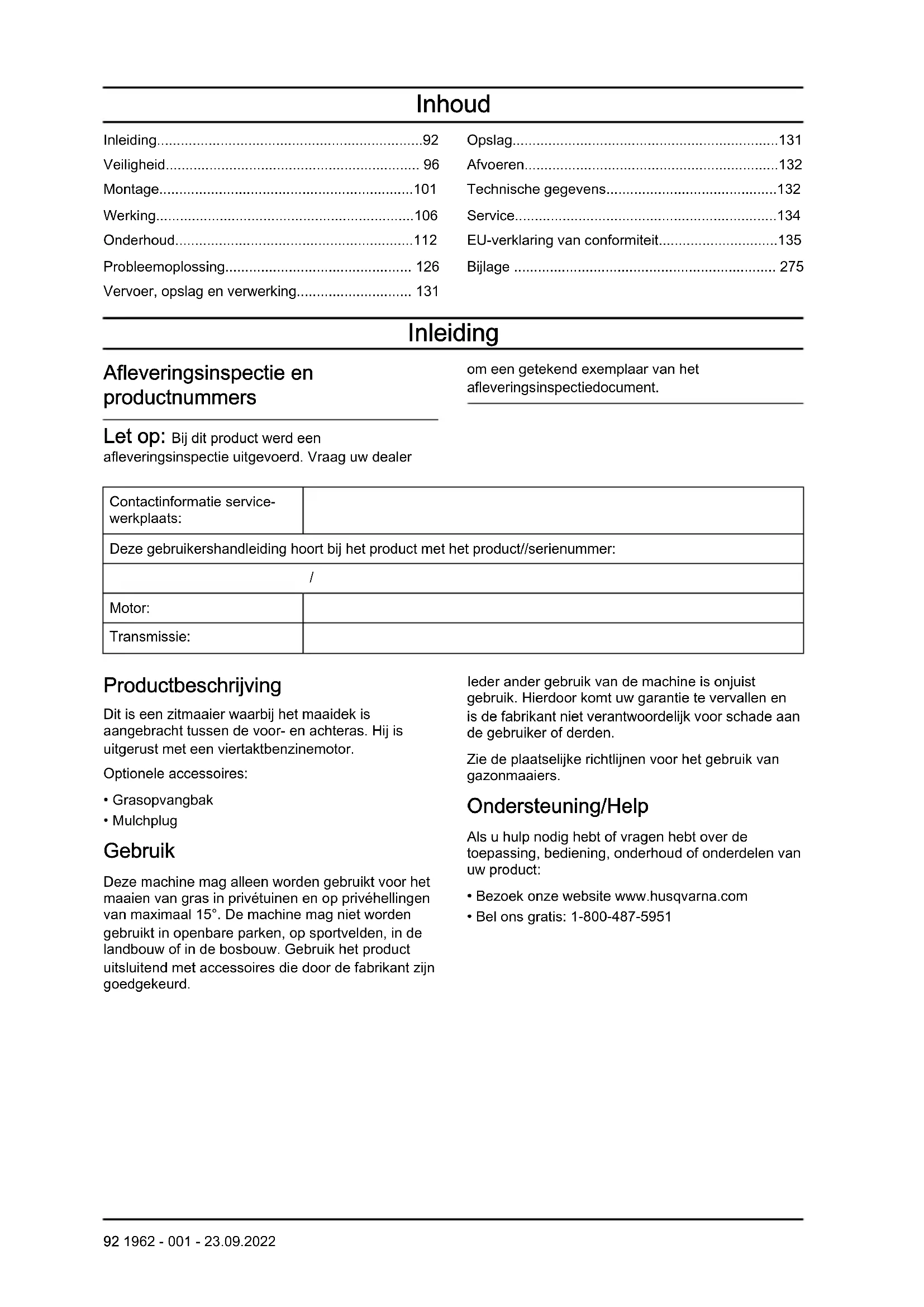 Parkeerrem. Parkeerrem ingeschakeld. Parkeerrem uitgeschakeld. Maaihoogte. Maaidek omhoog zetten. Reverse Operation System (ROS). Achteruit. Vooruit. Verlichting aan. Brandstof. Oliedruk. Accu. Gehoorbescherming aanbevolen. De messen zijn uitgeschakeld. De messen zijn ingeschakeld. Risico op koolmonoxidevergiftiging. Pas op voor wegschietende voorwerpen. Houd omstanders uit de buurt. Het symbool voor vuur duidt op een risico dat, indien niet in acht genomen, kan leiden tot overlijden, ernstig letsel en/of schade. 94 1962 - 001 - 23.09.2022Geluidsvermogenniveau. Het product voldoet aan de geldende EG-richtlijnen. Dit product voldoet aan de geldende VK-regelgeving. Houd handen en voeten uit de buurt van dit ge- deelte. Gebruik het product niet op hellingen van meer dan 15°. Warme oppervlakken. Niet aanraken. Bekneld raken van han- den. Belasting trekstang. Gebruik het product niet zonder een grasopvangbak of een uitworp. Vrijloop (alleen modellen met automatische transmissie). Urenteller De urenteller toont hoeveel uur de motor in bedrijf is geweest. Zie Productoverzicht op pagina 93 voor de locatie van de urenteller. Om de urenteller handmatig terug te stellen, draait u de contactsleutel 5 keer naar de stand "ON" (aan) en vervolgens naar de stand "STOP". Let op: De urenteller stopt alleen wanneer de contactsleutel in de stand "STOP" staat. Zorg ervoor dat de contactsleutel in de stand "STOP" blijft staan wanneer de motor is gestopt. Productaansprakelijkheid Zoals uiteengezet in de wet voor productaansprakelijkheid zijn wij niet aansprakelijk voor schade die door ons product wordt veroorzaakt, indien: