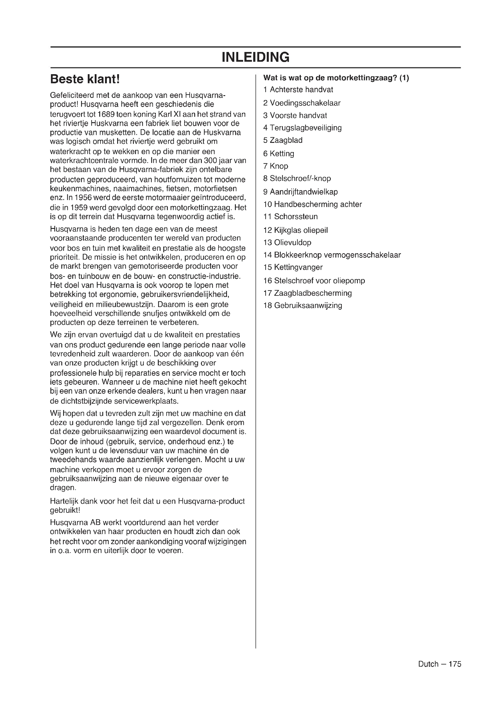 - EG-verklaring van overeenstemming INLEIDING Dutch – 175 Beste klant! Gefeliciteerd met de aankoop van een Husqvarna- product! Husqvarna heeft een geschiedenis die terugvoert tot 1689 toen koning Karl XI aan het strand van het riviertje Huskvarna een fabriek liet bouwen voor de productie van musketten. De locatie aan de Huskvarna was logisch omdat het riviertje werd gebruikt om waterkracht op te wekken en op die manier een waterkrachtcentrale vormde. In de meer dan 300 jaar van het bestaan van de Husqvarna-fabriek zijn ontelbare producten geproduceerd, van houtfornuizen tot moderne keukenmachines, naaimachines, fietsen, motorfietsen enz. In 1956 werd de eerste motormaaier geïntroduceerd, die in 1959 werd gevolgd door een motorkettingzaag. Het is op dit terrein dat Husqvarna tegenwoordig actief is. Husqvarna is heden ten dage een van de meest vooraanstaande producenten ter wereld van producten voor bos en tuin met kwaliteit en prestatie als de hoogste prioriteit. De missie is het ontwikkelen, produceren en op de markt brengen van gemotoriseerde producten voor bos- en tuinbouw en de bouw- en constructie-industrie. Het doel van Husqvarna is ook voorop te lopen met betrekking tot ergonomie, gebruikersvriendelijkheid, veiligheid en milieubewustzijn. Daarom is een grote hoeveelheid verschillende snufjes ontwikkeld om de producten op deze terreinen te verbeteren. We zijn ervan overtuigd dat u de kwaliteit en prestaties van ons product gedurende een lange periode naar volle tevredenheid zult waarderen. Door de aankoop van één van onze producten krijgt u de beschikking over professionele hulp bij reparaties en service mocht er toch iets gebeuren. Wanneer u de machine niet heeft gekocht bij een van onze erkende dealers, kunt u hen vragen naar de dichtstbijzijnde servicewerkplaats. Wij hopen dat u tevreden zult zijn met uw machine en dat deze u gedurende lange tijd zal vergezellen. Denk erom dat deze gebruiksaanwijzing een waardevol document is. Door de inhoud (gebruik, service, onderhoud enz.) te volgen kunt u de levensduur van uw machine én de tweedehands waarde aanzienlijk verlengen. Mocht u uw machine verkopen moet u ervoor zorgen de gebruiksaanwijzing aan de nieuwe eigenaar over te dragen. Hartelijk dank voor het feit dat u een Husqvarna-product gebruikt! Husqvarna AB werkt voortdurend aan het verder ontwikkelen van haar producten en houdt zich dan ook het recht voor om zonder aankondiging vooraf wijzigingen in o.a. vorm en uiterlijk door te voeren. Wat is wat op de motorkettingzaag? (1) 1 Achterste handvat 2 Voedingsschakelaar 3 Voorste handvat 4 Terugslagbeveiliging 5 Zaagblad 6 Ketting 7 Knop 8 Stelschroef/-knop 9 Aandrijftandwielkap 10 Handbescherming achter 11 Schorssteun 12 Kijkglas oliepeil 13 Olievuldop 14 Blokkeerknop vermogensschakelaar 15 Kettingvanger 16 Stelschroef voor oliepomp 17 Zaagbladbescherming 18 GebruiksaanwijzingALGEMENE VEILIGHEIDSINSTRUCTIES 176 – Dutch Algemene veiligheidswaarschuwingen voor elektrisch gereedschap Veiligheid op de werkplek p. 196