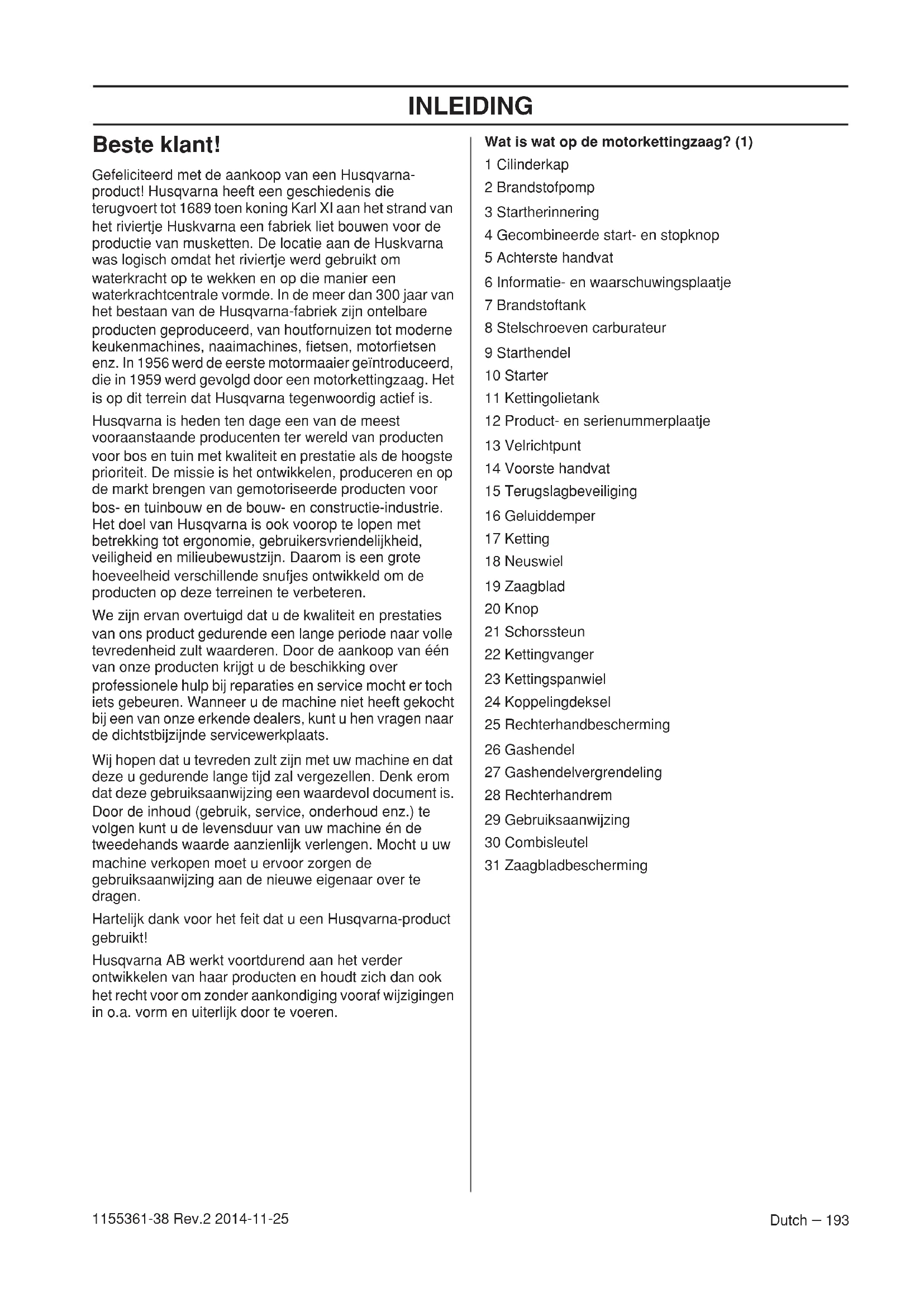 - EG-verklaring van overeenstemming INLEIDING Dutch – 193 1155361-38 Rev.2 2014-11-25 Beste klant! Gefeliciteerd met de aankoop van een Husqvarna- product! Husqvarna heeft een geschiedenis die terugvoert tot 1689 toen koning Karl XI aan het strand van het riviertje Huskvarna een fabriek liet bouwen voor de productie van musketten. De locatie aan de Huskvarna was logisch omdat het riviertje werd gebruikt om waterkracht op te wekken en op die manier een waterkrachtcentrale vormde. In de meer dan 300 jaar van het bestaan van de Husqvarna-fabriek zijn ontelbare producten geproduceerd, van houtfornuizen tot moderne keukenmachines, naaimachines, fietsen, motorfietsen enz. In 1956 werd de eerste motormaaier geïntroduceerd, die in 1959 werd gevolgd door een motorkettingzaag. Het is op dit terrein dat Husqvarna tegenwoordig actief is. Husqvarna is heden ten dage een van de meest vooraanstaande producenten ter wereld van producten voor bos en tuin met kwaliteit en prestatie als de hoogste prioriteit. De missie is het ontwikkelen, produceren en op de markt brengen van gemotoriseerde producten voor bos- en tuinbouw en de bouw- en constructie-industrie. Het doel van Husqvarna is ook voorop te lopen met betrekking tot ergonomie, gebruikersvriendelijkheid, veiligheid en milieubewustzijn. Daarom is een grote hoeveelheid verschillende snufjes ontwikkeld om de producten op deze terreinen te verbeteren. We zijn ervan overtuigd dat u de kwaliteit en prestaties van ons product gedurende een lange periode naar volle tevredenheid zult waarderen. Door de aankoop van één van onze producten krijgt u de beschikking over professionele hulp bij reparaties en service mocht er toch iets gebeuren. Wanneer u de machine niet heeft gekocht bij een van onze erkende dealers, kunt u hen vragen naar de dichtstbijzijnde servicewerkplaats. Wij hopen dat u tevreden zult zijn met uw machine en dat deze u gedurende lange tijd zal vergezellen. Denk erom dat deze gebruiksaanwijzing een waardevol document is. Door de inhoud (gebruik, service, onderhoud enz.) te volgen kunt u de levensduur van uw machine én de tweedehands waarde aanzienlijk verlengen. Mocht u uw machine verkopen moet u ervoor zorgen de gebruiksaanwijzing aan de nieuwe eigenaar over te dragen. Hartelijk dank voor het feit dat u een Husqvarna-product gebruikt! Husqvarna AB werkt voortdurend aan het verder ontwikkelen van haar producten en houdt zich dan ook het recht voor om zonder aankondiging vooraf wijzigingen in o.a. vorm en uiterlijk door te voeren. Wat is wat op de motorkettingzaag? (1) 1 Cilinderkap 2 Brandstofpomp 3 Startherinnering 4 Gecombineerde start- en stopknop 5 Achterste handvat 6 Informatie- en waarschuwingsplaatje 7 Brandstoftank 8 Stelschroeven carburateur 9 Starthendel 10 Starter 11 Kettingolietank 12 Product- en serienummerplaatje 13 Velrichtpunt 14 Voorste handvat 15 Terugslagbeveiliging 16 Geluiddemper 17 Ketting 18 Neuswiel 19 Zaagblad 20 Knop 21 Schorssteun 22 Kettingvanger 23 Kettingspanwiel 24 Koppelingdeksel 25 Rechterhandbescherming 26 Gashendel 27 Gashendelvergrendeling 28 Rechterhandrem 29 Gebruiksaanwijzing 30 Combisleutel 31 ZaagbladbeschermingALGEMENE VEILIGHEIDSINSTRUCTIES 194 – Dutch 1155361-38 Rev.2 2014-11-25 Maatregelen voor gebruik van een nieuwe motorkettingzaag p. 219