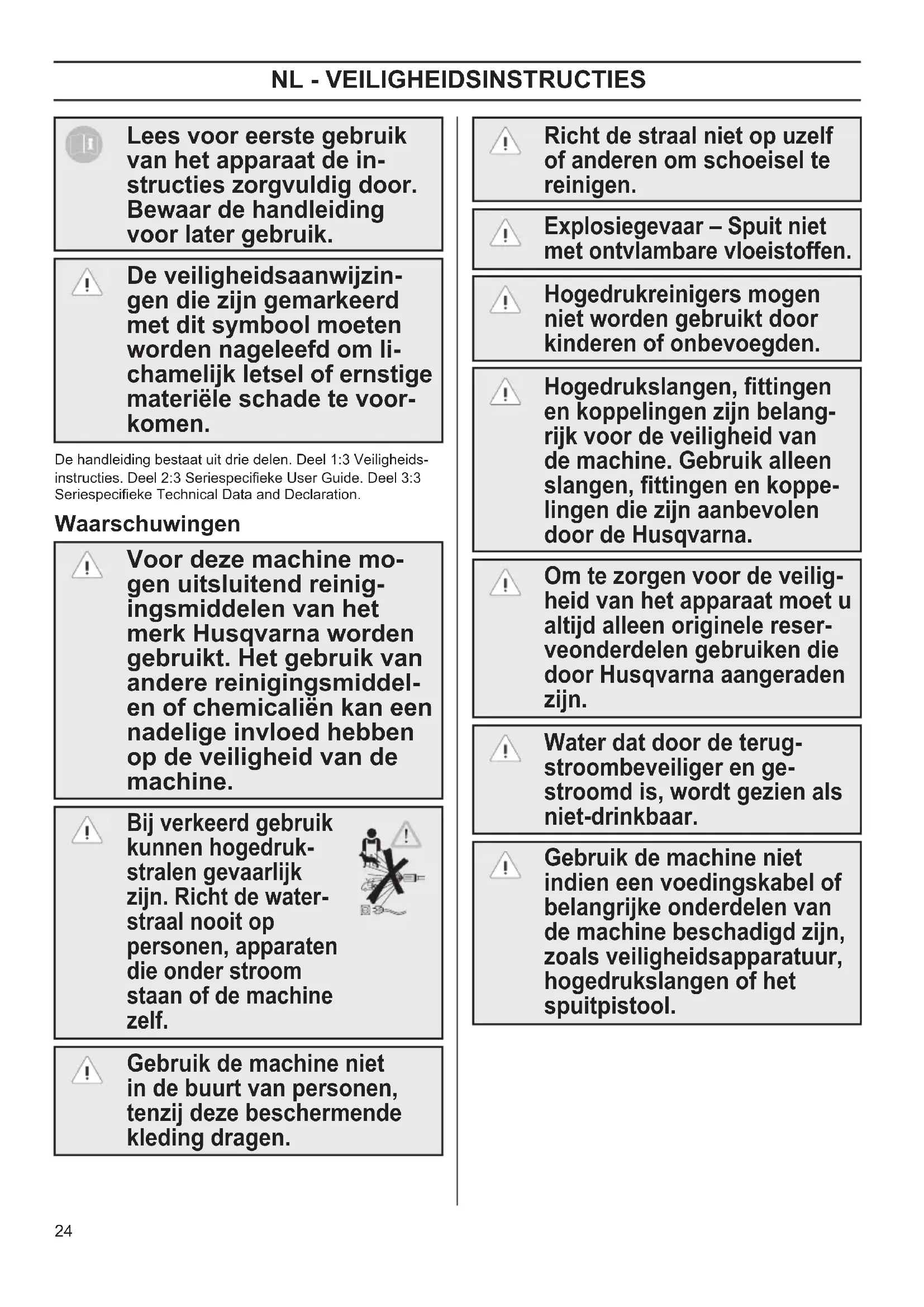 Lees voor eerste gebruik van het apparaat de in- structies zorgvuldig door. Bewaar de handleiding voor later gebruik. De veiligheidsaanwijzin- gen die zijn gemarkeerd met dit symbool moeten worden nageleefd om li- chamelijk letsel of ernstige materiële schade te voor- komen. De handleiding bestaat uit drie delen. Deel 1:3 Veiligheids- instructies. Deel 2:3 Seriespecieke User Guide. Deel 3:3 Seriespecieke Technical Data and Declaration. Waarschuwingen Voor deze machine mo- gen uitsluitend reinig- ingsmiddelen van het merk Husqvarna worden gebruikt. Het gebruik van andere reinigingsmiddel- en of chemicaliën kan een nadelige invloed hebben op de veiligheid van de machine. Bij verkeerd gebruik kunnen hogedruk- stralen gevaarlijk zijn. Richt de water- straal nooit op personen, apparaten die onder stroom staan of de machine zelf. Gebruik de machine niet in de buurt van personen, tenzij deze beschermende kleding dragen. Richt de straal niet op uzelf of anderen om schoeisel te reinigen. Explosiegevaar – Spuit niet met ontvlambare vloeistoffen. Hogedrukreinigers mogen niet worden gebruikt door kinderen of onbevoegden. Hogedrukslangen, ttingen en koppelingen zijn belang- rijk voor de veiligheid van de machine. Gebruik alleen slangen, ttingen en koppe- lingen die zijn aanbevolen door de Husqvarna. Om te zorgen voor de veilig- heid van het apparaat moet u altijd alleen originele reser- veonderdelen gebruiken die door Husqvarna aangeraden zijn. Water dat door de terug- stroombeveiliger en ge- stroomd is, wordt gezien als niet-drinkbaar. Gebruik de machine niet indien een voedingskabel of belangrijke onderdelen van de machine beschadigd zijn, zoals veiligheidsapparatuur, hogedrukslangen of het spuitpistool. OM 1-3 Safety FINAL rev 1 draft.indd 24 2017-06-14 13:59:3525