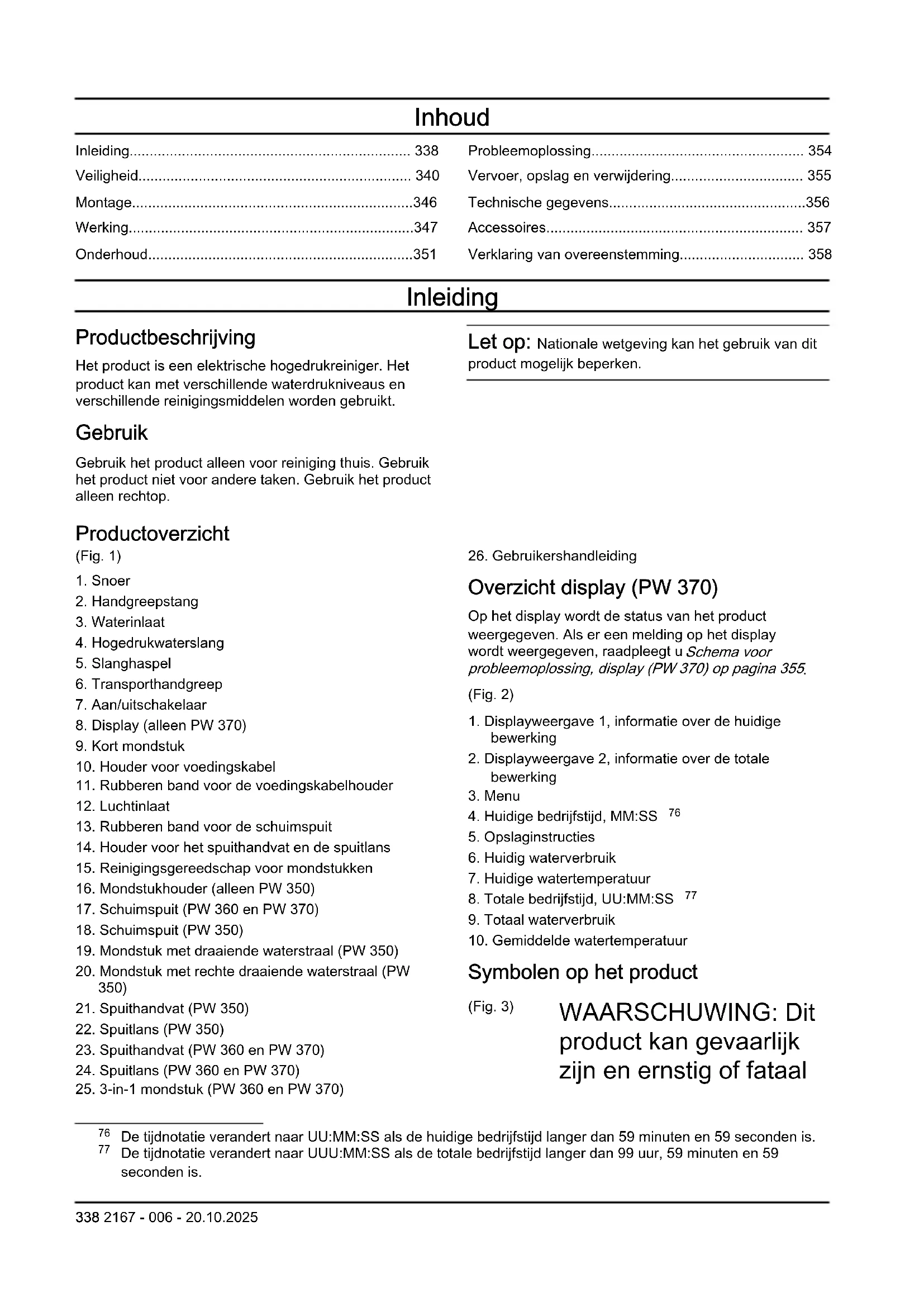 De tijdnotatie verandert naar UUU:MM:SS als de totale bedrijfstijd langer dan 99 uur, 59 minuten en 59 seconden is. 338 2167 - 006 - 20.10.2025letsel toebrengen aan de gebruiker of anderen. Wees voorzichtig en gebruik het product op de juiste manier. (Fig. 4) Lees de bedieningshandleiding goed door en zorg dat u de instructies hebt begrepen voordat u dit product gaat gebruiken. (Fig. 5) Het product is niet geschikt voor aansluiting op drinkwaterleidingen. (Fig. 6) Hogedrukwaterstralen kunnen gevaarlijk zijn bij oneigenlijk gebruik. De straal mag niet worden gericht op personen, elektrische apparatuur of het product. (Fig. 7) Milieumarkering. Het product of de verpakking ervan is geen huishoudelijk afval. Lever het in bij een erkende verwijderingslocatie voor elektrische en elektronische apparatuur. (Fig. 8) Klasse II-gereedschap. (Fig. 9) Geluidsemissie naar het omgevingslabel volgens de richtlijnen en voorschriften van de EU en het VK en de wetgeving van Nieuw- Zuid-Wales "Protection of the Environment Operations (Noise Control) Regulations 2017". Het gegarandeerde geluidsvermogensnivea u van het product staat vermeld in Technische gegevens op pagina 356 en op het label. (Fig. 10) Beschermd tegen lagedrukwaterstroom vanuit alle hoeken. (Fig. 11) Houd uit de buurt van vorst. (Fig. 12) Het product voldoet aan de geldende EG- richtlijnen. Let op: Andere symbolen/stickers op het product hebben betrekking op certificeringseisen voor bepaalde markten. Schade aan het product We zijn niet verantwoordelijk voor schade aan ons product als: