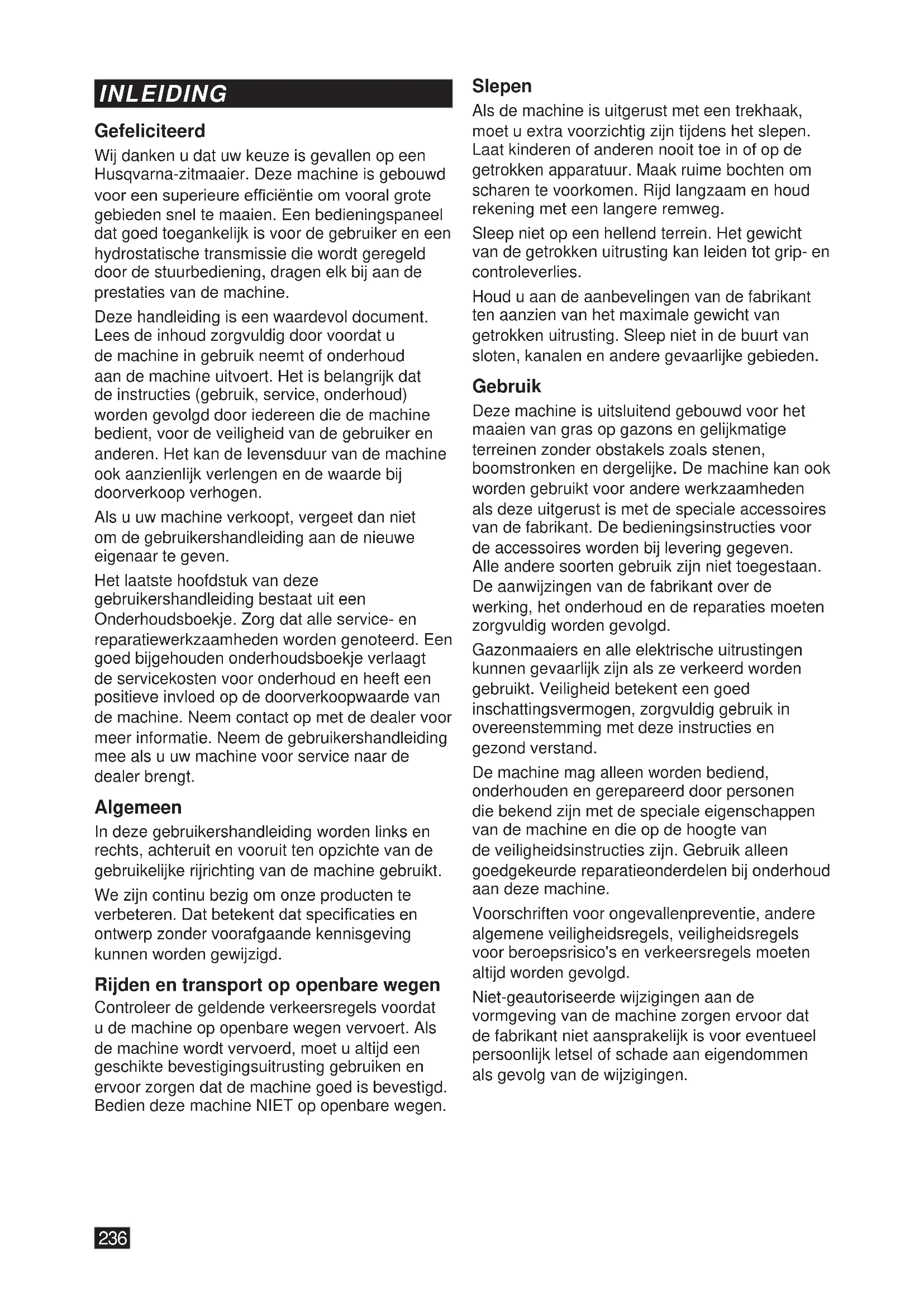 - ONDERHOUDSBOEKJE Gefeliciteerd Wij danken u dat uw keuze is gevallen op een Husqvarna-zitmaaier. Deze machine is gebouwd voor een superieure efciëntie om vooral grote gebieden snel te maaien. Een bedieningspaneel dat goed toegankelijk is voor de gebruiker en een hydrostatische transmissie die wordt geregeld door de stuurbediening, dragen elk bij aan de prestaties van de machine. Deze handleiding is een waardevol document. Lees de inhoud zorgvuldig door voordat u de machine in gebruik neemt of onderhoud aan de machine uitvoert. Het is belangrijk dat de instructies (gebruik, service, onderhoud) worden gevolgd door iedereen die de machine bedient, voor de veiligheid van de gebruiker en anderen. Het kan de levensduur van de machine ook aanzienlijk verlengen en de waarde bij doorverkoop verhogen. Als u uw machine verkoopt, vergeet dan niet om de gebruikershandleiding aan de nieuwe eigenaar te geven. Het laatste hoofdstuk van deze gebruikershandleiding bestaat uit een Onderhoudsboekje. Zorg dat alle service- en reparatiewerkzaamheden worden genoteerd. Een goed bijgehouden onderhoudsboekje verlaagt de servicekosten voor onderhoud en heeft een positieve invloed op de doorverkoopwaarde van de machine. Neem contact op met de dealer voor meer informatie. Neem de gebruikershandleiding mee als u uw machine voor service naar de dealer brengt. Algemeen In deze gebruikershandleiding worden links en rechts, achteruit en vooruit ten opzichte van de gebruikelijke rijrichting van de machine gebruikt. We zijn continu bezig om onze producten te verbeteren. Dat betekent dat specicaties en ontwerp zonder voorafgaande kennisgeving kunnen worden gewijzigd. Rijden en transport op openbare wegen Controleer de geldende verkeersregels voordat u de machine op openbare wegen vervoert. Als de machine wordt vervoerd, moet u altijd een geschikte bevestigingsuitrusting gebruiken en ervoor zorgen dat de machine goed is bevestigd. Bedien deze machine NIET op openbare wegen. Slepen Als de machine is uitgerust met een trekhaak, moet u extra voorzichtig zijn tijdens het slepen. Laat kinderen of anderen nooit toe in of op de getrokken apparatuur. Maak ruime bochten om scharen te voorkomen. Rijd langzaam en houd rekening met een langere remweg. Sleep niet op een hellend terrein. Het gewicht van de getrokken uitrusting kan leiden tot grip- en controleverlies. Houd u aan de aanbevelingen van de fabrikant ten aanzien van het maximale gewicht van getrokken uitrusting. Sleep niet in de buurt van sloten, kanalen en andere gevaarlijke gebieden. Gebruik Deze machine is uitsluitend gebouwd voor het maaien van gras op gazons en gelijkmatige terreinen zonder obstakels zoals stenen, boomstronken en dergelijke. De machine kan ook worden gebruikt voor andere werkzaamheden als deze uitgerust is met de speciale accessoires van de fabrikant. De bedieningsinstructies voor de accessoires worden bij levering gegeven. Alle andere soorten gebruik zijn niet toegestaan. De aanwijzingen van de fabrikant over de werking, het onderhoud en de reparaties moeten zorgvuldig worden gevolgd. Gazonmaaiers en alle elektrische uitrustingen kunnen gevaarlijk zijn als ze verkeerd worden gebruikt. Veiligheid betekent een goed inschattingsvermogen, zorgvuldig gebruik in overeenstemming met deze instructies en gezond verstand. De machine mag alleen worden bediend, onderhouden en gerepareerd door personen die bekend zijn met de speciale eigenschappen van de machine en die op de hoogte van de veiligheidsinstructies zijn. Gebruik alleen goedgekeurde reparatieonderdelen bij onderhoud aan deze machine. Voorschriften voor ongevallenpreventie, andere algemene veiligheidsregels, veiligheidsregels voor beroepsrisico's en verkeersregels moeten altijd worden gevolgd. Niet-geautoriseerde wijzigingen aan de vormgeving van de machine zorgen ervoor dat de fabrikant niet aansprakelijk is voor eventueel persoonlijk letsel of schade aan eigendommen als gevolg van de wijzigingen. p. 273