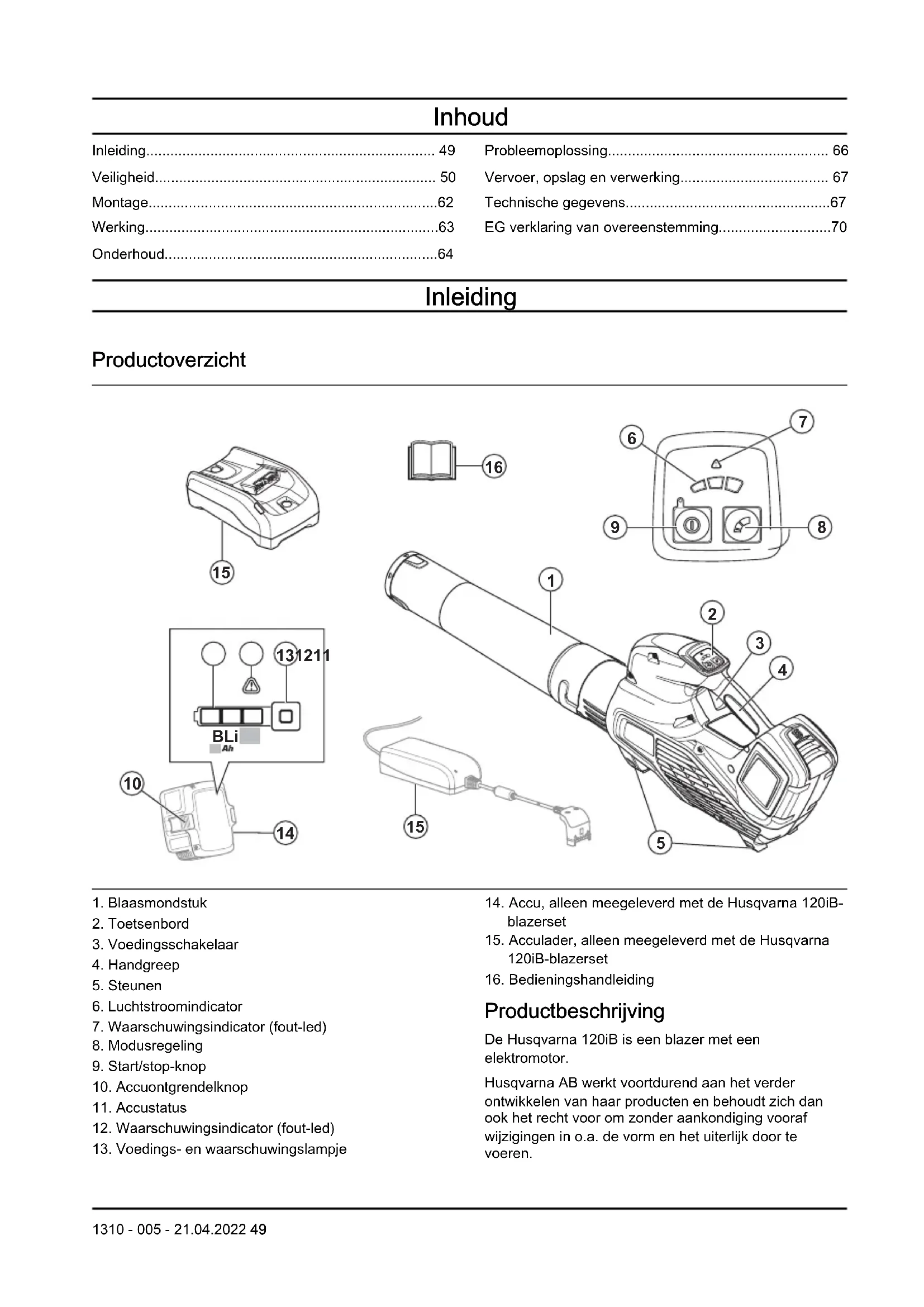 van het product. 62 1310 - 005 - 21.04.20222. Duw het blaasmondstuk helemaal op zijn plek en draai het blaasmondstuk om het aan het product te vergrendelen. Werking Inleiding WAARSCHUWING: Zorg dat u het hoofdstuk over veiligheid hebt gelezen en begrepen voordat u het product gebruikt. De werking controleren voordat u het product gebruikt