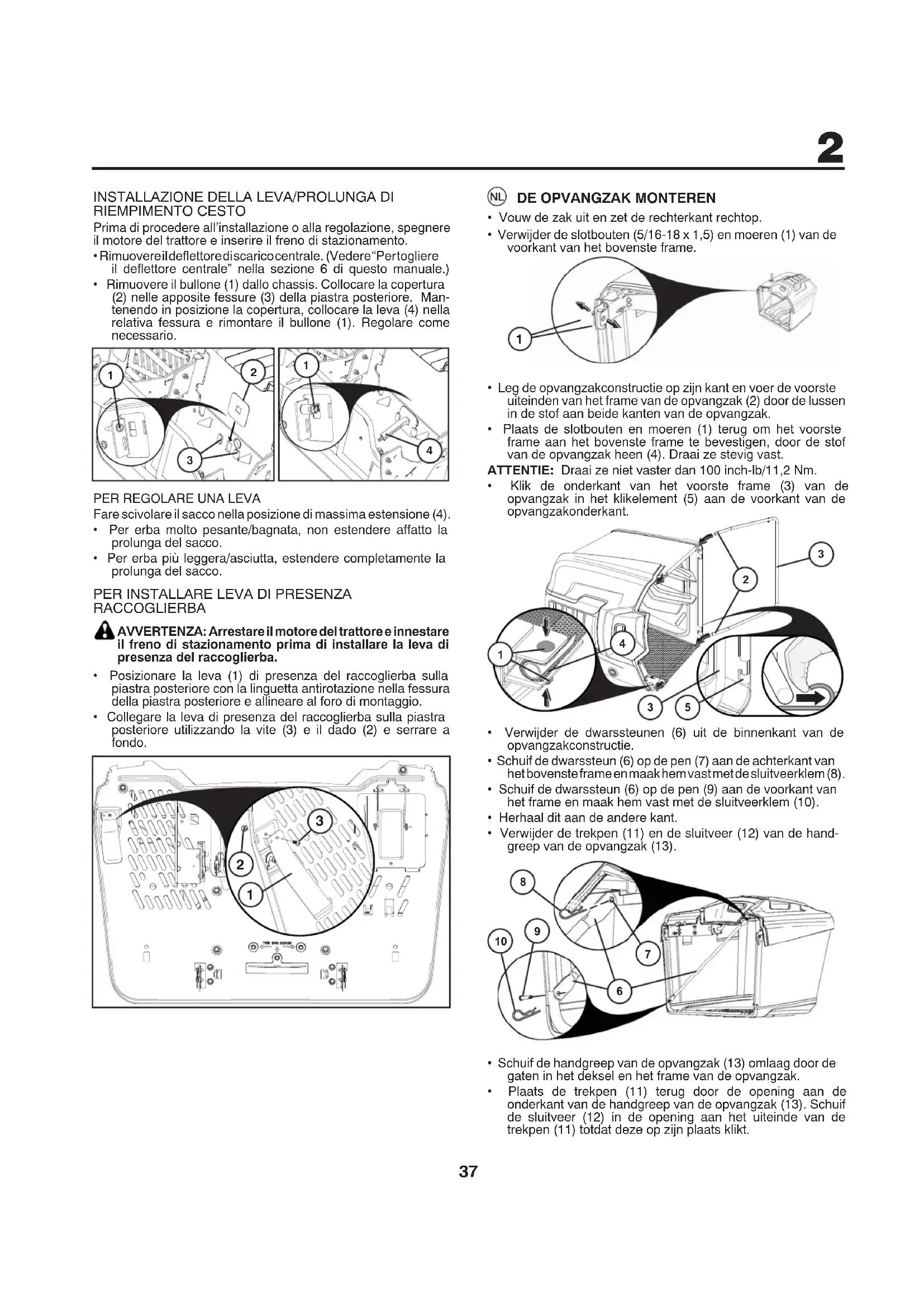 - Stop de motor en schakel de aandrijving naar het hulpstuk uit, - Voordat u tankt; - voordat u de opvangzak verwijdert; - voordat u de hoogte verstelt tenzij de hoogte vanuit de bestuurdersplaats kan worden ingesteld.