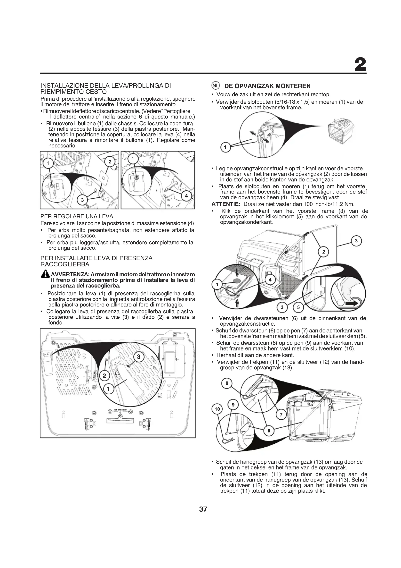WAARSCHUWING: Schakel de motor van de trekker uit en schakel de parkeerrem in voordat u de hendel van de opvangzak gaat monteren.
