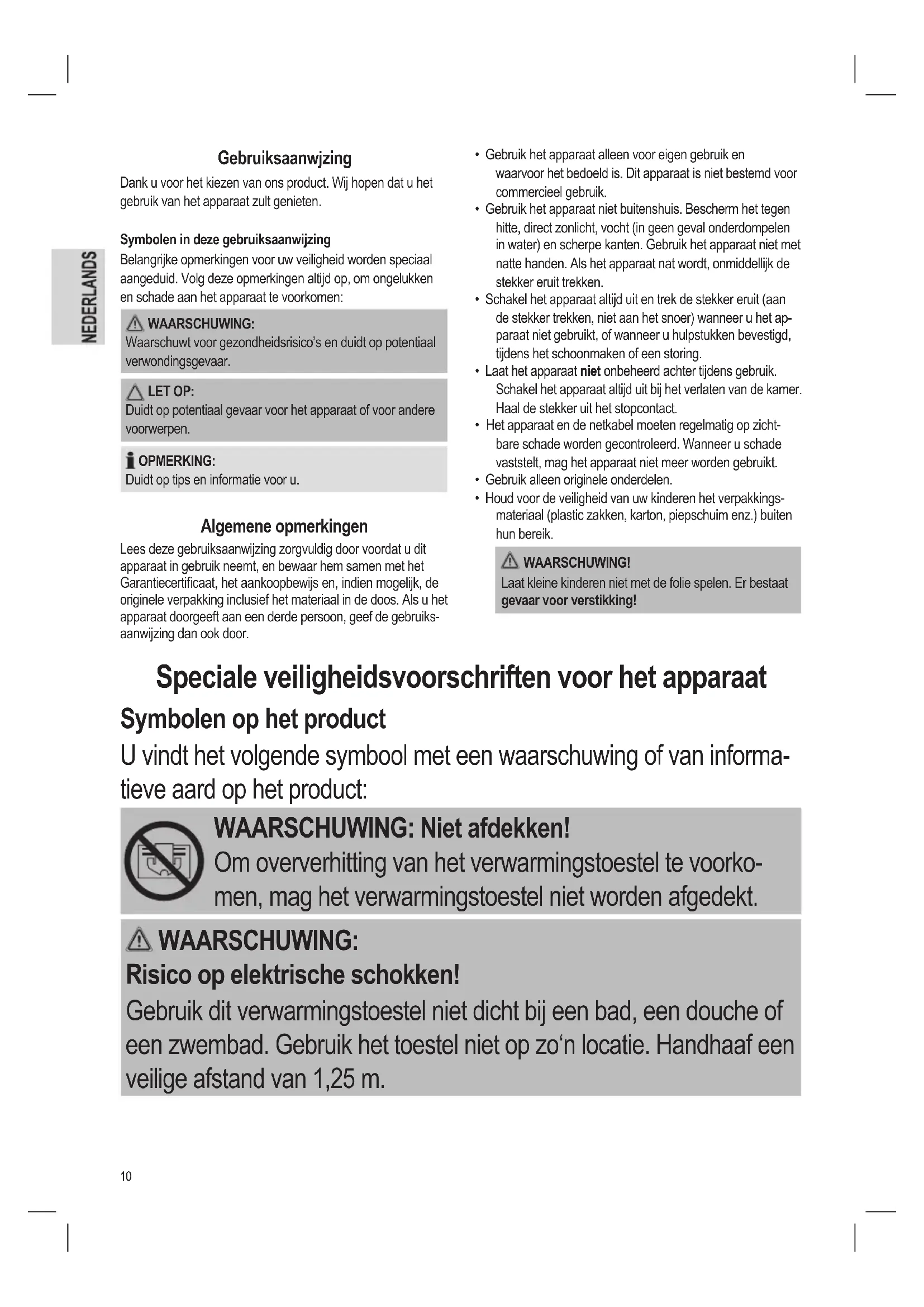 - Houd voor de veiligheid van uw kinderen het verpakkings- materiaal (plastic zakken, karton, piepschuim enz.) buiten hun bereik. WAARSCHUWING! Laat kleine kinderen niet met de folie spelen. Er bestaat gevaar voor verstikking! Gebruiksaanwjzing Dank u voor het kiezen van ons product. Wij hopen dat u het gebruik van het apparaat zult genieten. Symbolen in deze gebruiksaanwijzing Belangrijke opmerkingen voor uw veiligheid worden speciaal aangeduid. Volg deze opmerkingen altijd op, om ongelukken en schade aan het apparaat te voorkomen: WAARSCHUWING: Waarschuwt voor gezondheidsrisico’s en duidt op potentiaal verwondingsgevaar. LET OP: Duidt op potentiaal gevaar voor het apparaat of voor andere voorwerpen. OPMERKING: Duidt op tips en informatie voor u. Algemene opmerkingen Lees deze gebruiksaanwijzing zorgvuldig door voordat u dit apparaat in gebruik neemt, en bewaar hem samen met het Garantiecerticaat, het aankoopbewijs en, indien mogelijk, de originele verpakking inclusief het materiaal in de doos. Als u het apparaat doorgeeft aan een derde persoon, geef de gebruiks- aanwijzing dan ook door. Speciale veiligheidsvoorschriften voor het apparaat Symbolen op het product U vindt het volgende symbool met een waarschuwing of van informa- tieve aard op het product: WAARSCHUWING: Niet afdekken! Om oververhitting van het verwarmingstoestel te voorko- men, mag het verwarmingstoestel niet worden afgedekt. WAARSCHUWING: Risico op elektrische schokken! Gebruik dit verwarmingstoestel niet dicht bij een bad, een douche of een zwembad. Gebruik het toestel niet op zo‘n locatie. Handhaaf een veilige afstand van 1,25 m.11 WAARSCHUWING: Gevaar voor brandwonden