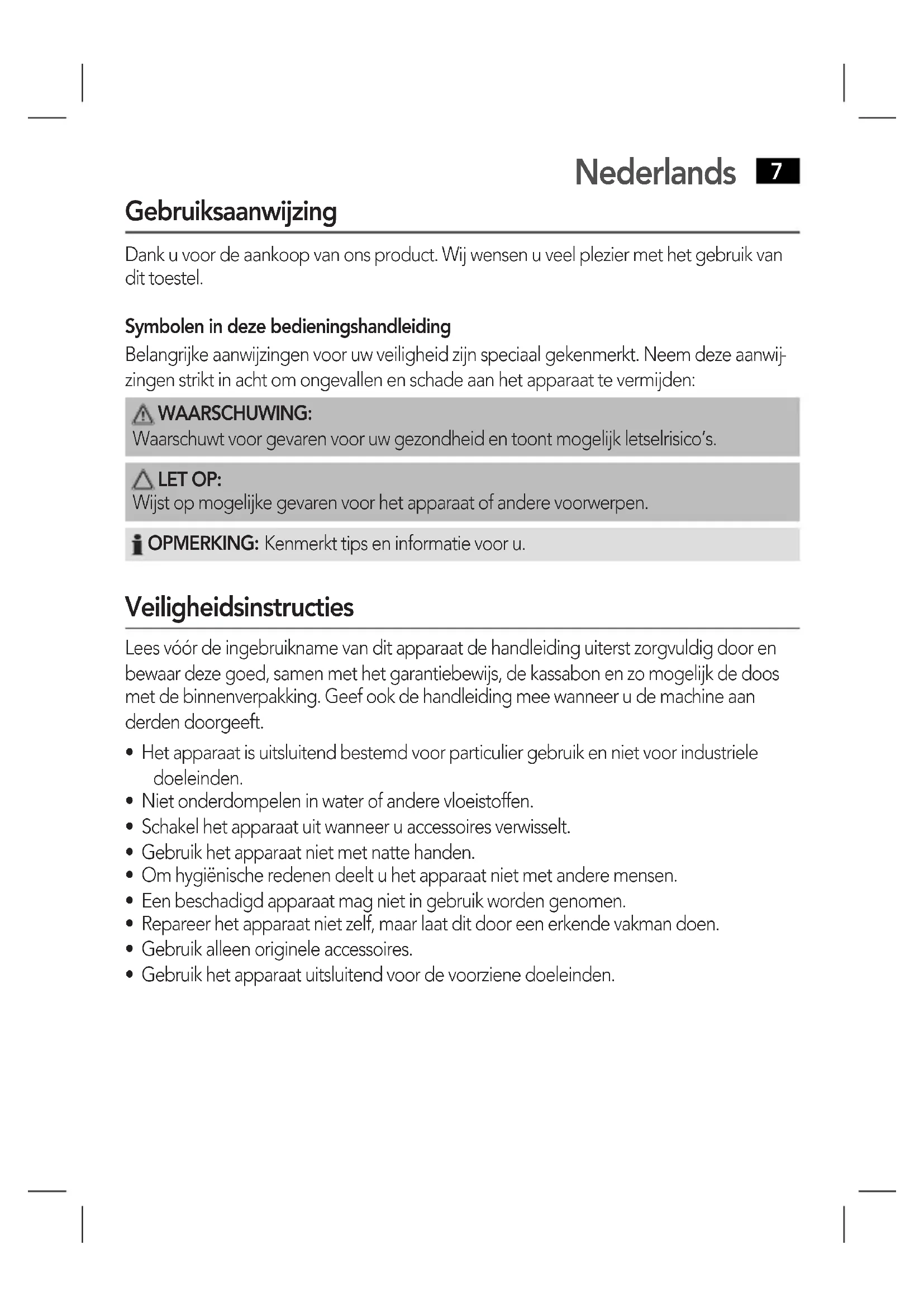 - Gebruik het apparaat uitsluitend voor de voorziene doeleinden.Nederlands