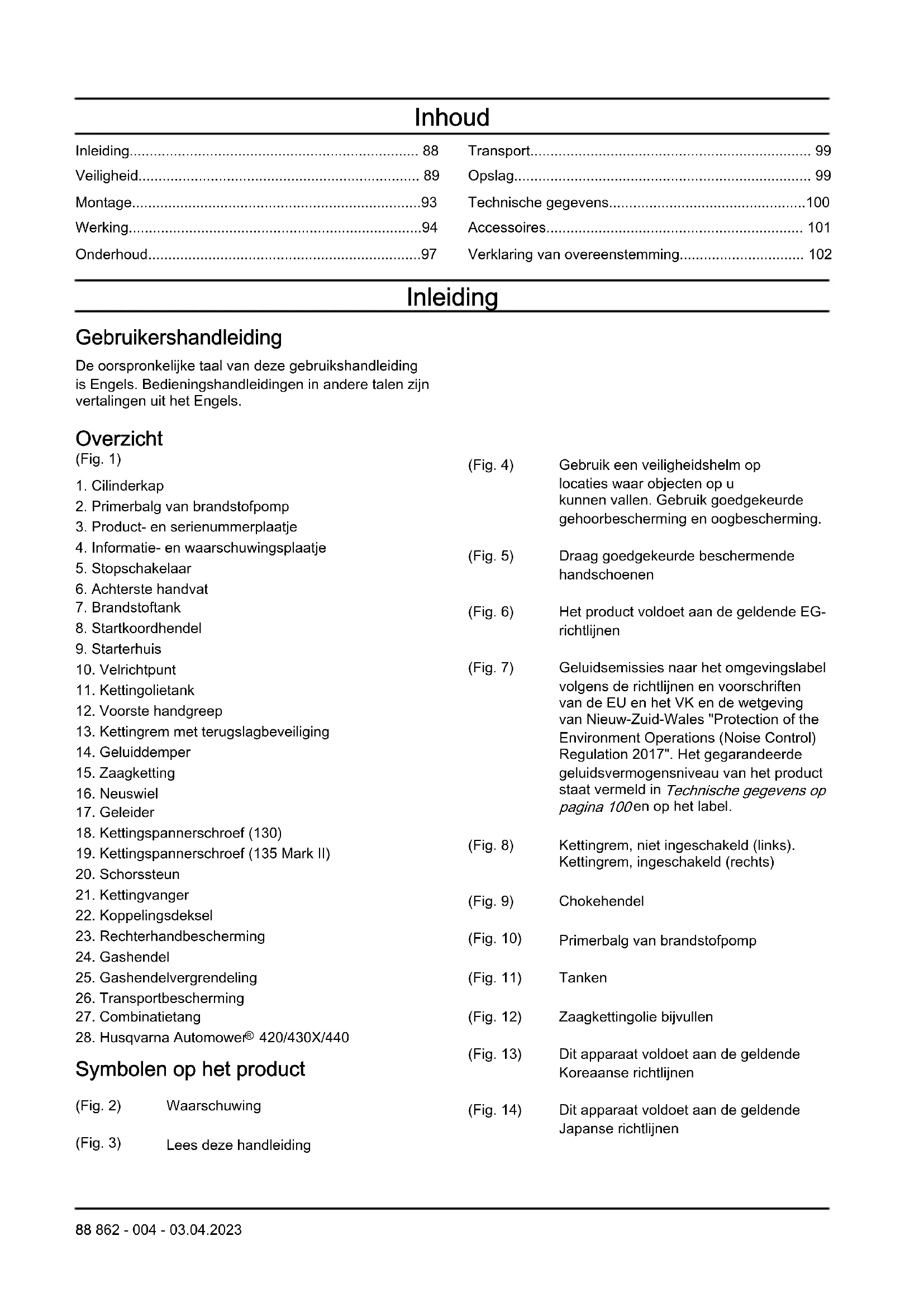 420/430X/440 Symbolen op het product (Fig. 2) Waarschuwing (Fig. 3) Lees deze handleiding (Fig. 4) Gebruik een veiligheidshelm op locaties waar objecten op u kunnen vallen. Gebruik goedgekeurde gehoorbescherming en oogbescherming. (Fig. 5) Draag goedgekeurde beschermende handschoenen (Fig. 6) Het product voldoet aan de geldende EG- richtlijnen (Fig. 7) Geluidsemissies naar het omgevingslabel volgens de richtlijnen en voorschriften van de EU en het VK en de wetgeving van Nieuw-Zuid-Wales "Protection of the Environment Operations (Noise Control) Regulation 2017". Het gegarandeerde geluidsvermogensniveau van het product staat vermeld in Technische gegevens op pagina 100 en op het label. (Fig. 8) Kettingrem, niet ingeschakeld (links). Kettingrem, ingeschakeld (rechts) (Fig. 9) Chokehendel (Fig. 10) Primerbalg van brandstofpomp (Fig. 11) Tanken (Fig. 12) Zaagkettingolie bijvullen (Fig. 13) Dit apparaat voldoet aan de geldende Koreaanse richtlijnen (Fig. 14) Dit apparaat voldoet aan de geldende Japanse richtlijnen 88 862 - 004 - 03.04.2023(Fig. 15) Houd het product op de juiste wijze met beide handen vast (Fig. 16) Niet gebruiken met slechts één hand (Fig. 17) Laat de punt van het zaagblad geen objecten raken. (Fig. 18) Dit product voldoet aan de geldende VK- regelgeving. Let op: Andere symbolen/stickers op het product hebben betrekking op certificeringseisen voor overige commerciële markten. California Proposition 65 WARNING! The engine exhaust from this product contains chemicals known to the State of California to cause cancer, birth defects or other reproductive harm. Euro V-emissies WAARSCHUWING: De EU- typegoedkeuring van dit product vervalt als ongeoorloofde wijzigingen aan de motor aangebracht worden. Productaansprakelijkheid Zoals uiteengezet in de wet voor productaansprakelijkheid zijn wij niet aansprakelijk voor schade die door ons product wordt veroorzaakt, indien: