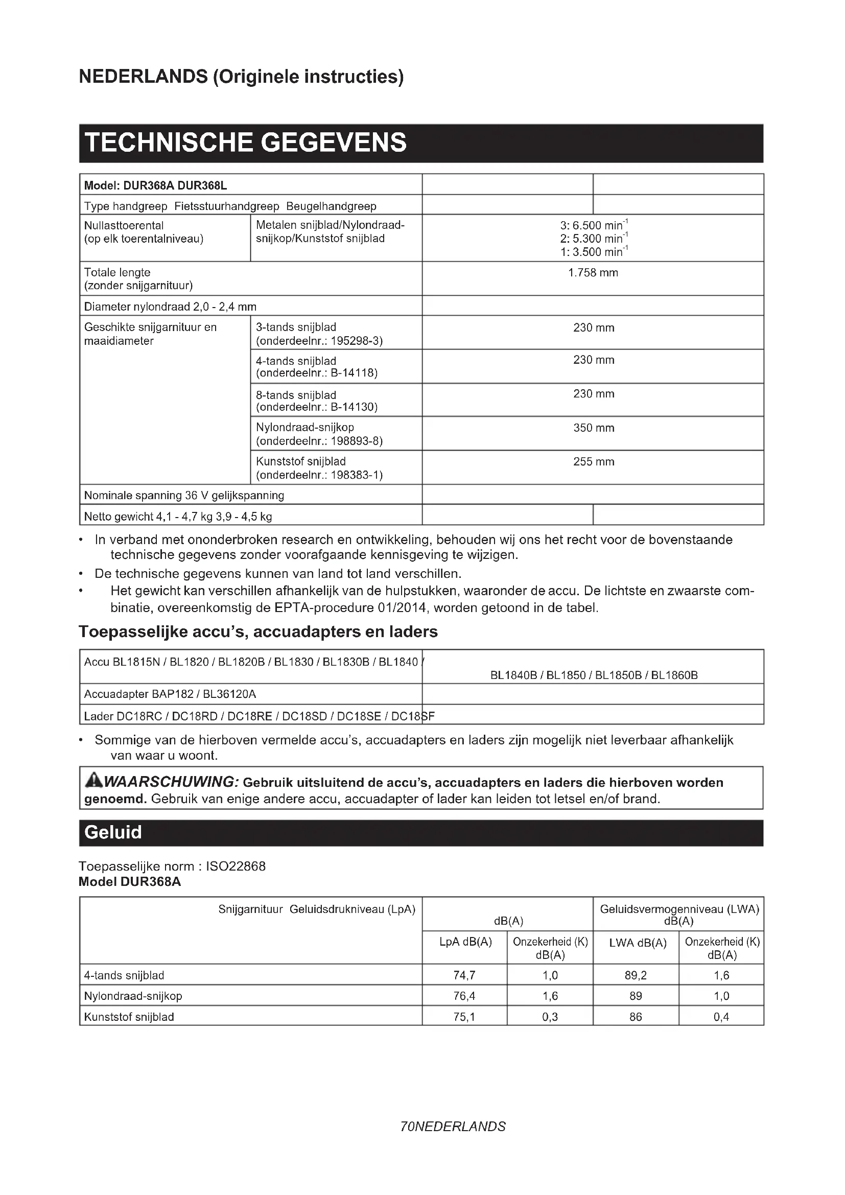 - Sommigevandehierbovenvermeldeaccu’s,accuadaptersenladerszijnmogelijknietleverbaarafhankelijk van waar u woont. WAARSCHUWING: Gebruik uitsluitend de accu’s, accuadapters en laders die hierboven worden genoemd.Gebruikvanenigeandereaccu,accuadapterofladerkanleidentotletselen/ofbrand. Geluid Toepasselijkenorm:ISO22868 Model DUR368A Snijgarnituur Geluidsdrukniveau (LpA)dB(A)Geluidsvermogenniveau(LWA)dB(A)LpA dB(A)Onzekerheid (K)dB(A)LWAdB(A)Onzekerheid (K)dB(A) 4-tandssnijblad 74,7 1,0 89,2 1,6 Nylondraad-snijkop 76,4 1,6 89 1,0 Kunststofsnijblad 75,1 0,3 86 0,471 NEDERLANDS Model DUR368L Snijgarnituur Geluidsdrukniveau (LpA) dB(A) Geluidsvermogenniveau(LWA) dB(A) LpA dB(A) Onzekerheid (K) dB(A) LWAdB(A) Onzekerheid (K) dB(A) 4-tandssnijblad 74,7 1,0 89,2 1,6 Nylondraad-snijkop 76,4 1,6 89 1,0 Kunststofsnijblad 75,1 0,3 86 0,4