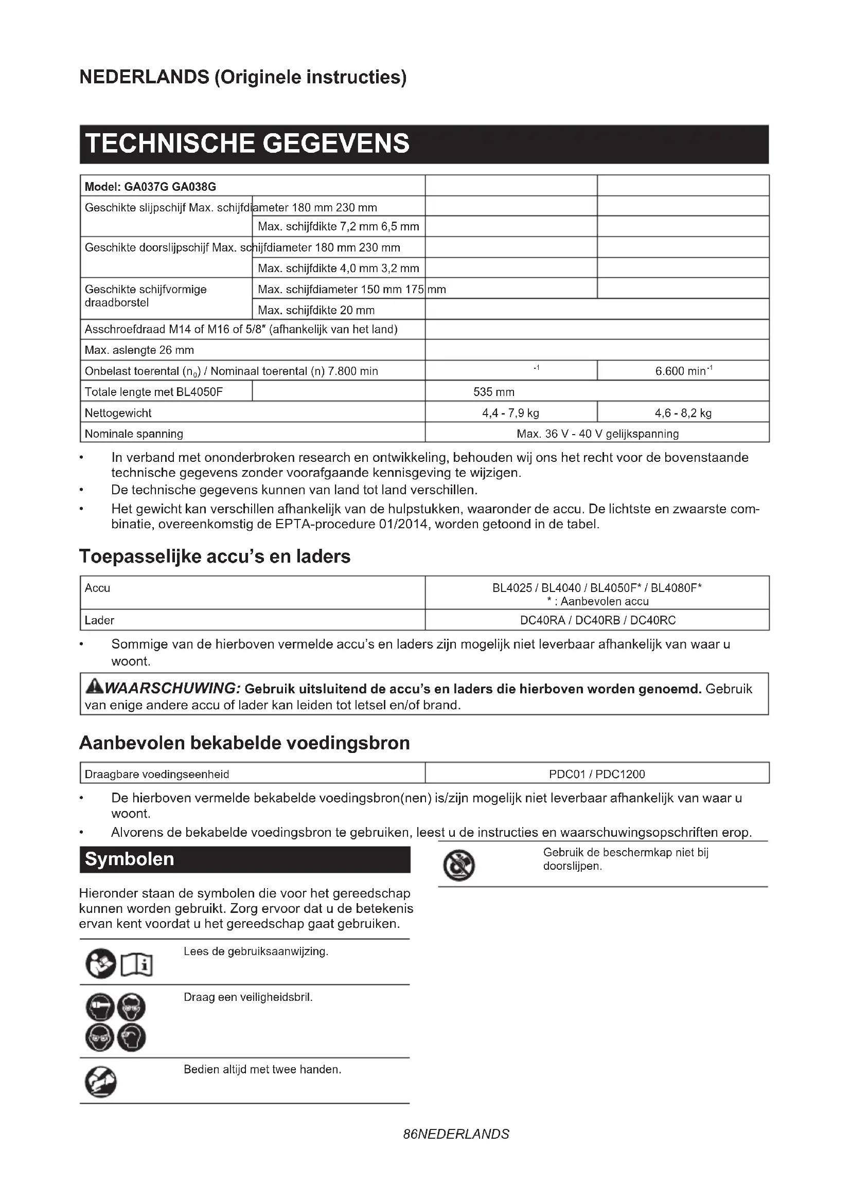 - Alvorens de bekabelde voedingsbron te gebruiken, leest u de instructies en waarschuwingsopschriften erop. Symbolen Hieronder staan de symbolen die voor het gereedschap kunnen worden gebruikt. Zorg ervoor dat u de betekenis ervan kent voordat u het gereedschap gaat gebruiken. Lees de gebruiksaanwijzing. Draag een veiligheidsbril. Bedien altijd met twee handen. Gebruik de beschermkap niet bij doorslijpen.87 NEDERLANDS Ni-MH Li-ion Alleen voor EU-landen Als gevolg van de aanwezigheid van schadelijke componenten in het apparaat, kunnen oude elektrische en elektronische apparaten, accu‘s en batterijen negatieve gevolgen hebben voor het milieu en de gezondheid van mensen. Gooi elektrische en elektronische appara- ten en accu‘s niet met het huisvuil weg! In overeenstemming met de Europese richtlijn inzake oude elektrische en elektronische apparaten en inzake accu‘s en batterijen en oude accu‘s en batterijen, alsmede de toepas- sing daarvan binnen de nationale wetgeving, dienen oude elektrische apparaten, accu‘s en batterijen gescheiden te worden opgeslagen en te worden ingeleverd bij een apart inzame- lingspunt voor huishoudelijk afval dat de mili- eubeschermingsvoorschriften in acht neemt. Dit wordt op het apparaat aangegeven door het symbool van een doorgekruiste afvalcontainer. Gebruiksdoeleinden Het gereedschap is bedoeld voor het slijpen, schuren, draadborstelen, gaten slijpen en doorslijpen van metaal en steen zonder gebruik van water. Geluidsniveau De typische, A-gewogen geluidsniveaus zijn gemeten volgens EN62841-2-3: Model Geluidsdrukniveau
