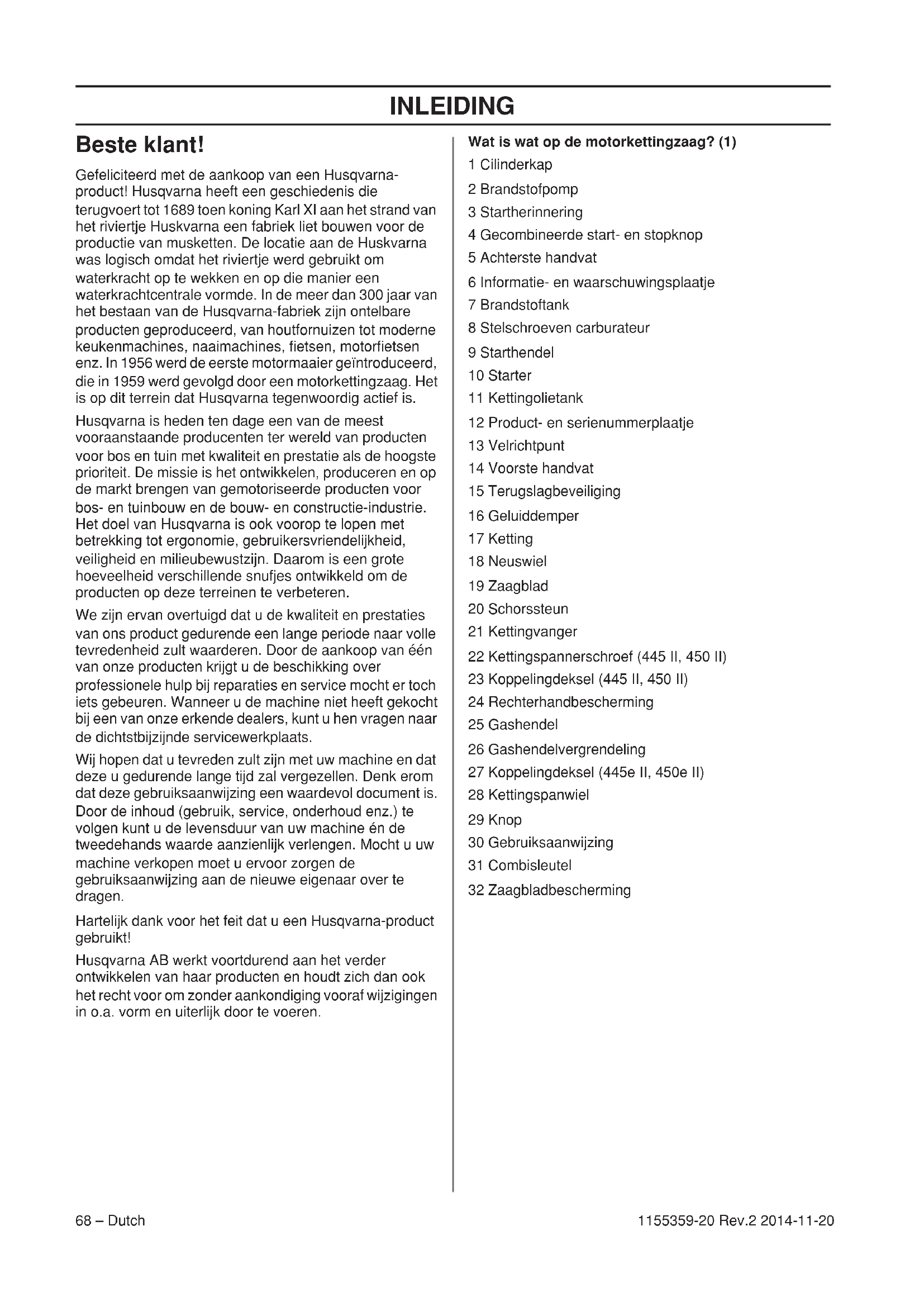 - EG-verklaring van overeenstemming INLEIDING 68 – Dutch 1155359-20 Rev.2 2014-11-20 Beste klant! Gefeliciteerd met de aankoop van een Husqvarna- product! Husqvarna heeft een geschiedenis die terugvoert tot 1689 toen koning Karl XI aan het strand van het riviertje Huskvarna een fabriek liet bouwen voor de productie van musketten. De locatie aan de Huskvarna was logisch omdat het riviertje werd gebruikt om waterkracht op te wekken en op die manier een waterkrachtcentrale vormde. In de meer dan 300 jaar van het bestaan van de Husqvarna-fabriek zijn ontelbare producten geproduceerd, van houtfornuizen tot moderne keukenmachines, naaimachines, fietsen, motorfietsen enz. In 1956 werd de eerste motormaaier geïntroduceerd, die in 1959 werd gevolgd door een motorkettingzaag. Het is op dit terrein dat Husqvarna tegenwoordig actief is. Husqvarna is heden ten dage een van de meest vooraanstaande producenten ter wereld van producten voor bos en tuin met kwaliteit en prestatie als de hoogste prioriteit. De missie is het ontwikkelen, produceren en op de markt brengen van gemotoriseerde producten voor bos- en tuinbouw en de bouw- en constructie-industrie. Het doel van Husqvarna is ook voorop te lopen met betrekking tot ergonomie, gebruikersvriendelijkheid, veiligheid en milieubewustzijn. Daarom is een grote hoeveelheid verschillende snufjes ontwikkeld om de producten op deze terreinen te verbeteren. We zijn ervan overtuigd dat u de kwaliteit en prestaties van ons product gedurende een lange periode naar volle tevredenheid zult waarderen. Door de aankoop van één van onze producten krijgt u de beschikking over professionele hulp bij reparaties en service mocht er toch iets gebeuren. Wanneer u de machine niet heeft gekocht bij een van onze erkende dealers, kunt u hen vragen naar de dichtstbijzijnde servicewerkplaats. Wij hopen dat u tevreden zult zijn met uw machine en dat deze u gedurende lange tijd zal vergezellen. Denk erom dat deze gebruiksaanwijzing een waardevol document is. Door de inhoud (gebruik, service, onderhoud enz.) te volgen kunt u de levensduur van uw machine én de tweedehands waarde aanzienlijk verlengen. Mocht u uw machine verkopen moet u ervoor zorgen de gebruiksaanwijzing aan de nieuwe eigenaar over te dragen. Hartelijk dank voor het feit dat u een Husqvarna-product gebruikt! Husqvarna AB werkt voortdurend aan het verder ontwikkelen van haar producten en houdt zich dan ook het recht voor om zonder aankondiging vooraf wijzigingen in o.a. vorm en uiterlijk door te voeren. Wat is wat op de motorkettingzaag? (1) 1 Cilinderkap 2 Brandstofpomp 3 Startherinnering 4 Gecombineerde start- en stopknop 5 Achterste handvat 6 Informatie- en waarschuwingsplaatje 7 Brandstoftank 8 Stelschroeven carburateur 9 Starthendel 10 Starter 11 Kettingolietank 12 Product- en serienummerplaatje 13 Velrichtpunt 14 Voorste handvat 15 Terugslagbeveiliging 16 Geluiddemper 17 Ketting 18 Neuswiel 19 Zaagblad 20 Schorssteun 21 Kettingvanger 22 Kettingspannerschroef (445 II, 450 II) 23 Koppelingdeksel (445 II, 450 II) 24 Rechterhandbescherming 25 Gashendel 26 Gashendelvergrendeling 27 Koppelingdeksel (445e II, 450e II) 28 Kettingspanwiel 29 Knop 30 Gebruiksaanwijzing 31 Combisleutel 32 ZaagbladbeschermingALGEMENE VEILIGHEIDSINSTRUCTIES Dutch – 69 1155359-20 Rev.2 2014-11-20 Maatregelen voor gebruik van een nieuwe motorkettingzaag p. 94