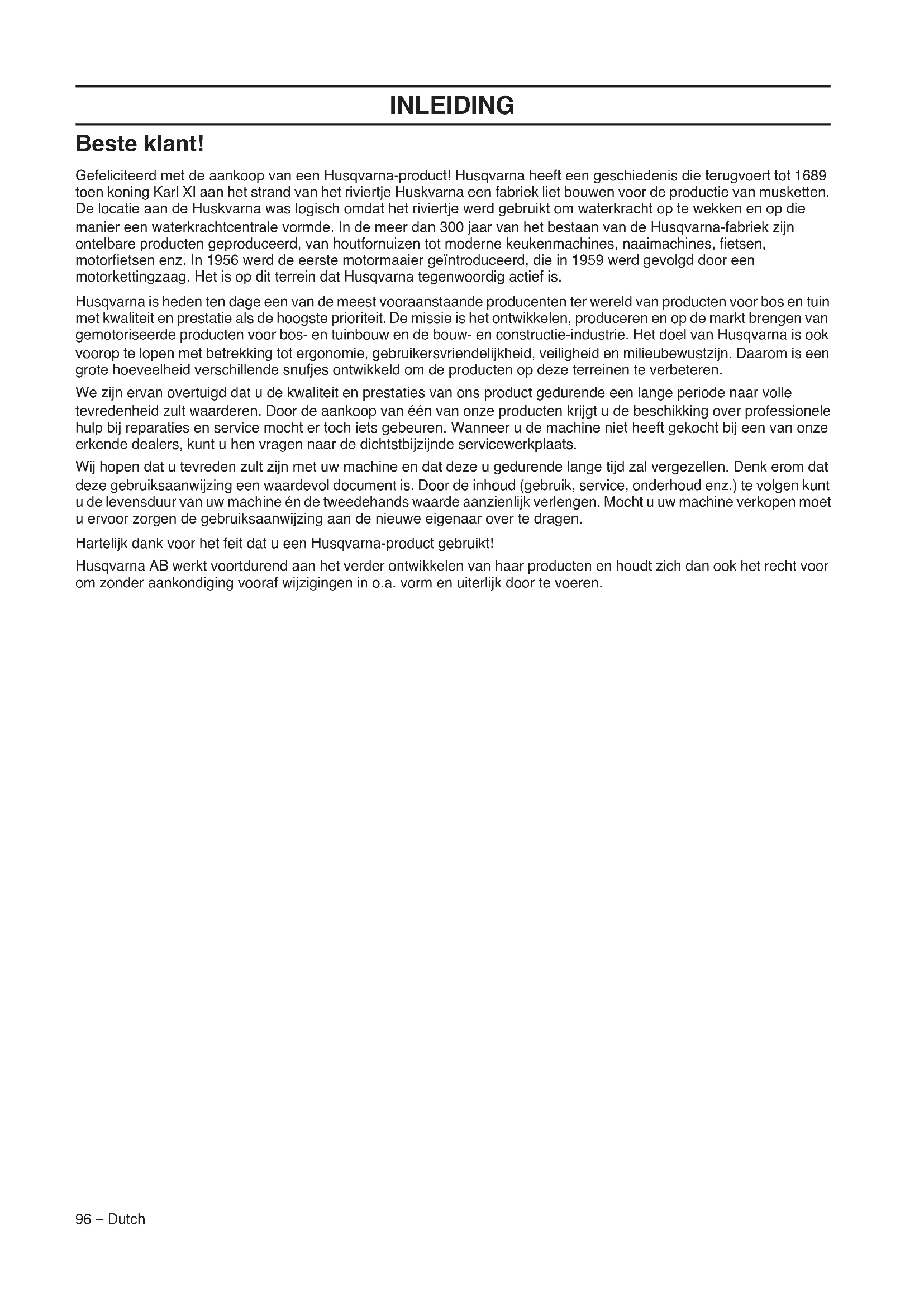 - EG-verklaring van overeenstemming 6 – Dutch INLEIDING Beste klant! Gefeliciteerd met de aankoop van een Husqvarna-product! Husqvarna heeft een geschiedenis die terugvoert tot 1689 toen koning Karl XI aan het strand van het riviertje Huskvarna een fabriek liet bouwen voor de productie van musketten. De locatie aan de Huskvarna was logisch omdat het riviertje werd gebruikt om waterkracht op te wekken en op die manier een waterkrachtcentrale vormde. In de meer dan 300 jaar van het bestaan van de Husqvarna-fabriek zijn ontelbare producten geproduceerd, van houtfornuizen tot moderne keukenmachines, naaimachines, fietsen, motorfietsen enz. In 1956 werd de eerste motormaaier geïntroduceerd, die in 1959 werd gevolgd door een motorkettingzaag. Het is op dit terrein dat Husqvarna tegenwoordig actief is. Husqvarna is heden ten dage een van de meest vooraanstaande producenten ter wereld van producten voor bos en tuin met kwaliteit en prestatie als de hoogste prioriteit. De missie is het ontwikkelen, produceren en op de markt brengen van gemotoriseerde producten voor bos- en tuinbouw en de bouw- en constructie-industrie. Het doel van Husqvarna is ook voorop te lopen met betrekking tot ergonomie, gebruikersvriendelijkheid, veiligheid en milieubewustzijn. Daarom is een grote hoeveelheid verschillende snufjes ontwikkeld om de producten op deze terreinen te verbeteren. We zijn ervan overtuigd dat u de kwaliteit en prestaties van ons product gedurende een lange periode naar volle tevredenheid zult waarderen. Door de aankoop van één van onze producten krijgt u de beschikking over professionele hulp bij reparaties en service mocht er toch iets gebeuren. Wanneer u de machine niet heeft gekocht bij een van onze erkende dealers, kunt u hen vragen naar de dichtstbijzijnde servicewerkplaats. Wij hopen dat u tevreden zult zijn met uw machine en dat deze u gedurende lange tijd zal vergezellen. Denk erom dat deze gebruiksaanwijzing een waardevol document is. Door de inhoud (gebruik, service, onderhoud enz.) te volgen kunt u de levensduur van uw machine én de tweedehands waarde aanzienlijk verlengen. Mocht u uw machine verkopen moet u ervoor zorgen de gebruiksaanwijzing aan de nieuwe eigenaar over te dragen. Hartelijk dank voor het feit dat u een Husqvarna-product gebruikt! Husqvarna AB werkt voortdurend aan het verder ontwikkelen van haar producten en houdt zich dan ook het recht voor om zonder aankondiging vooraf wijzigingen in o.a. vorm en uiterlijk door te voeren.Dutch – 97 WAT IS WAT? Wat is wat op de motorkettingzaag? 1 Cilinderkap 2 Brandstofpomp 3 Gashendelvergrendeling 4 Achterste handvat 5 Informatie- en waarschuwingsplaatje 6 Gecombineerde start- en stopknop 7 Kijkglas brandstofpeil 8 Brandstoftank 9 Starthendel 10 Starter 11 Kettingolietank 12 Neuswiel 13 Zaagblad 14 Ketting 15 Geluiddemper 16 Kettingrem met terugslagbeveiliging 17 Voorste handvat 18 Decompressieklep 19 Schakelaar voor handvatverwarming (550XPG, 550XPG TrioBrake) 20 Rechterhandrem (545 TrioBrake, 550XP TrioBrake, 550XPG TrioBrake) 21 Rechterhandbescherming 22 Gashendel 23 Product- en serienummerplaatje 24 Schroef voor instellen van oliepomp 25 Koppelingdeksel 26 Kettingvanger 27 Schorssteun 28 Zaagbladbescherming 29 Gebruiksaanwijzing 30 CombisleutelALGEMENE VEILIGHEIDSINSTRUCTIES 98 – Dutch Maatregelen voor gebruik van een nieuwe motorkettingzaag p. 1369