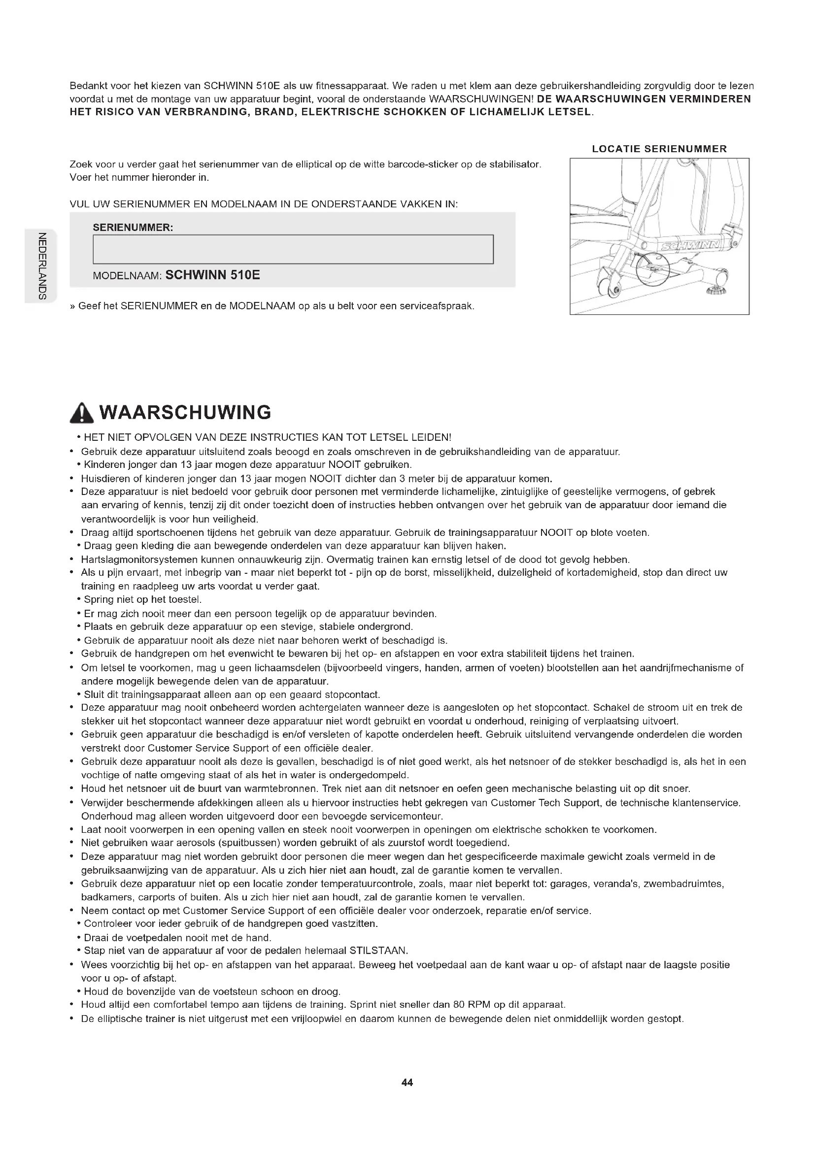 - De elliptische trainer is niet uitgerust met een vrijloopwiel en daarom kunnen de bewegende delen niet onmiddellijk worden gestopt. Bedankt voor het kiezen van SCHWINN 510E als uw fitnessapparaat. We raden u met klem aan deze gebruikershandleiding zorgvuldig door te lezen voordat u met de montage van uw apparatuur begint, vooral de onderstaande WAARSCHUWINGEN! DE WAARSCHUWINGEN VERMINDEREN HET RISICO VAN VERBRANDING, BRAND, ELEKTRISCHE SCHOKKEN OF LICHAMELIJK LETSEL. Zoek voor u verder gaat het serienummer van de elliptical op de witte barcode-sticker op de stabilisator. Voer het nummer hieronder in. VUL UW SERIENUMMER EN MODELNAAM IN DE ONDERSTAANDE VAKKEN IN: